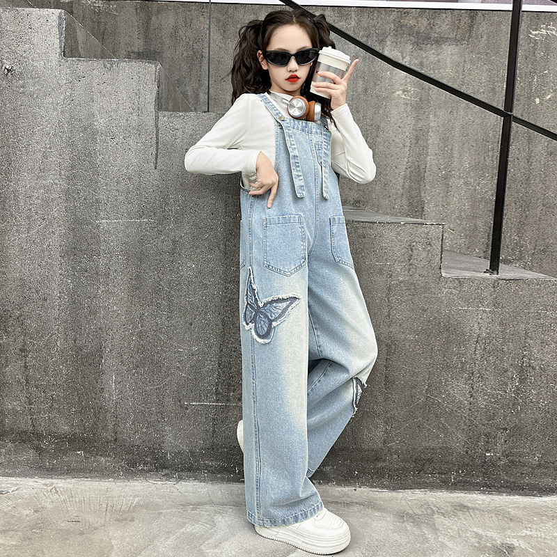 소녀의 봄과 가을 청바지 2025 새로운 패션 소녀 한국 스타일 세련된 패딩 데님 스트랩 바지