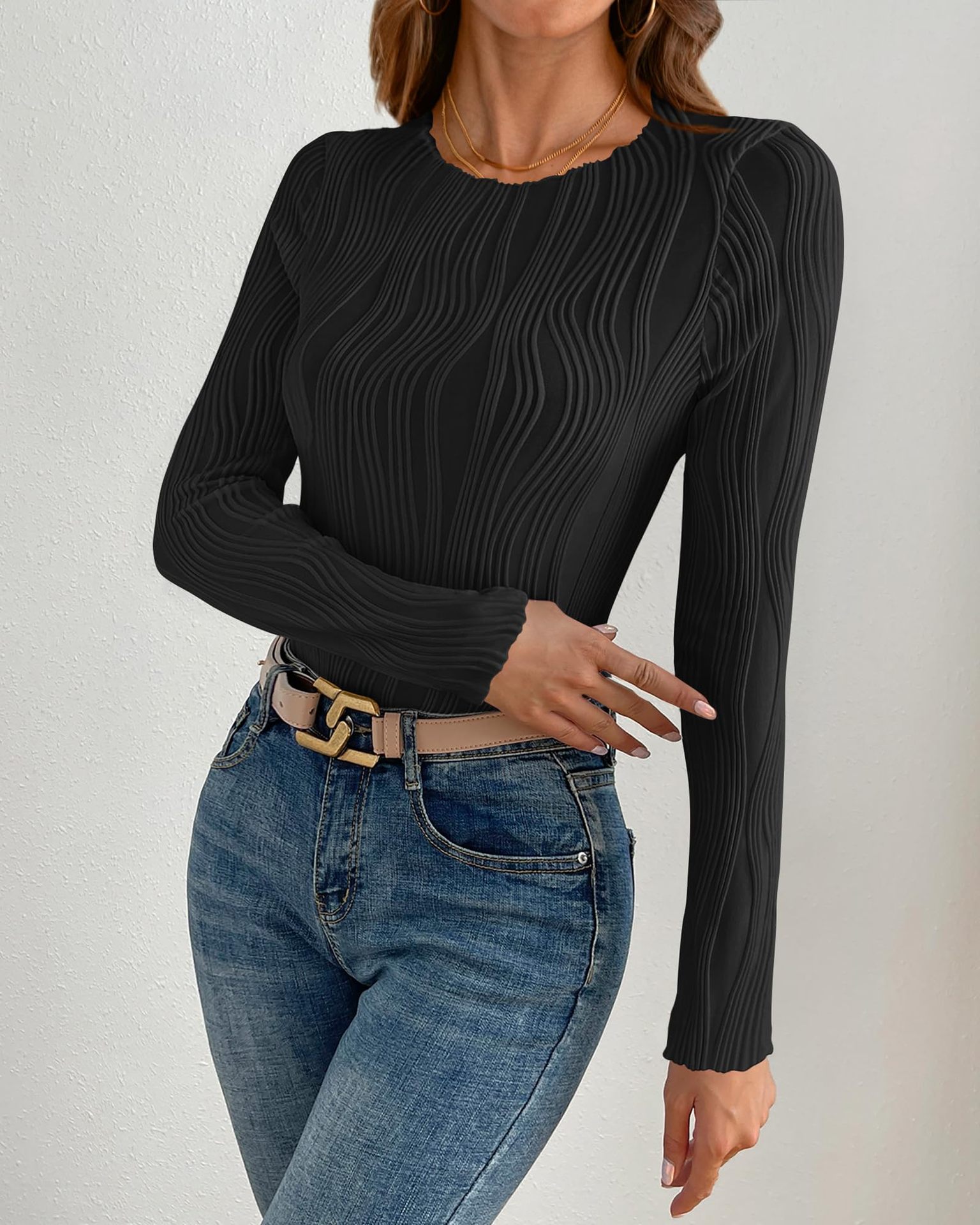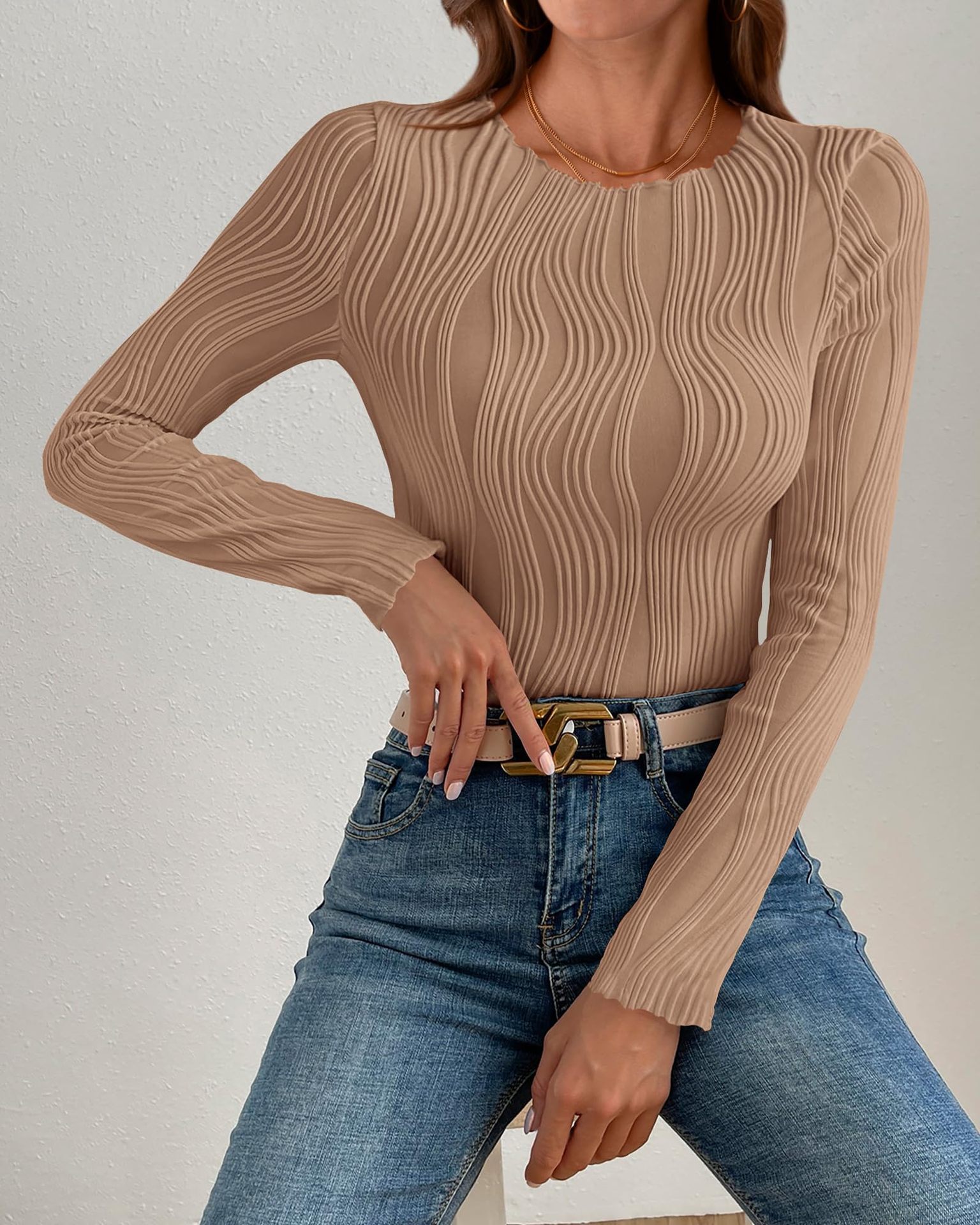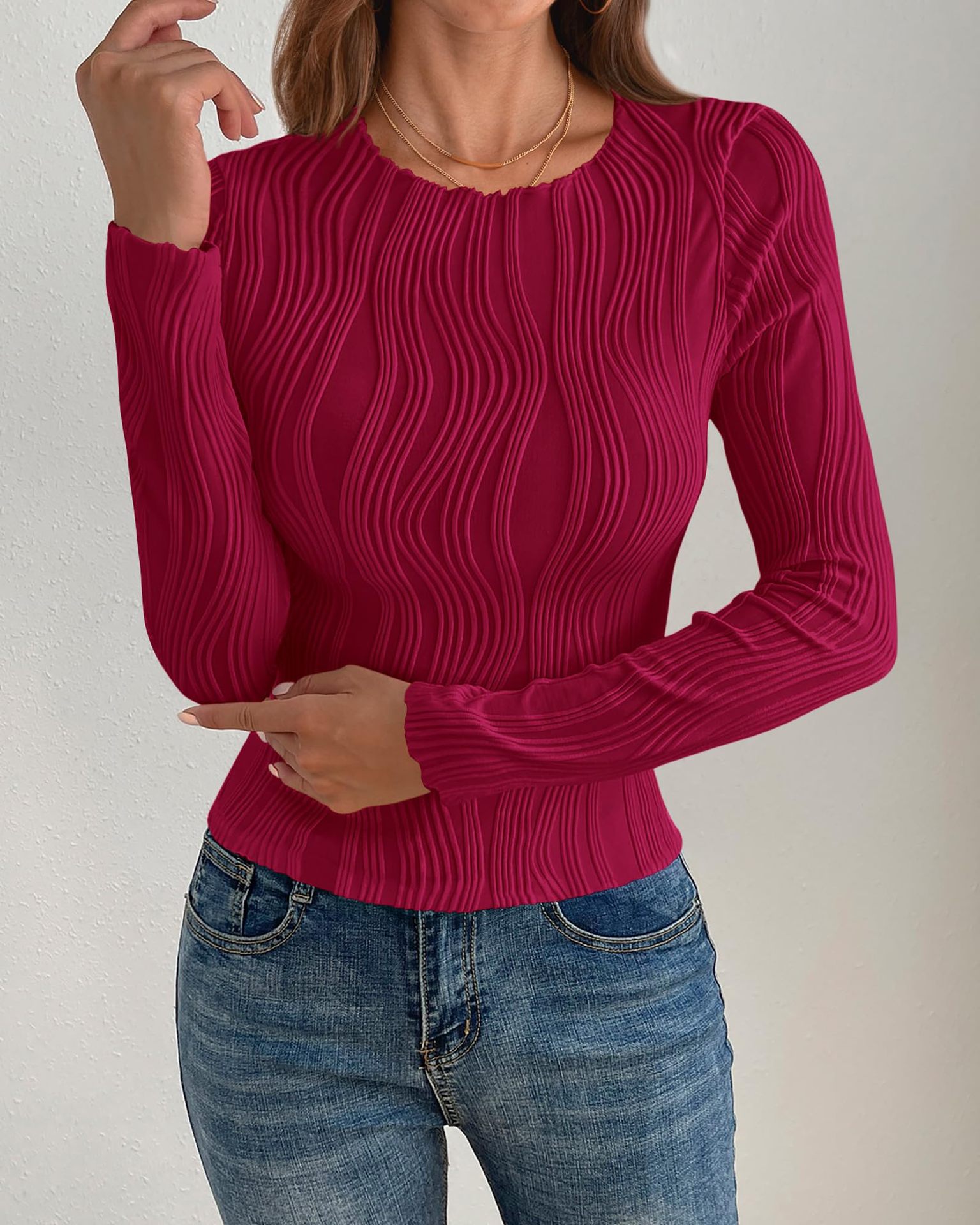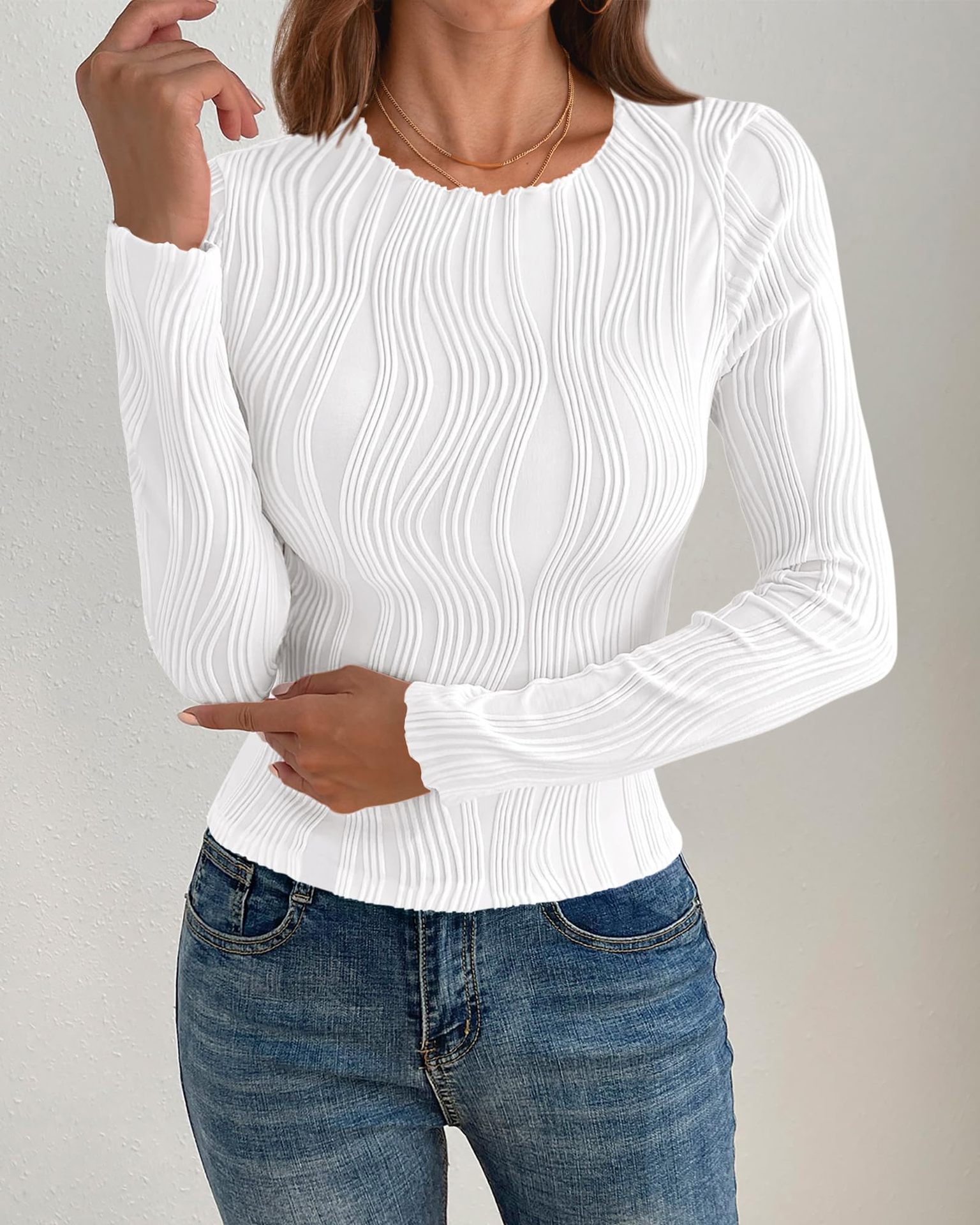 2025 아마존 독립 역 국경 유럽 및 미국 대외 무역 여성의 새로운 자카드 탑 라운드 넥 긴 소매 슬림 티셔츠스토어 가기