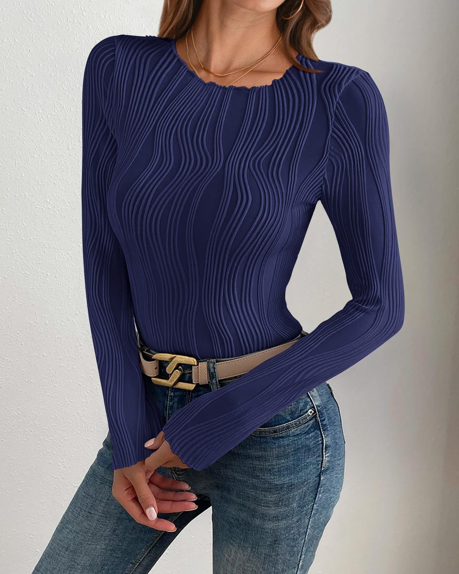 2025 아마존 독립 역 국경 유럽 및 미국 대외 무역 여성의 새로운 자카드 탑 라운드 넥 긴 소매 슬림 티셔츠