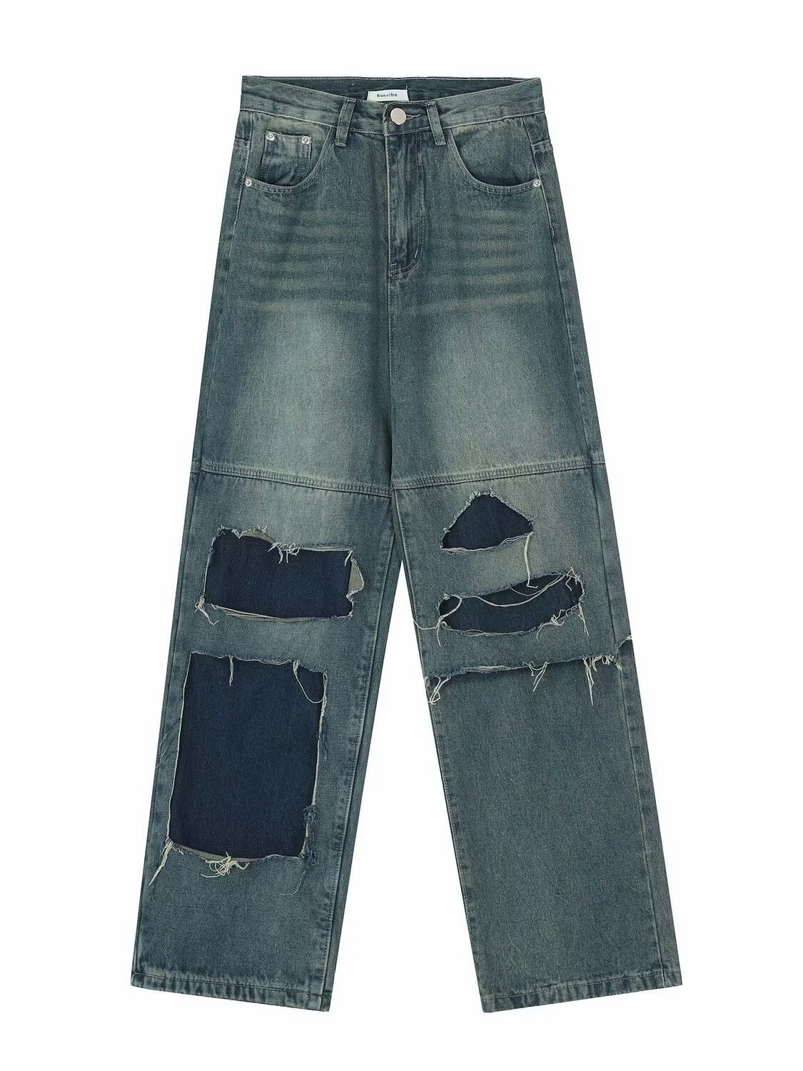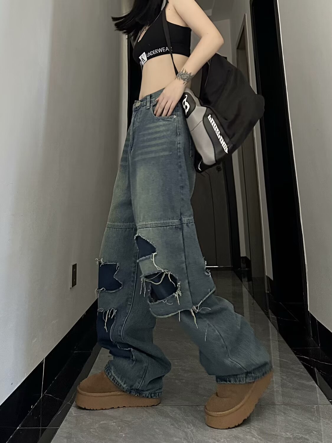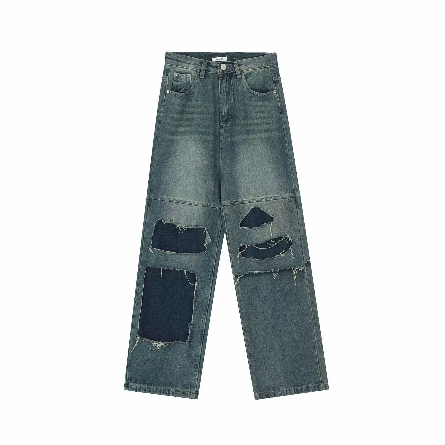 미국 스타일 레트로 트렌디 브랜드 디자인 센스 리핑 스티칭 프로스트 컬러 콘트라스트 청바지 느슨한 스트레이트 바지스토어 가기