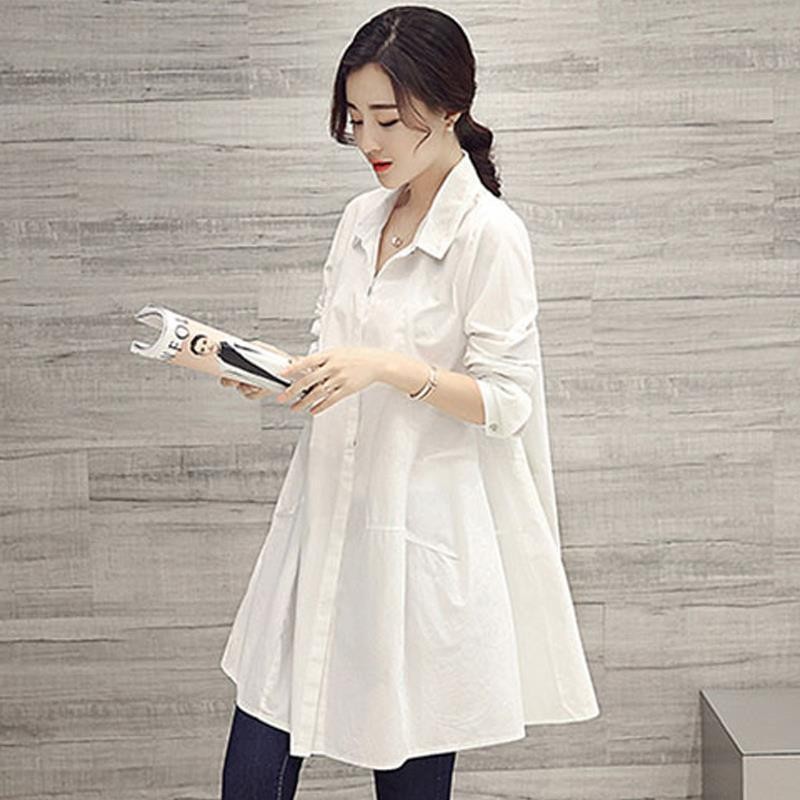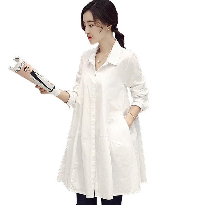 흰색 셔츠 여성 긴팔 봄, 가을 한국 스타일 중간 길이 대형 탑 루즈 슬리밍 배 커버 카디건 바닥 셔츠 드레스