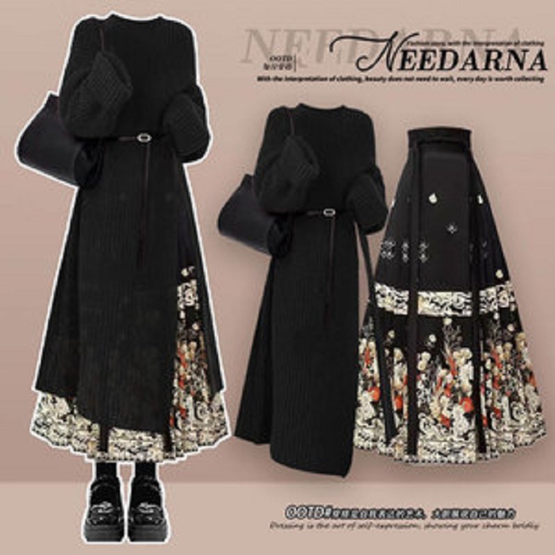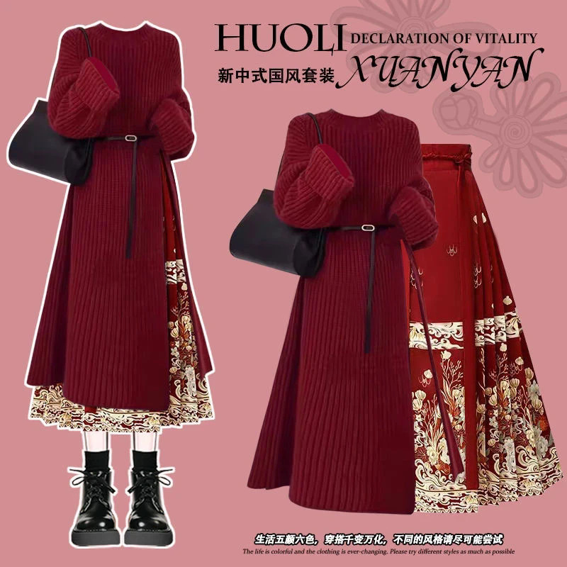 새로운 중국 스타일은 얇은 말 얼굴 스커트 투피스 세트로 가을과 겨울 새로운 하이 엔드 니트 스웨터 세트를 착용합니다.