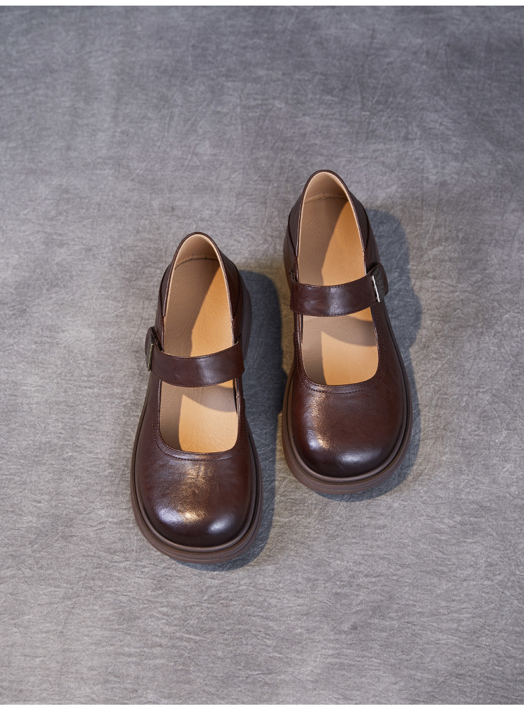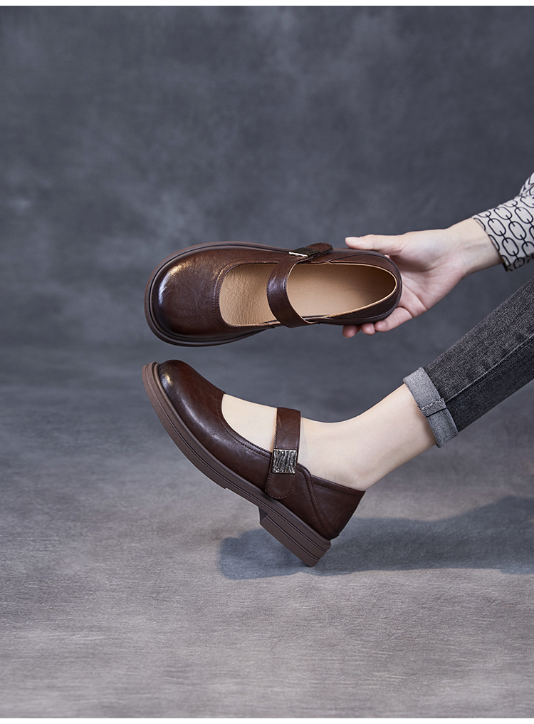미국 천연 색상 Mary Jane 신발 2025 봄 새로운 올 매치 로우 입 플랫 가죽 여성 신발 두꺼운 힐 스트랩 신발