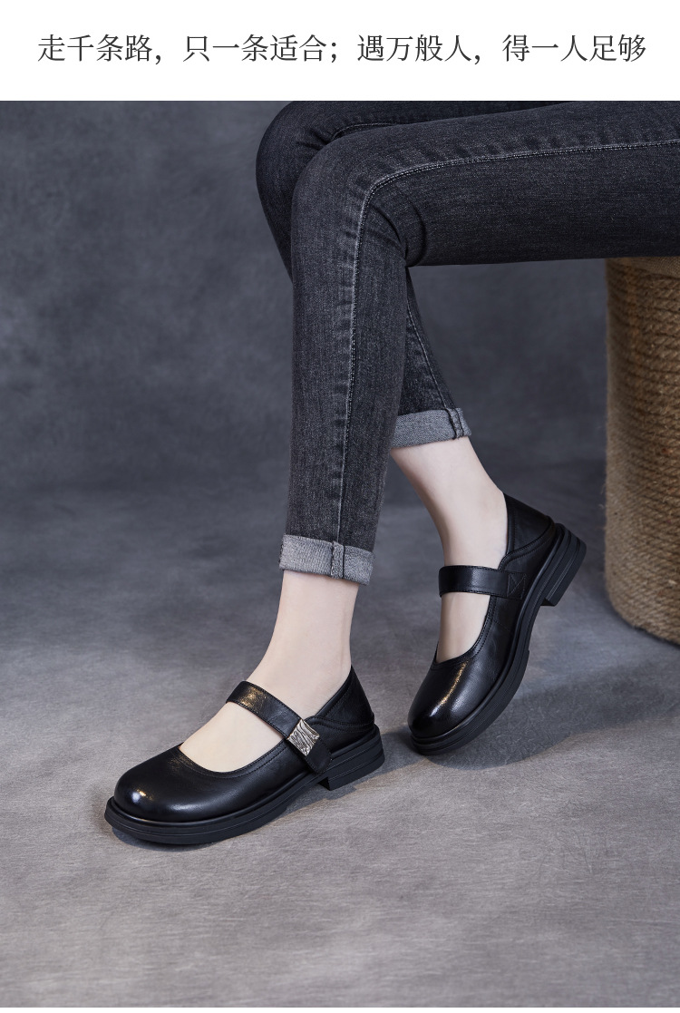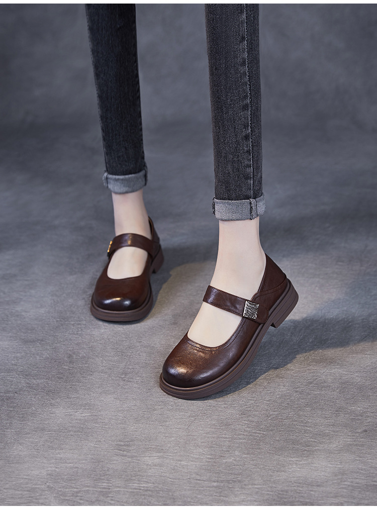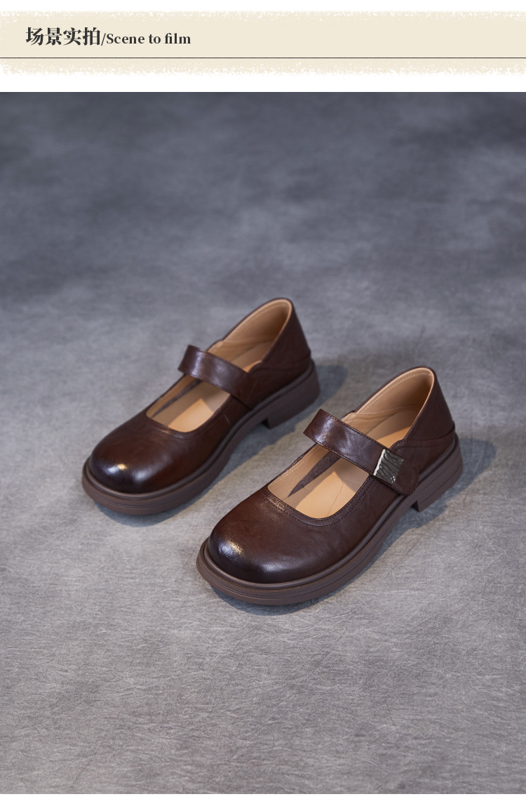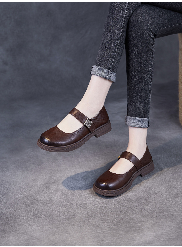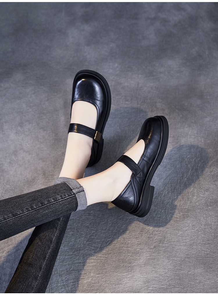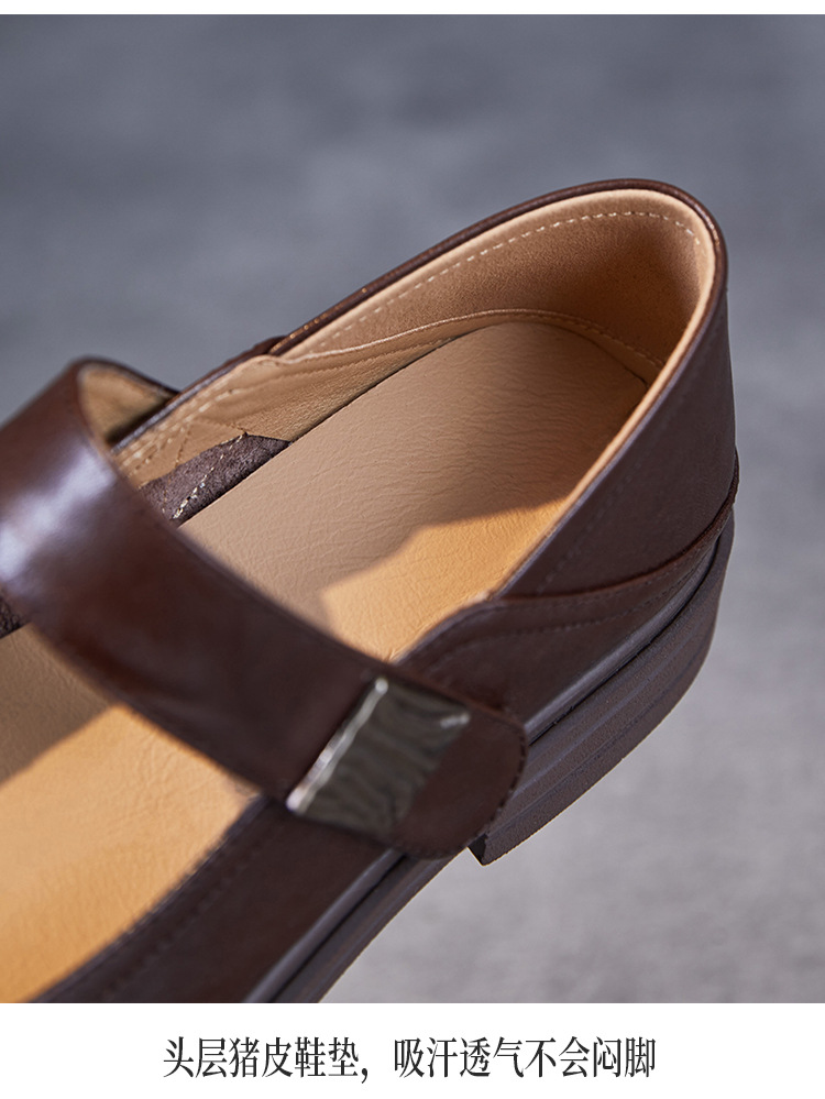 미국 천연 색상 Mary Jane 신발 2025 봄 새로운 올 매치 로우 입 플랫 가죽 여성 신발 두꺼운 힐 스트랩 신발스토어 가기