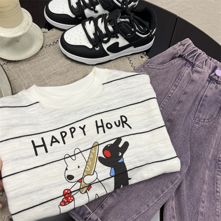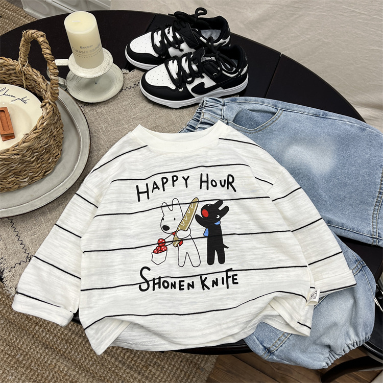 매우 잘 어울립니다~2026 어린이 봄철 스트라이프 프린트 긴팔 티셔츠 남녀공용 라운드넥 만화 캐릭터 기본 셔츠 상의 면