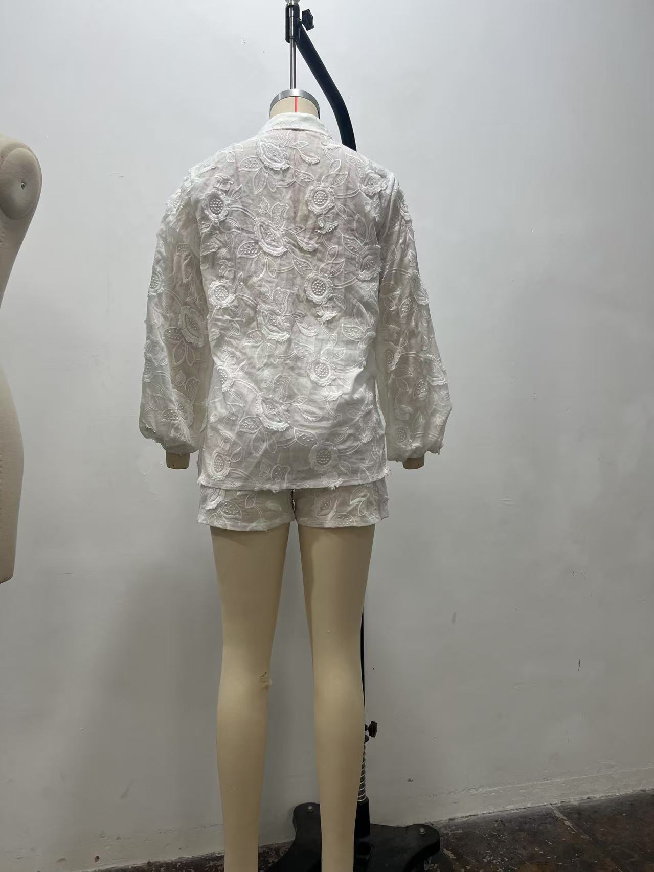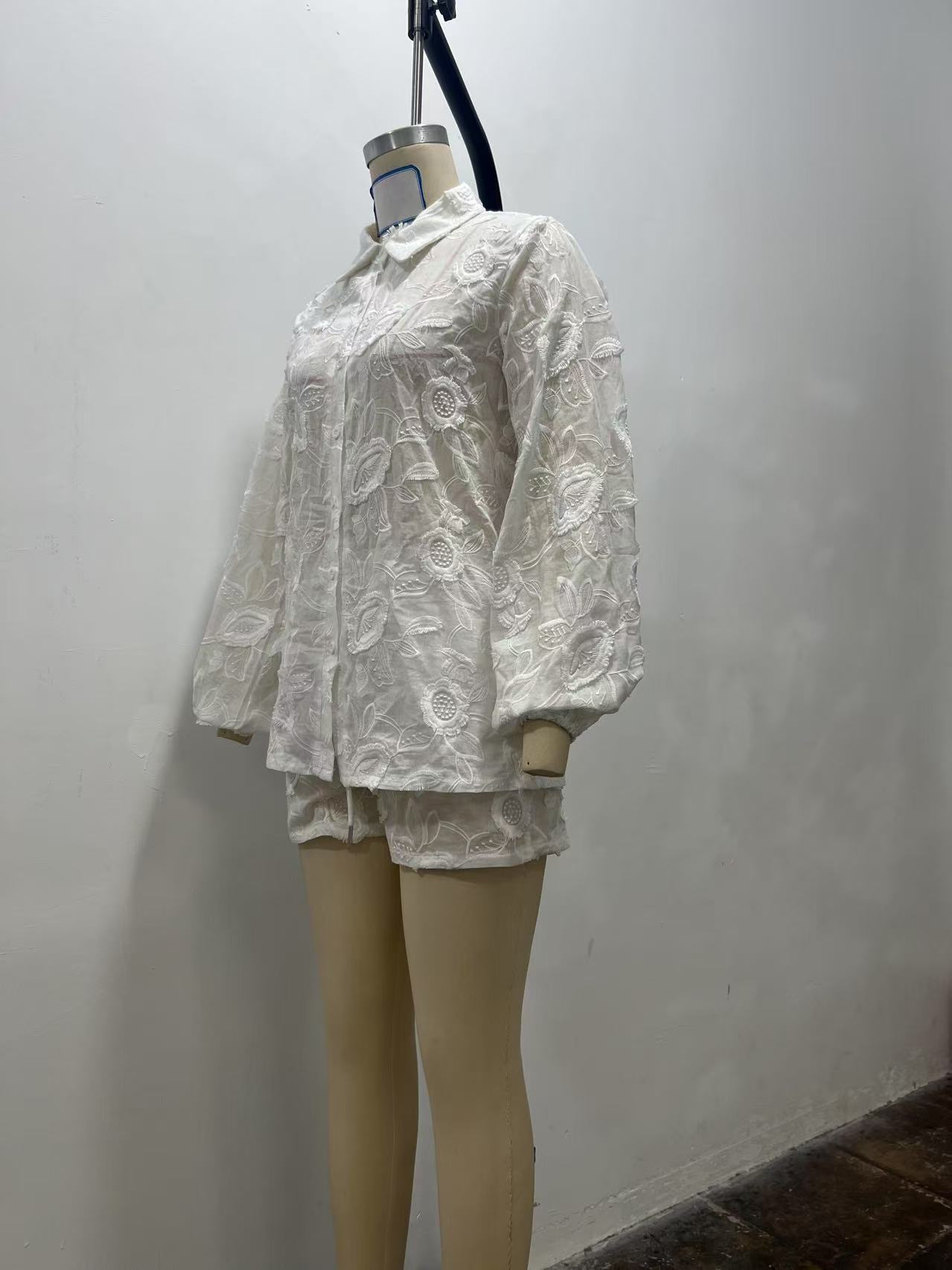 유럽과 미국의 국경 간 여성의 새로운 패션 섹시한 레이스 세트 수 놓은 관점 셔츠 높은 허리 반바지 화이트스토어 가기