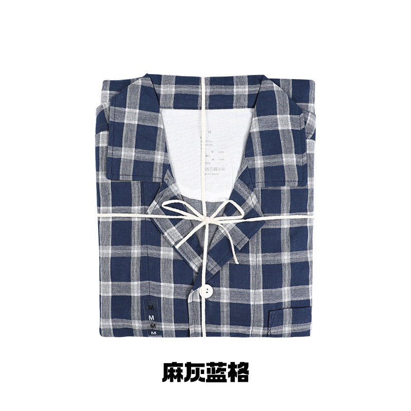 • 커플을 위한 더블 레이어 거즈 홈웨어, 대마 그레이 블루 체크 무늬 남성용