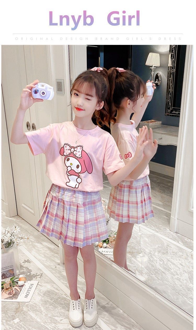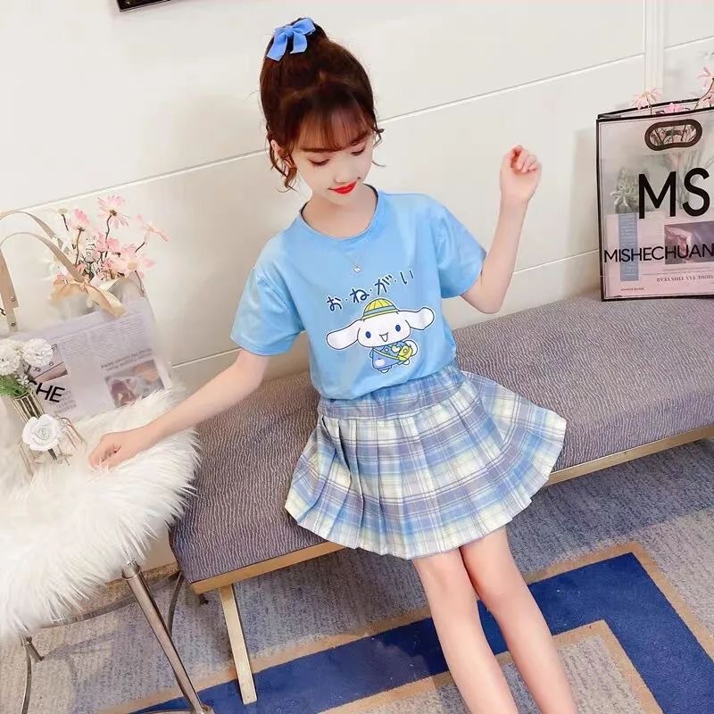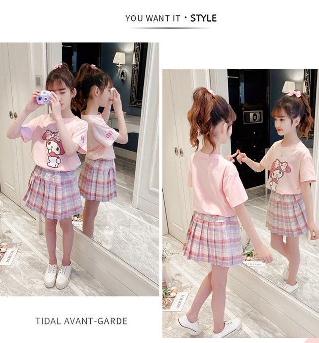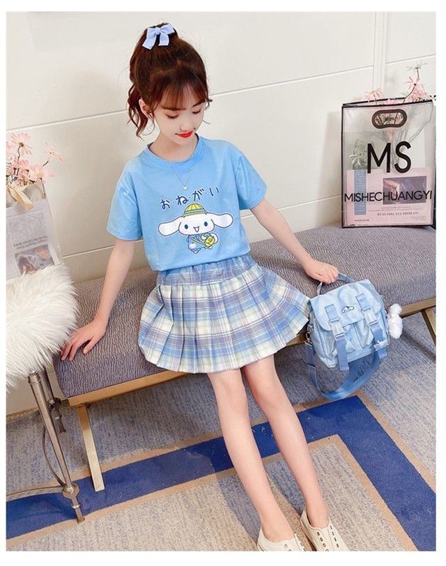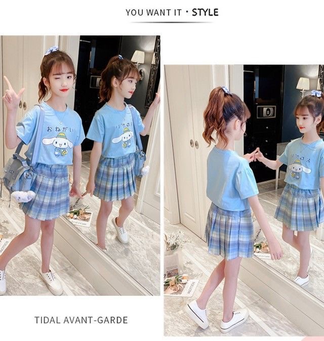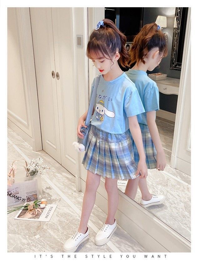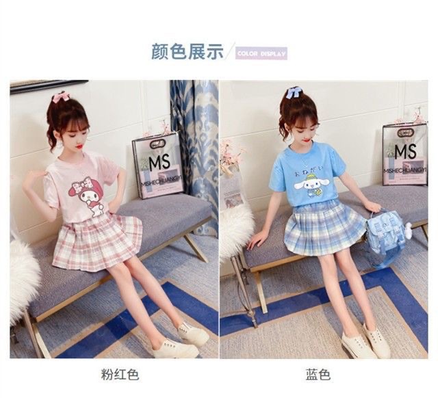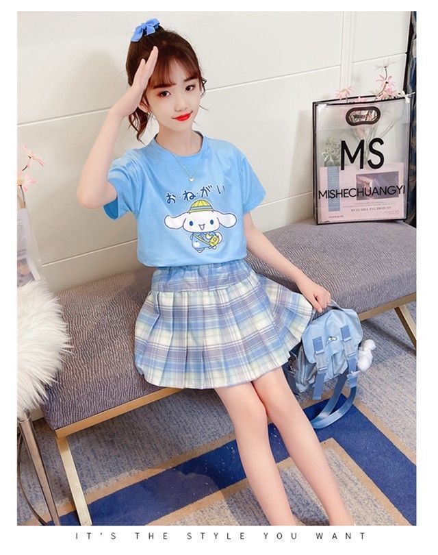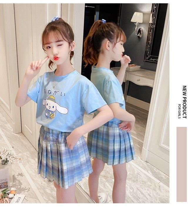 소녀의 큰 소년의 여름 대학 스타일 세트 원피스 초등학교 소녀의 둥근 목 티셔츠 체크 무늬 스커트 만화 2 피스 트렌디 세트스토어 가기