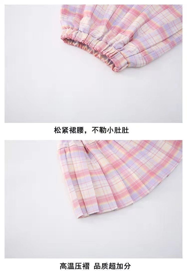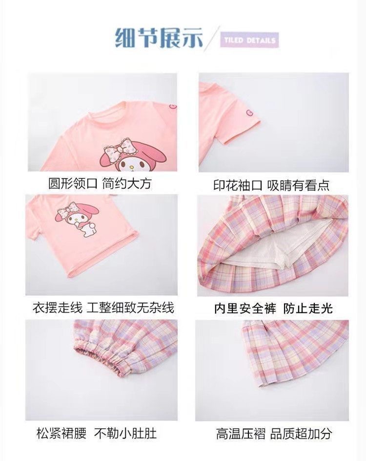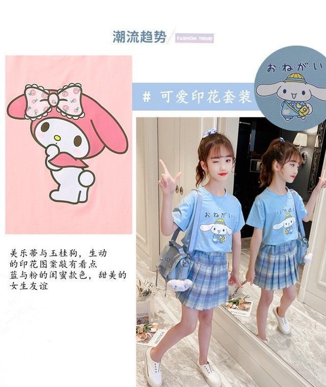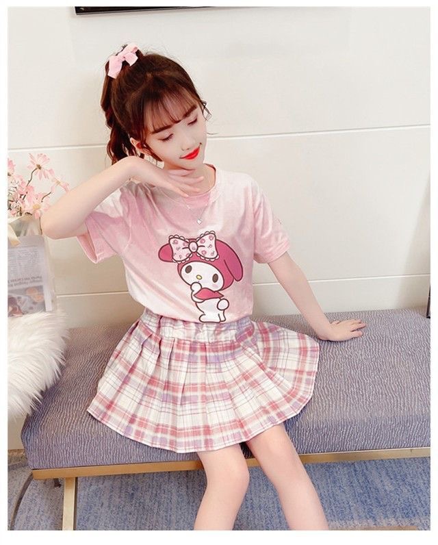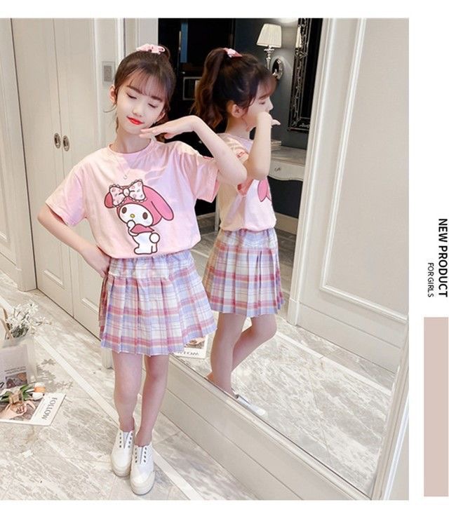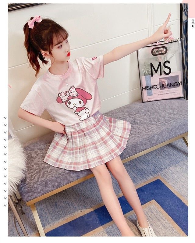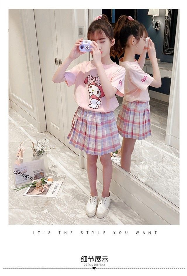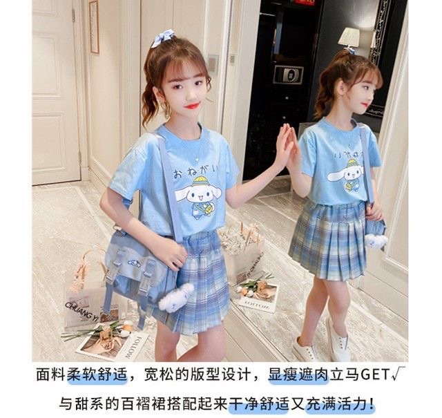 소녀의 큰 소년의 여름 대학 스타일 세트 원피스 초등학교 소녀의 둥근 목 티셔츠 체크 무늬 스커트 만화 2 피스 트렌디 세트스토어 가기