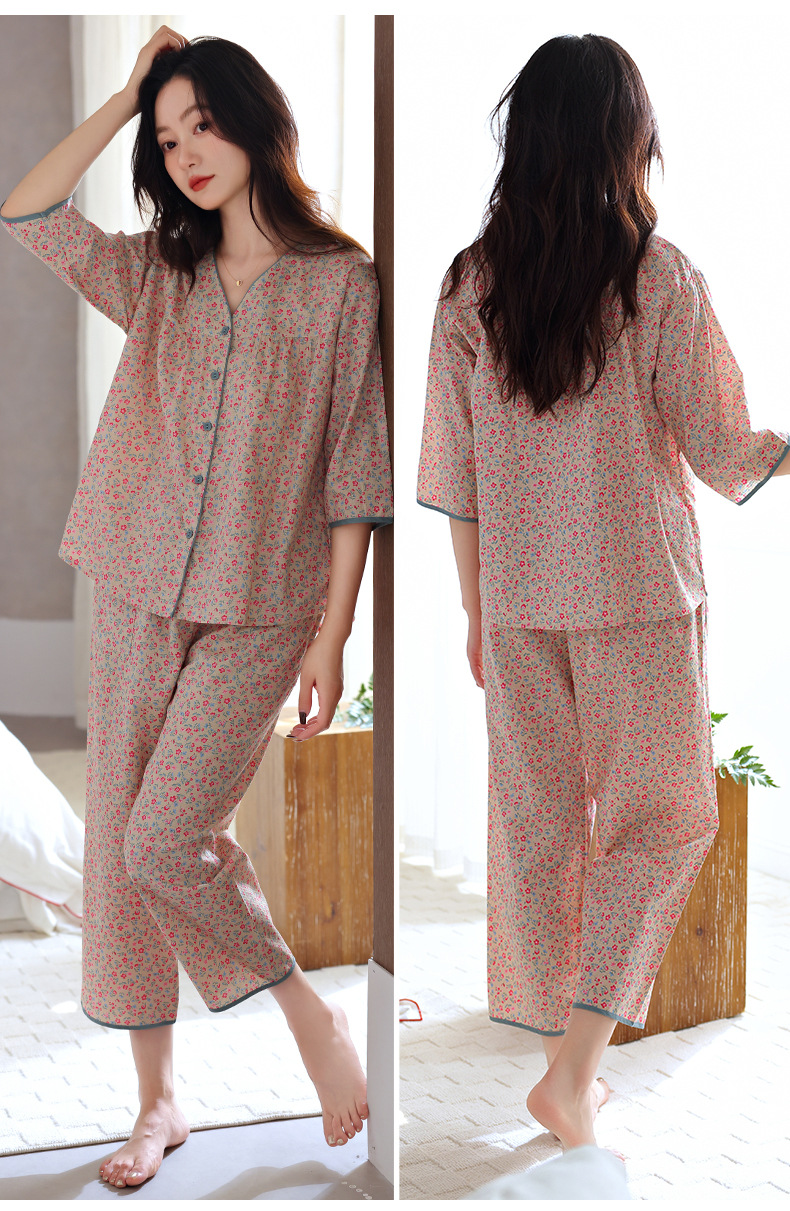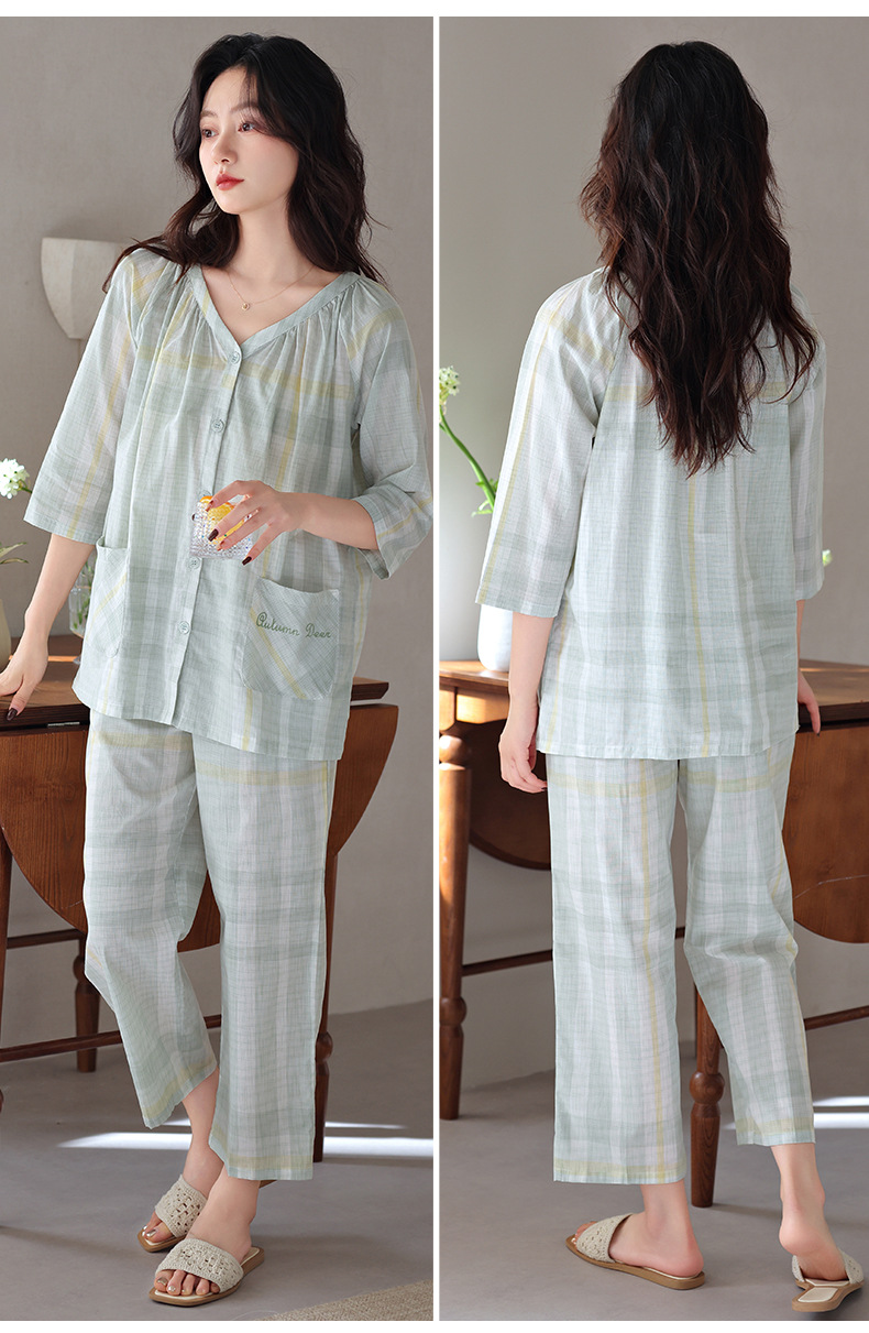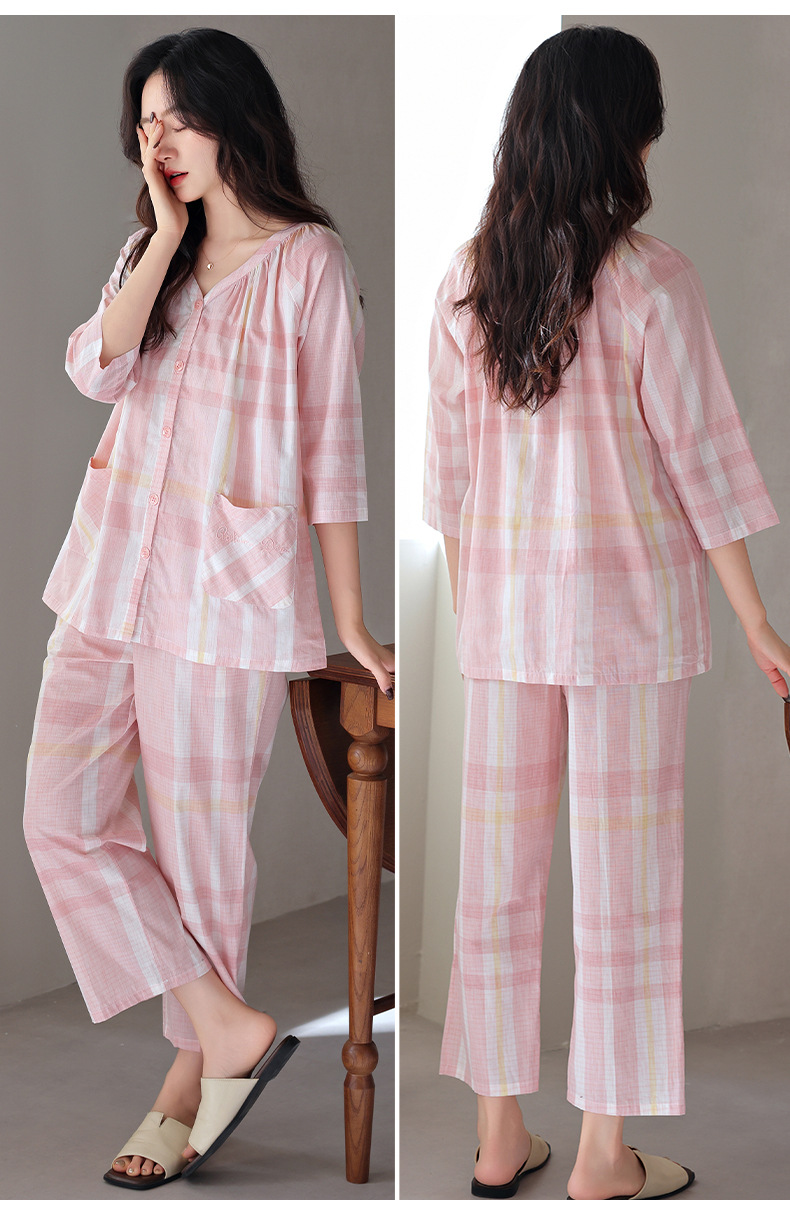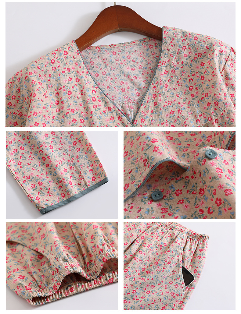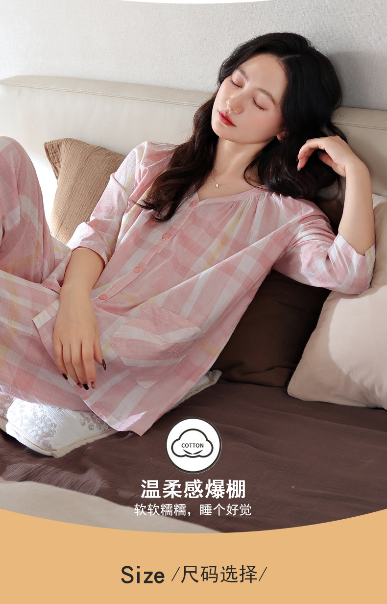 짠 면 거즈 잠옷 여성의 봄과 여름 얇은 순면 홈 옷 중년 어머니 플러스 사이즈 소매 세트스토어 가기