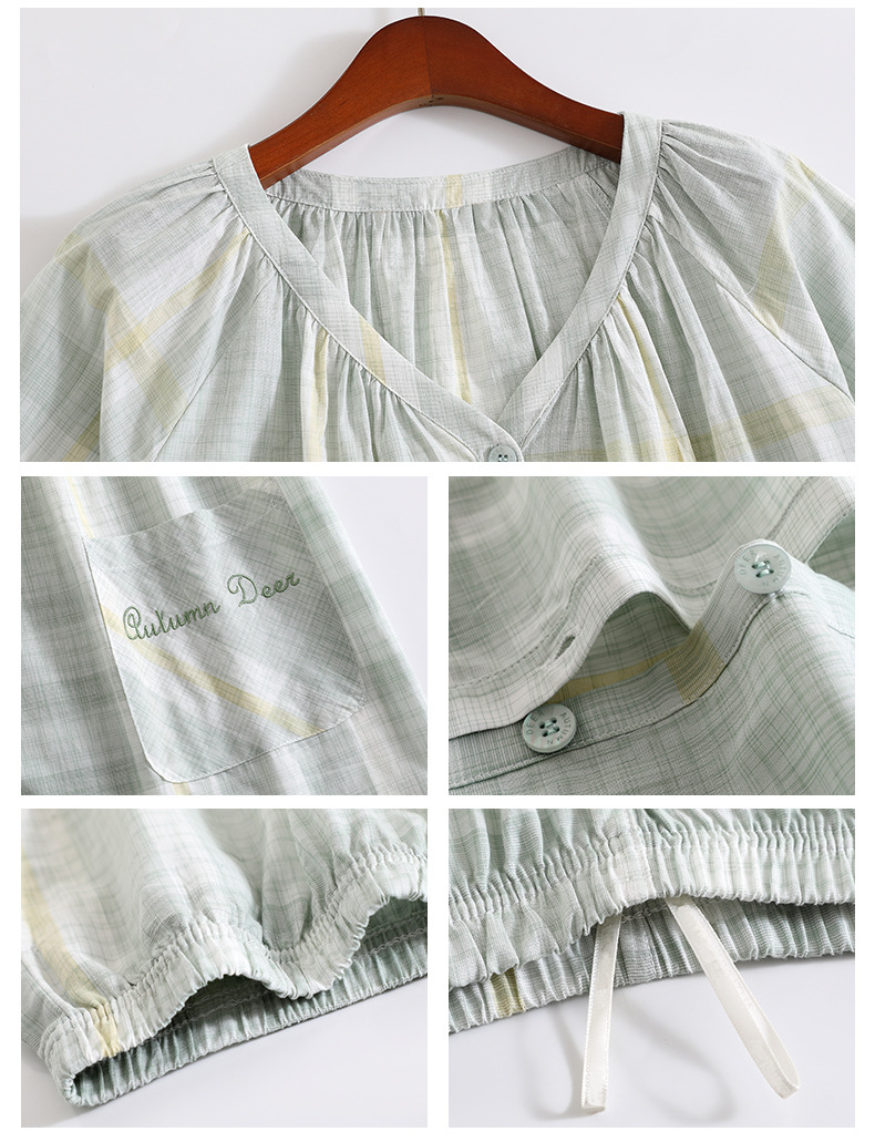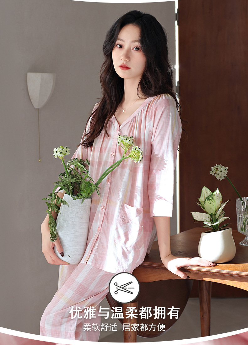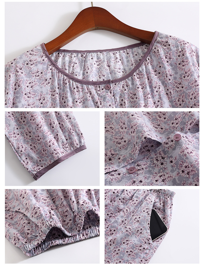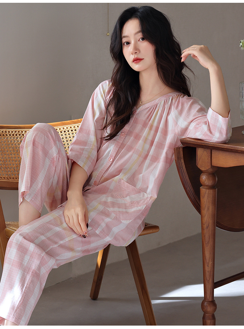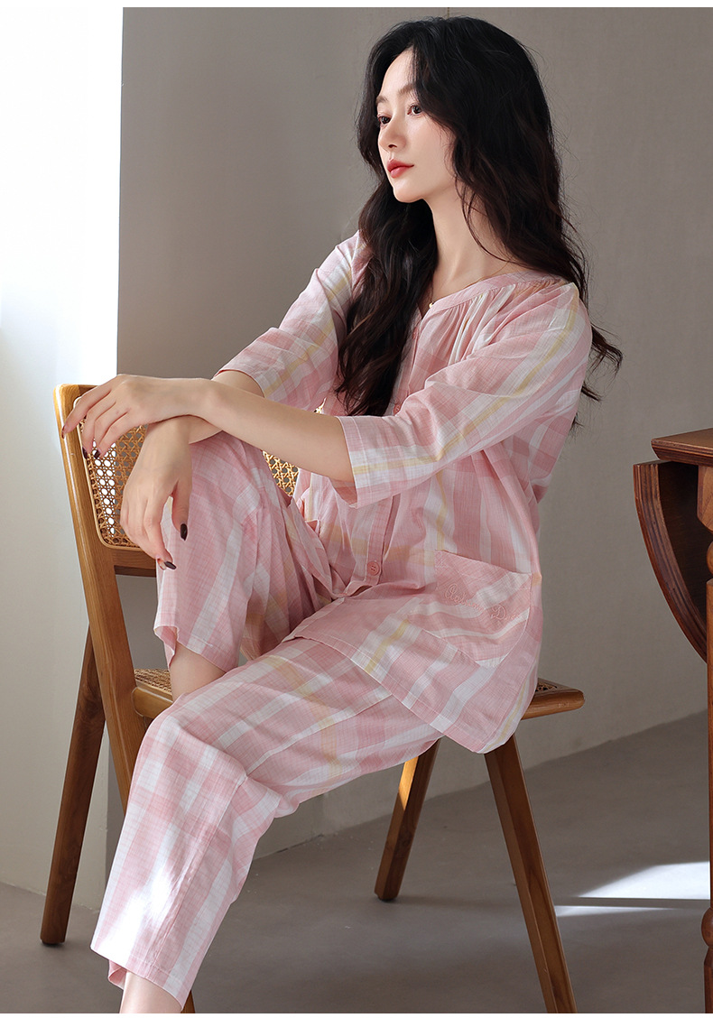짠 면 거즈 잠옷 여성의 봄과 여름 얇은 순면 홈 옷 중년 어머니 플러스 사이즈 소매 세트스토어 가기