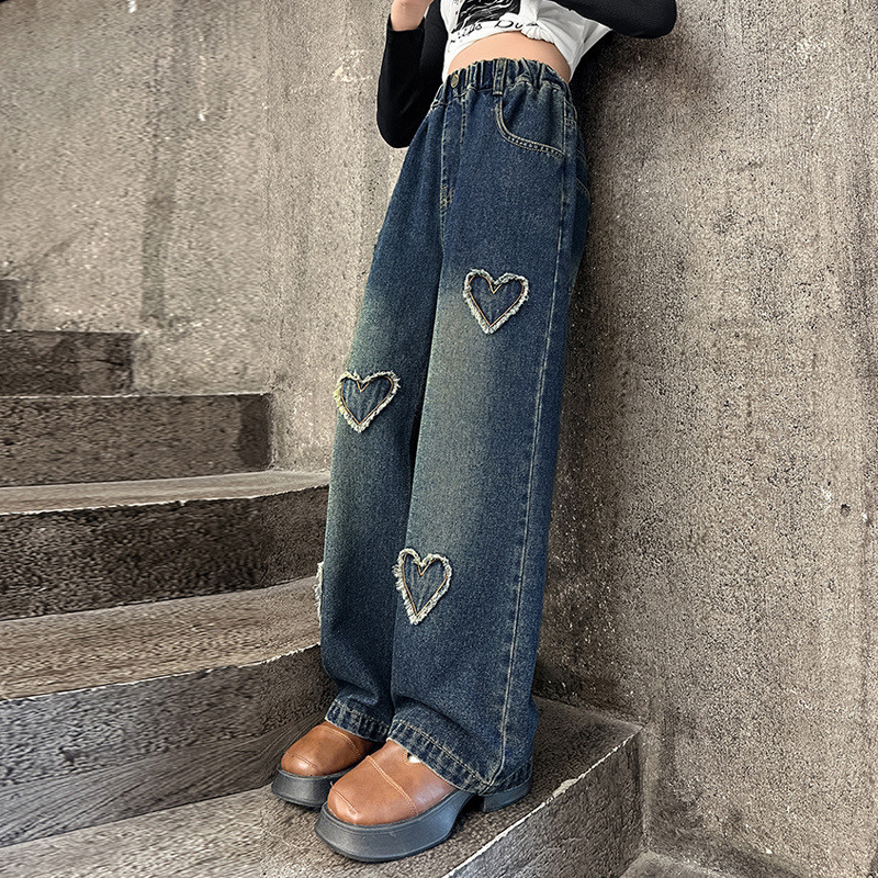 국경을 넘나 드는 소녀의 봄과 가을 청바지 2025 새로운 한국식 중 · 빅 키즈 패션 스트레이트 세련 된 사랑 자수 바지스토어 가기