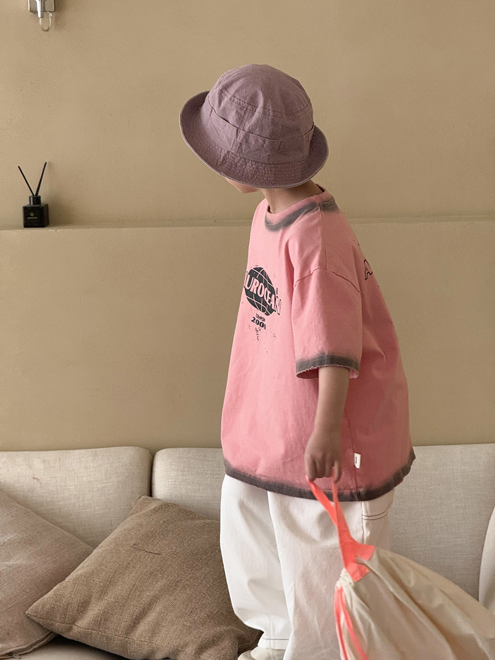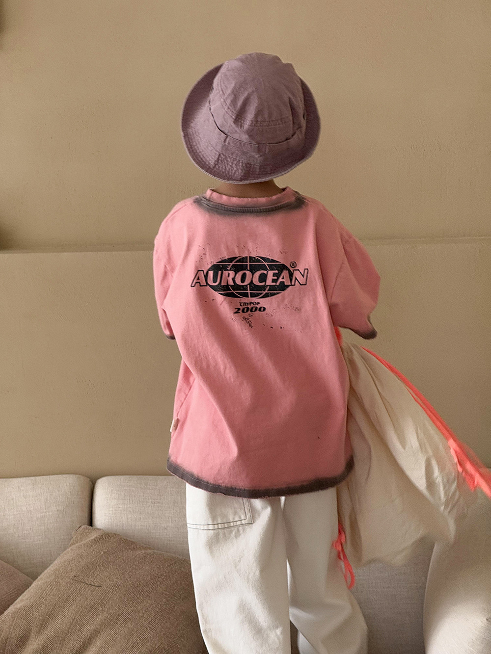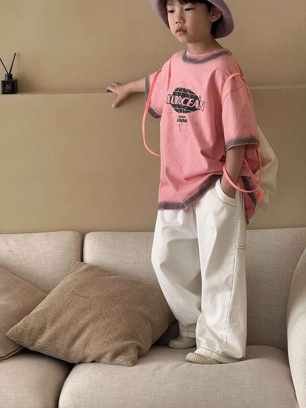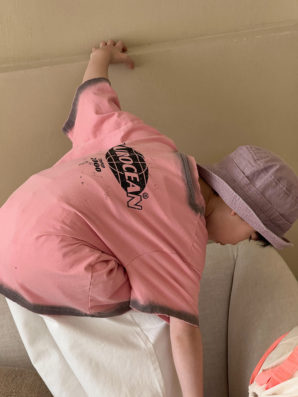 남자들의 반팔 바닥 셔츠 티셔츠 봄과 여름 2025 새로운 도착 어린이 스프레이 염색 얇은 핑크 편지 프린트 탑 트렌디 t