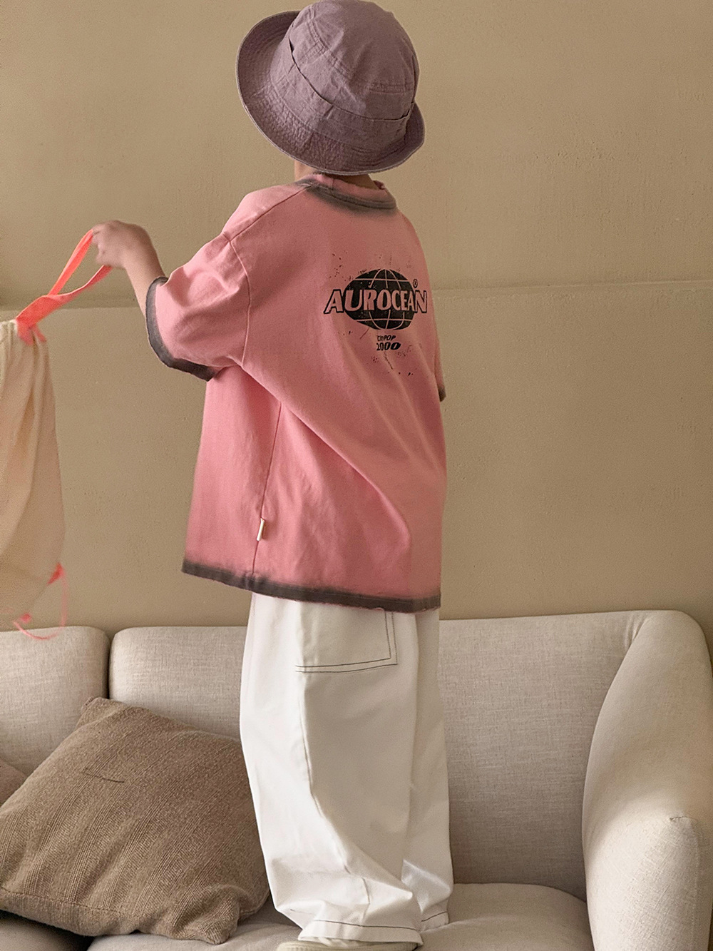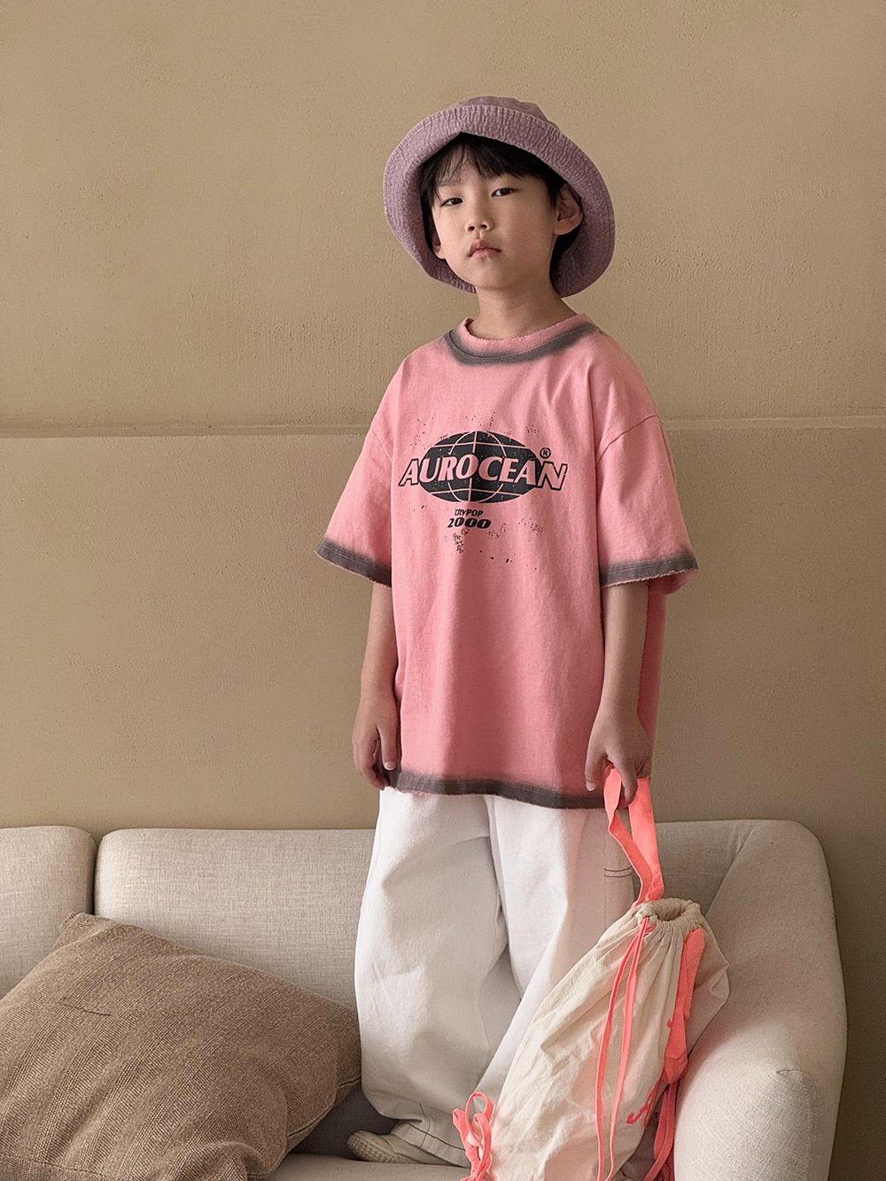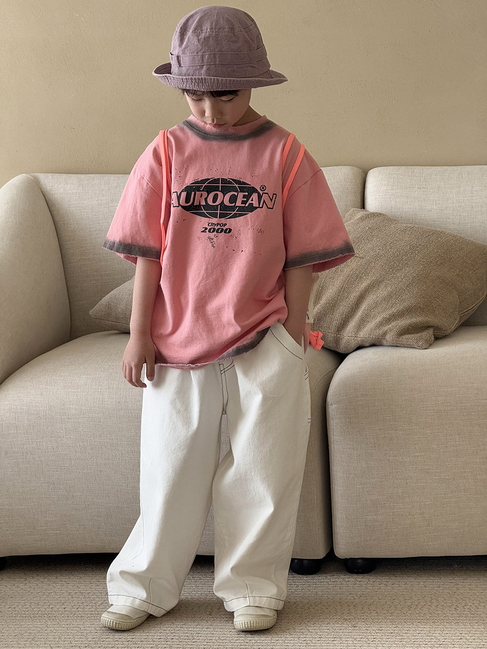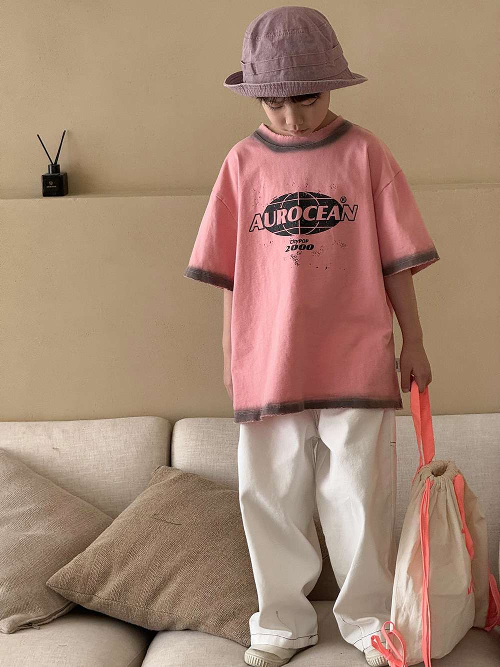 남자들의 반팔 바닥 셔츠 티셔츠 봄과 여름 2025 새로운 도착 어린이 스프레이 염색 얇은 핑크 편지 프린트 탑 트렌디 t