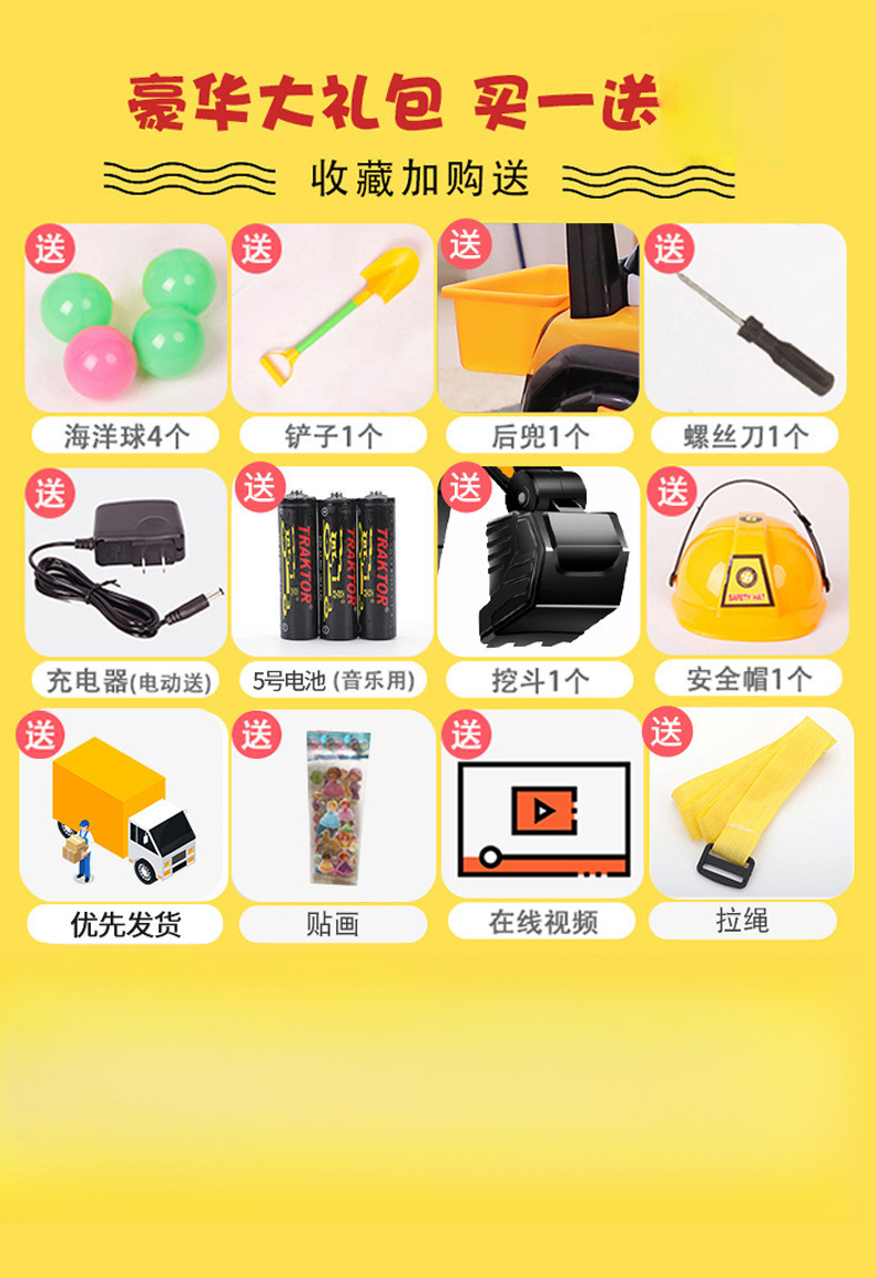 • 노란색 리모콘 + 조기 교육 음악 및 조명 + 스티어링 푸시 핸들 + 예비 + 대형 드래그 버킷