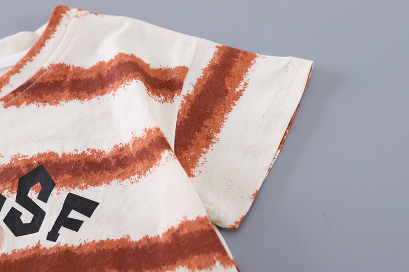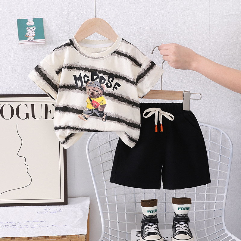 소년의 여름 반팔 유행 세트 새로운 유행 중소 어린이 줄무늬 개 크루 넥 반팔 투피스 세트스토어 가기