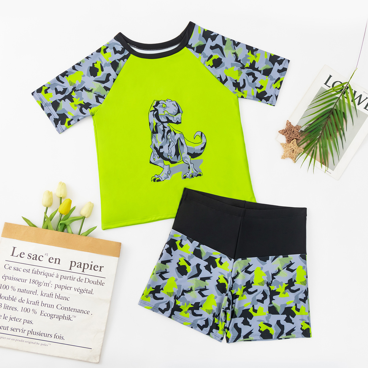 2025 새로운 수영복 어린이 만화 패턴 인쇄 분할 2 조각 세트 소년의 유럽과 미국의 플랫 바지 아마존 공룡