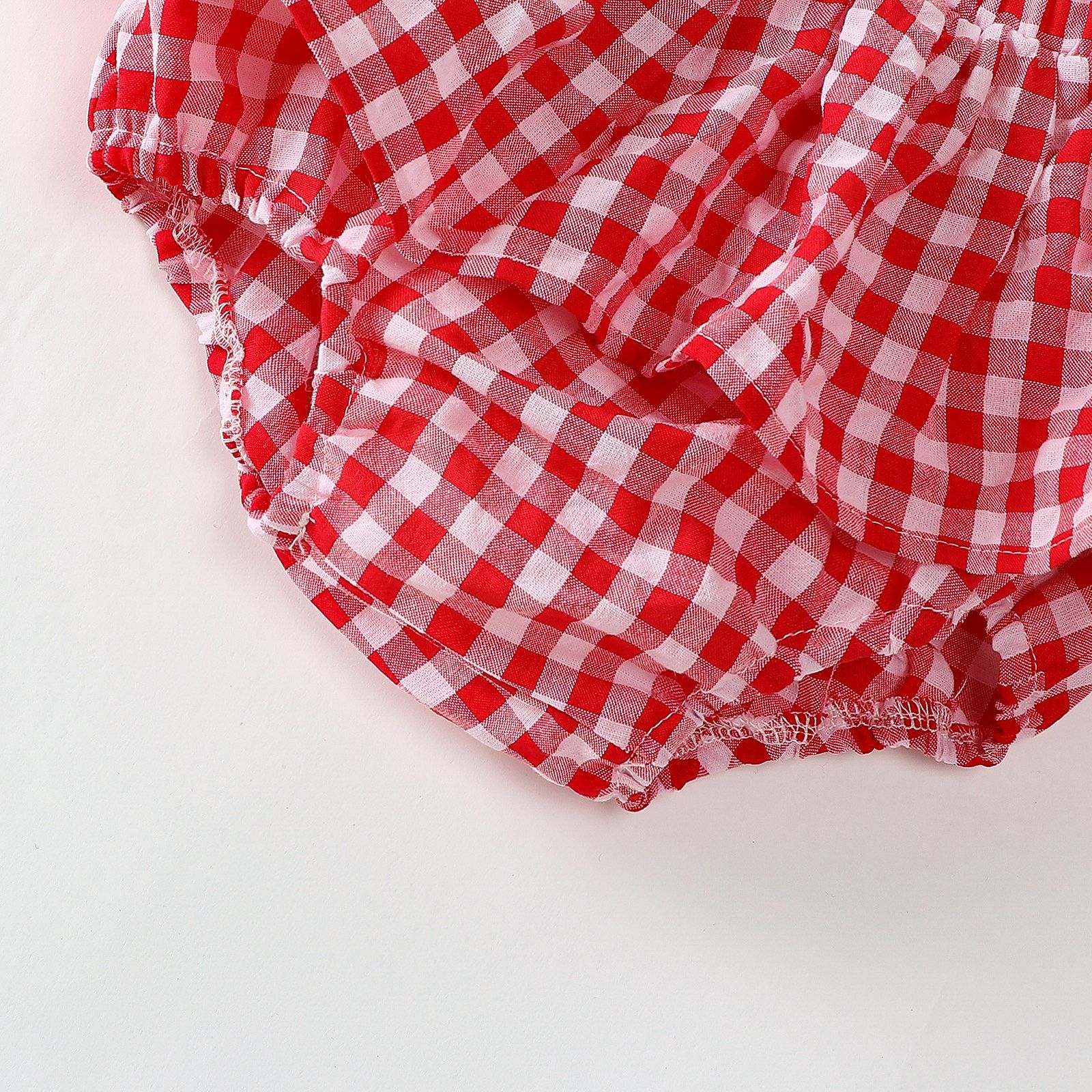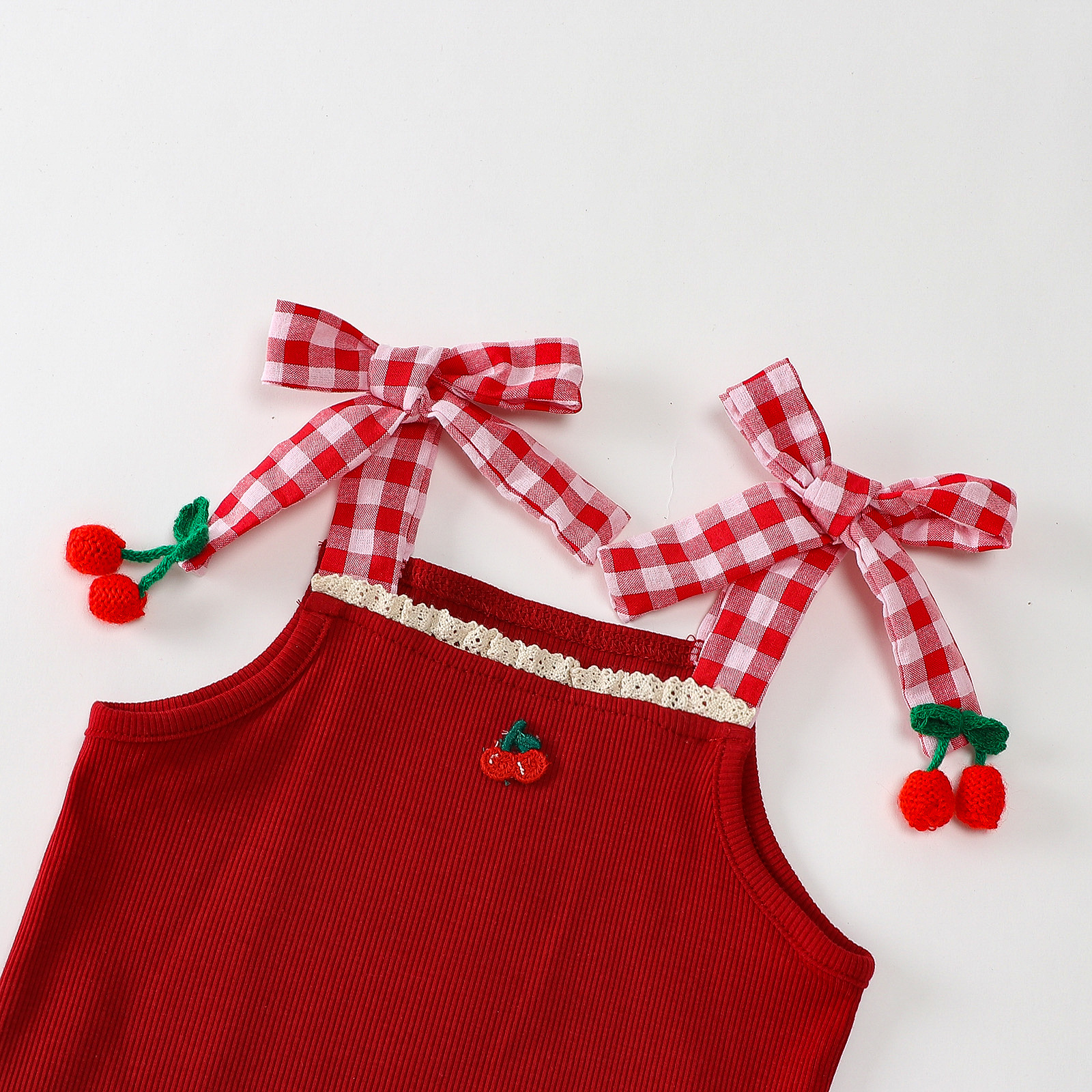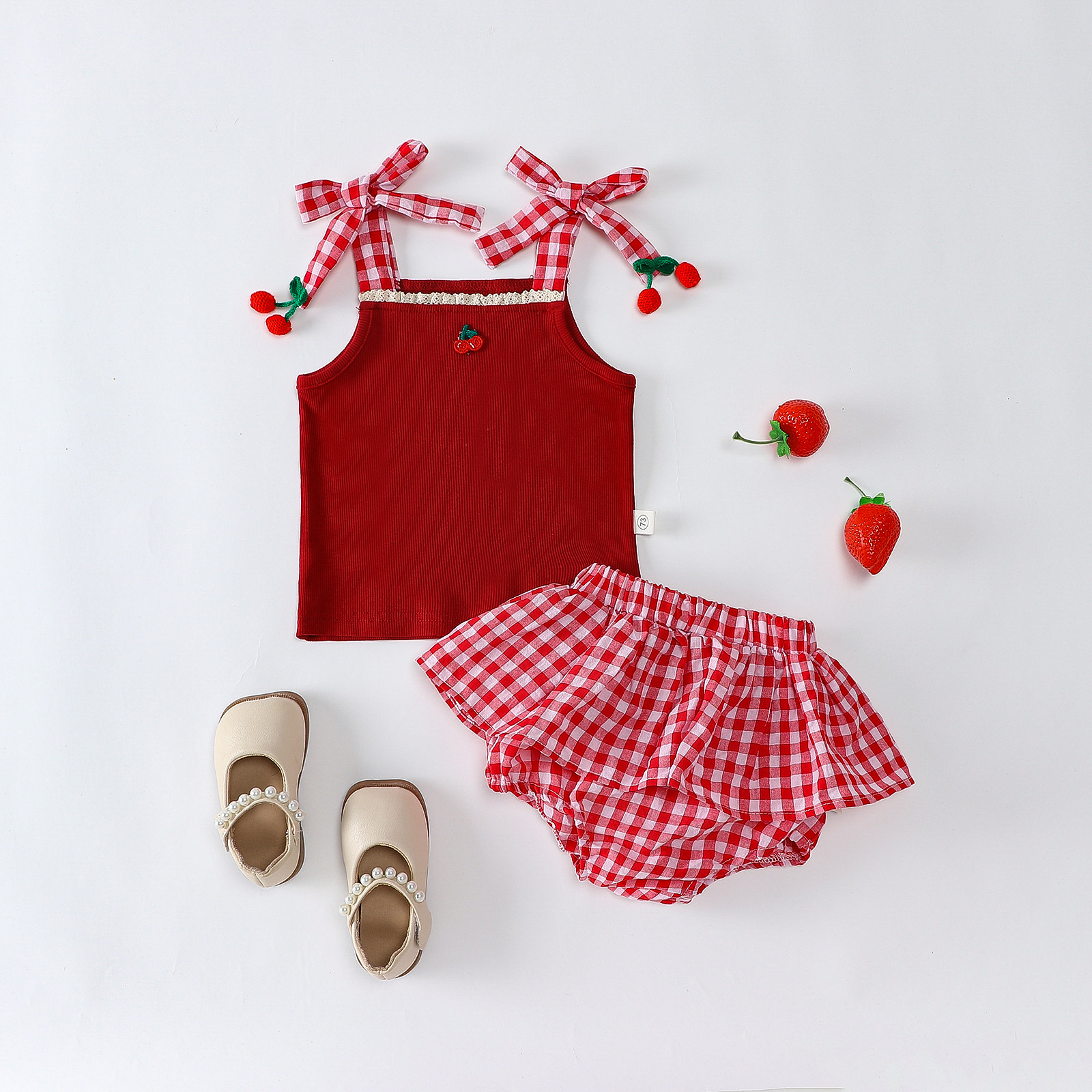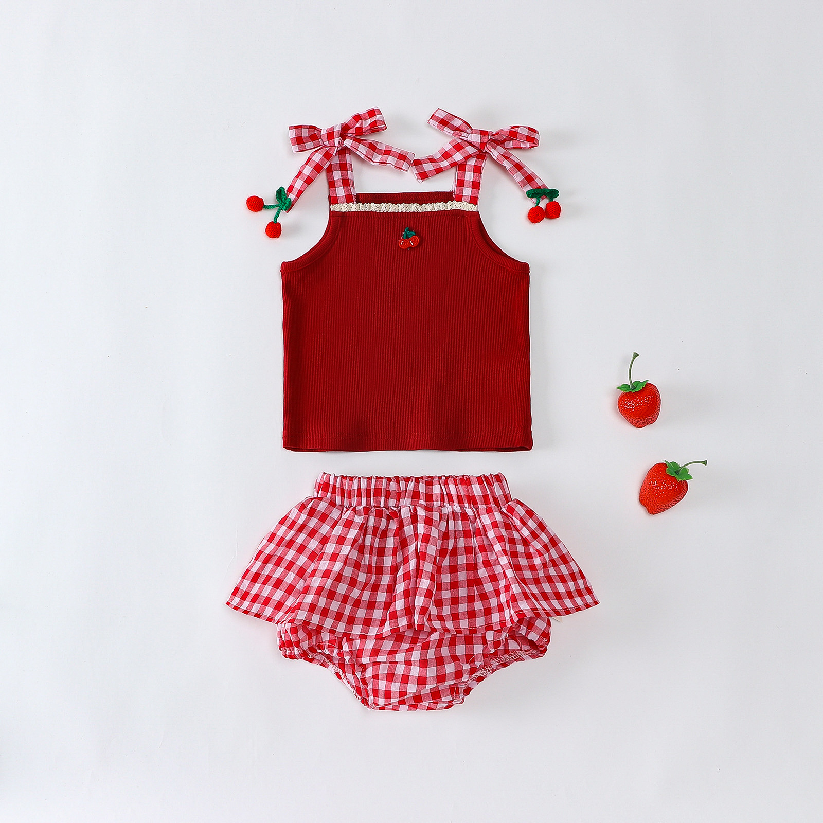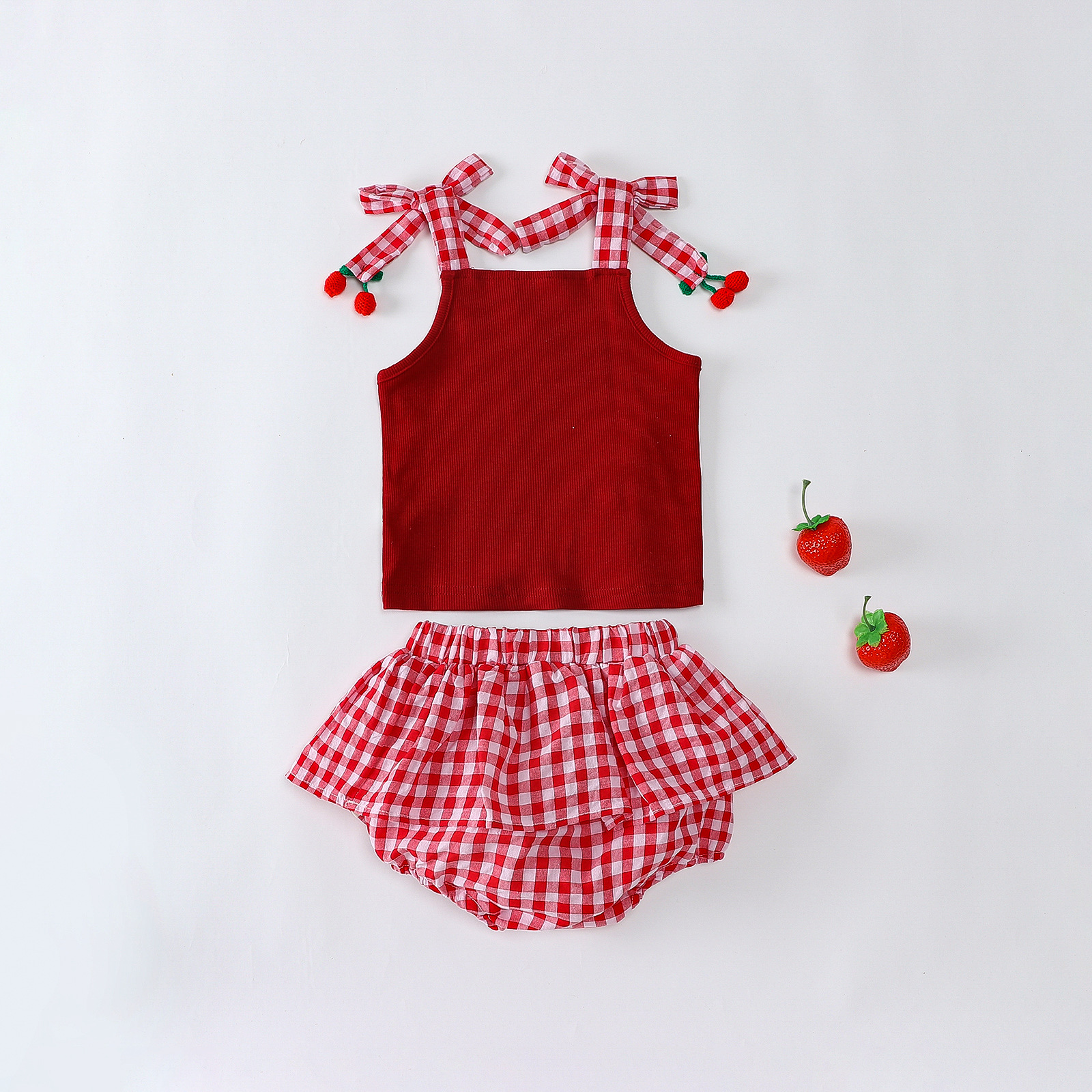 소녀 딸기 스트랩 탑 아동복 여름 격자 무늬 팔찌 바지 세트 유아용 달콤한 투피스 세트