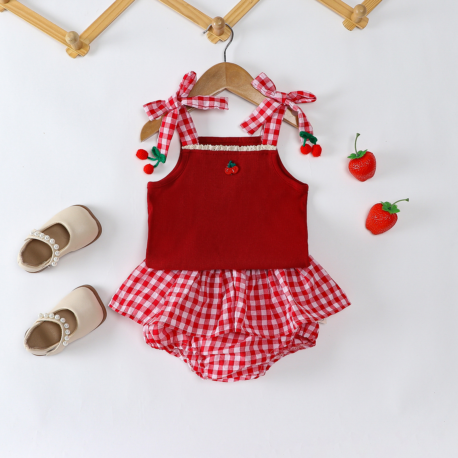 소녀 딸기 스트랩 탑 아동복 여름 격자 무늬 팔찌 바지 세트 유아용 달콤한 투피스 세트스토어 가기