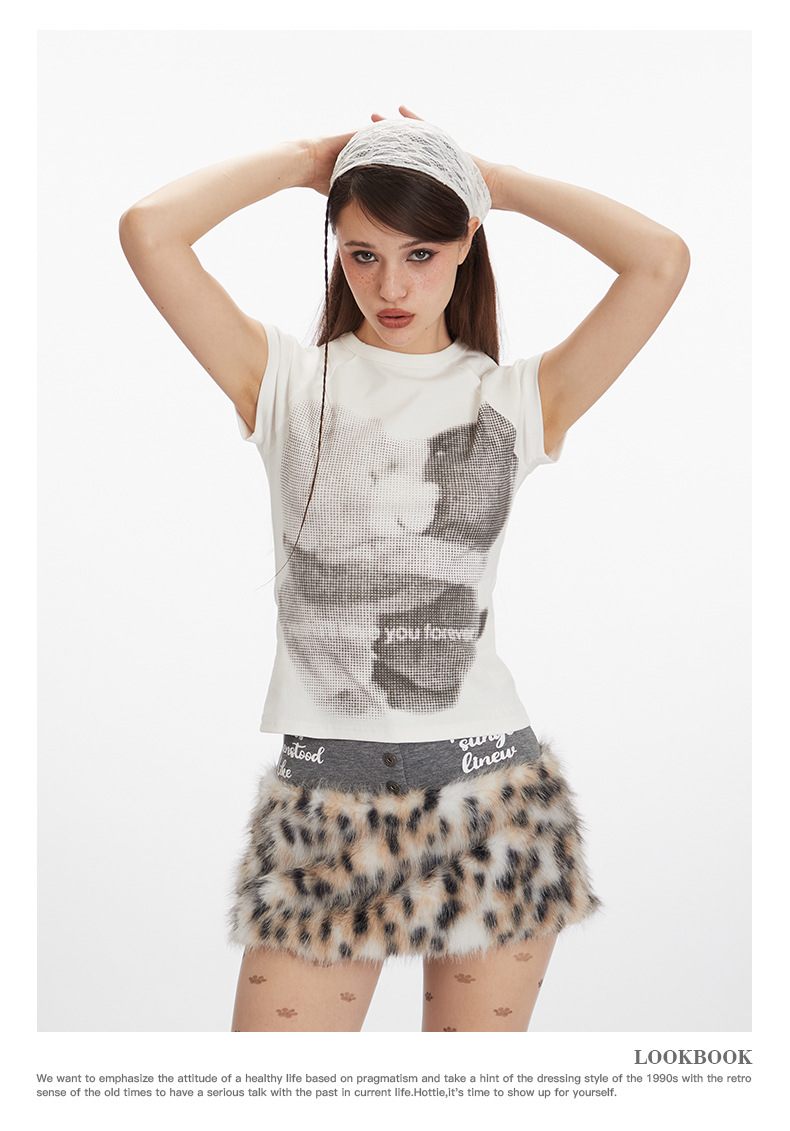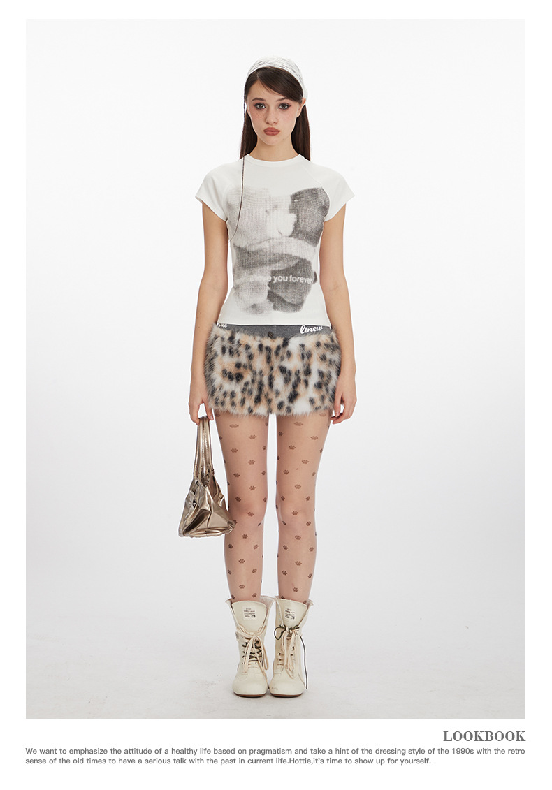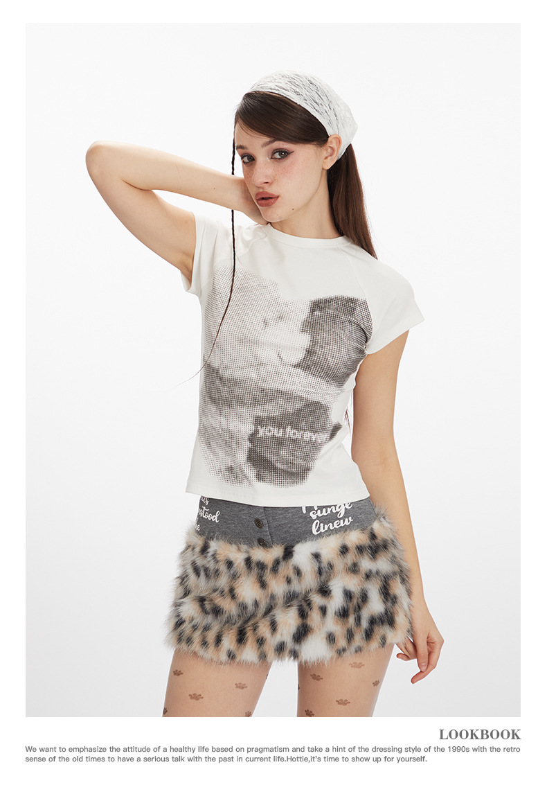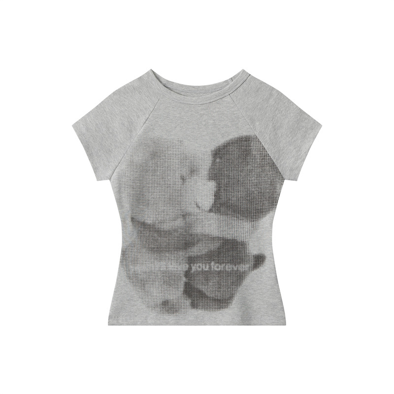 HeyHenry 아메리칸 스타일 오른쪽 어깨 베어 프린트 슬림 반팔 티셔츠 여성용 2025 New round Neck Hot Girl Short Top