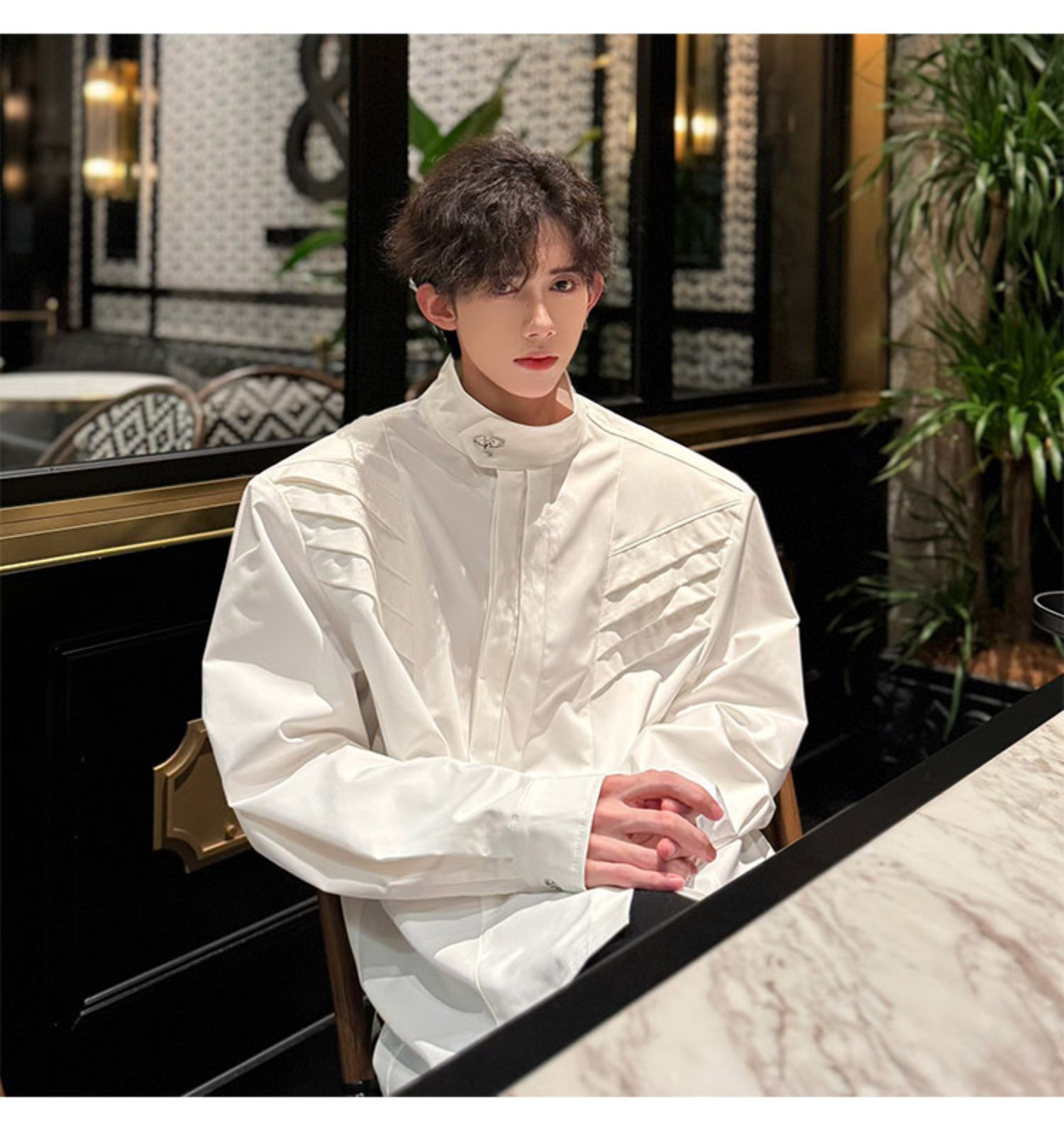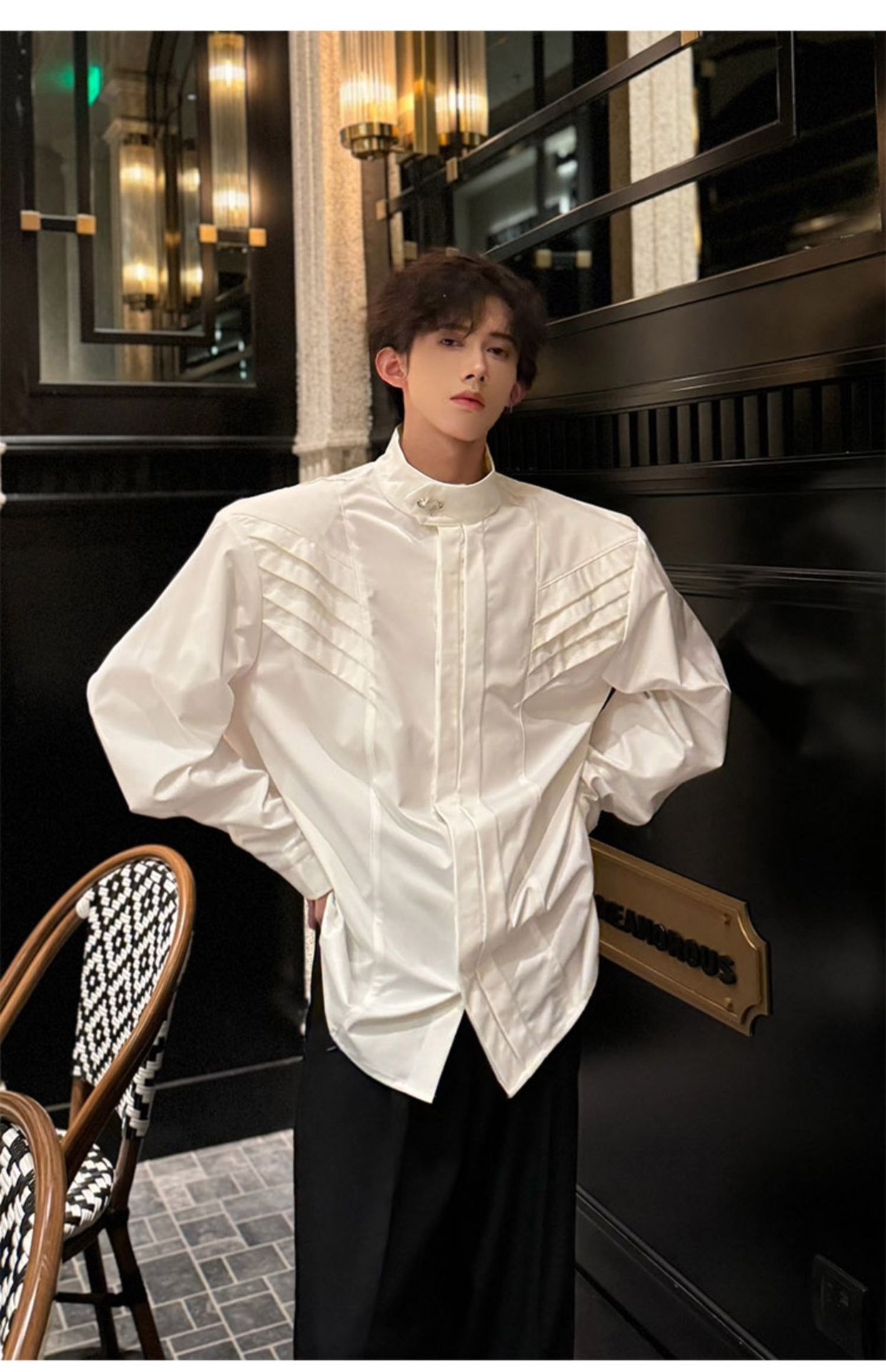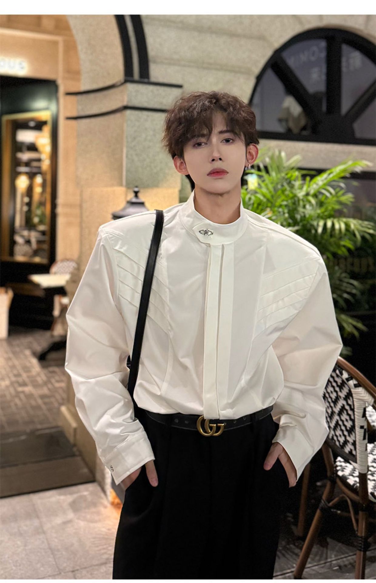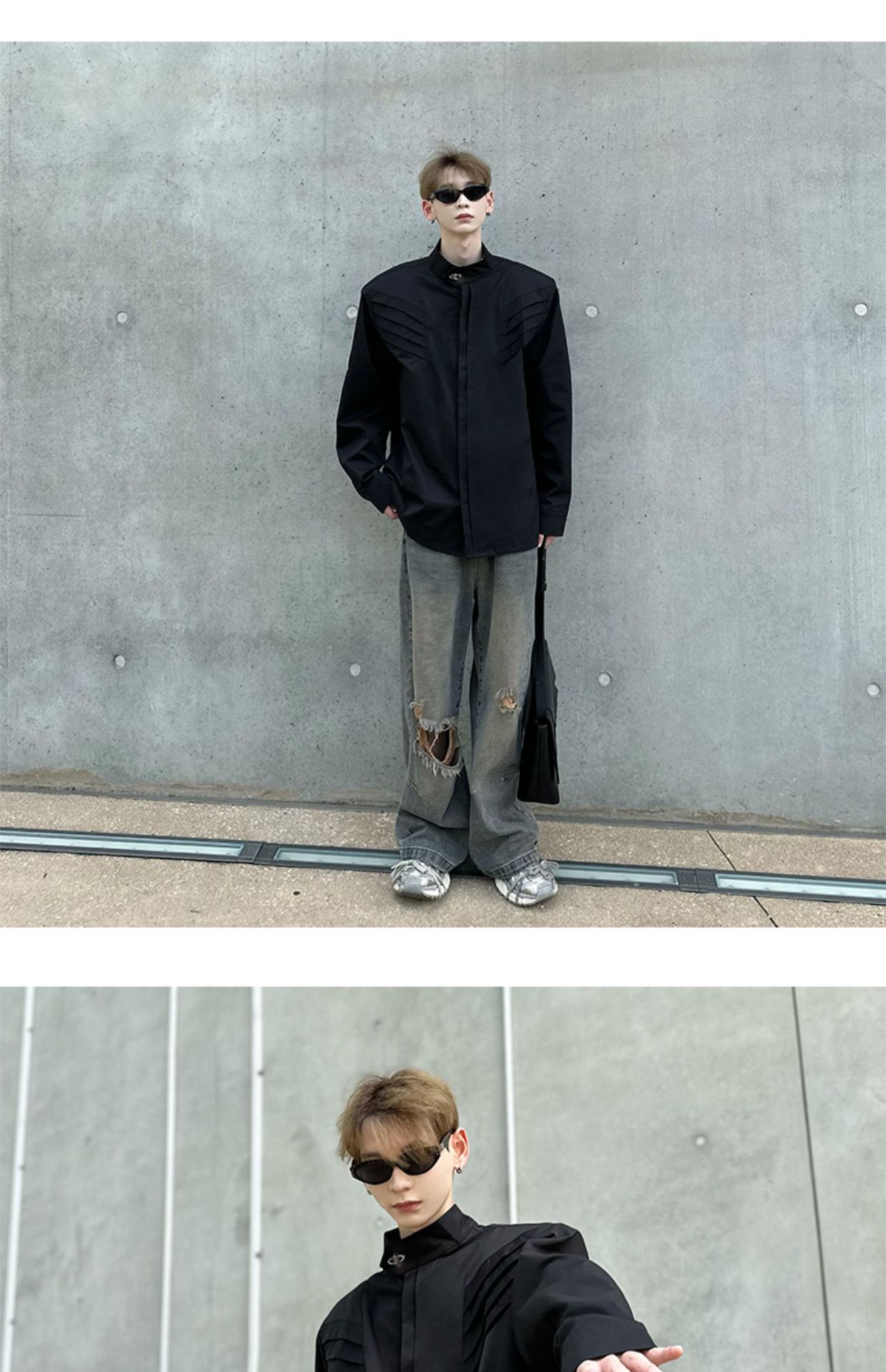 틈새 해체 숄더 패드 셔츠 남성 여름 하이 엔드 센스 디자인 센스 긴팔 셔츠 프로필 스플릿 칼라 재킷