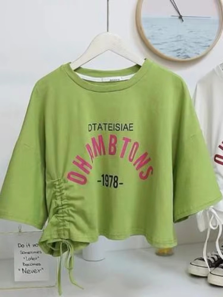 2024 여름 세련된 드로스트링 크롭 탑 여성용 하의 셔츠 디자인 기질 반팔 티셔츠 여성 의류 대외 무역 트렌드스토어 가기