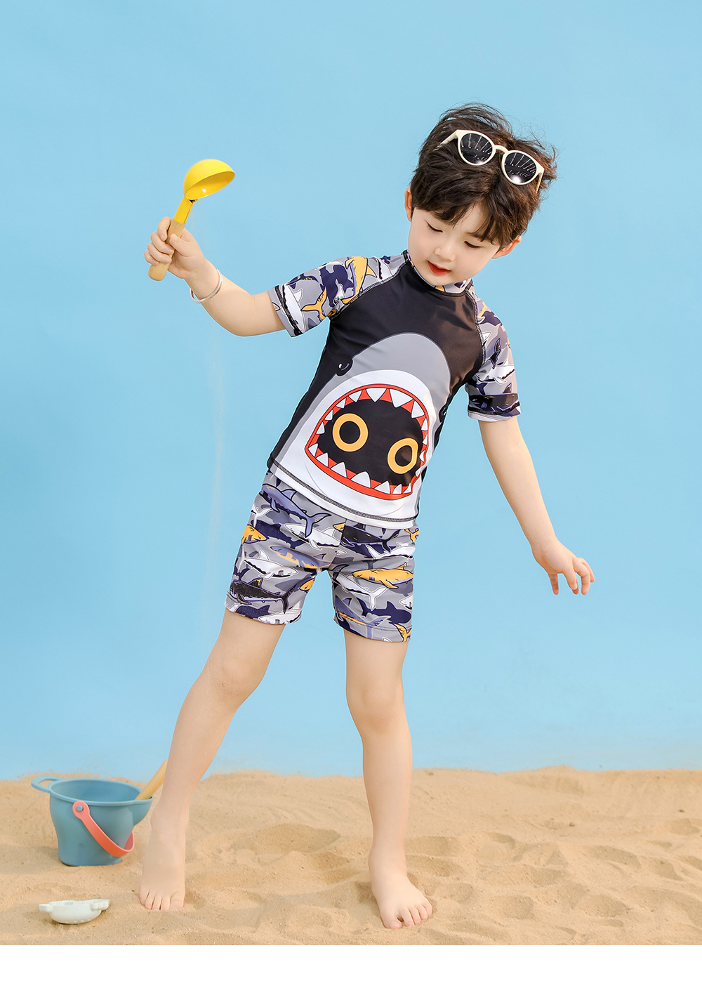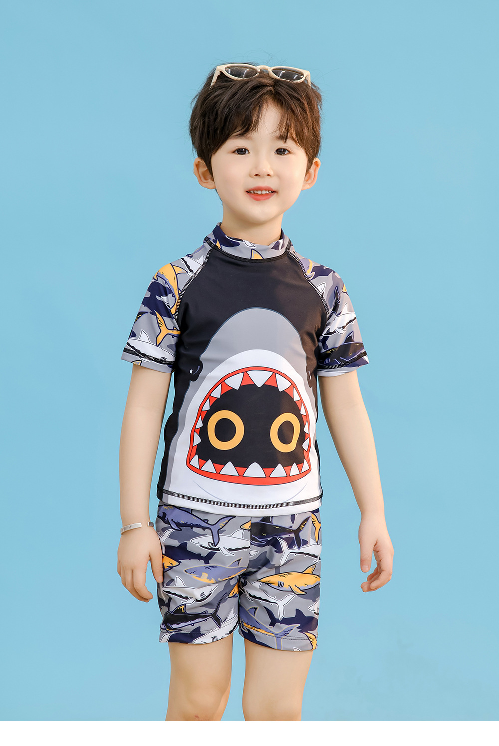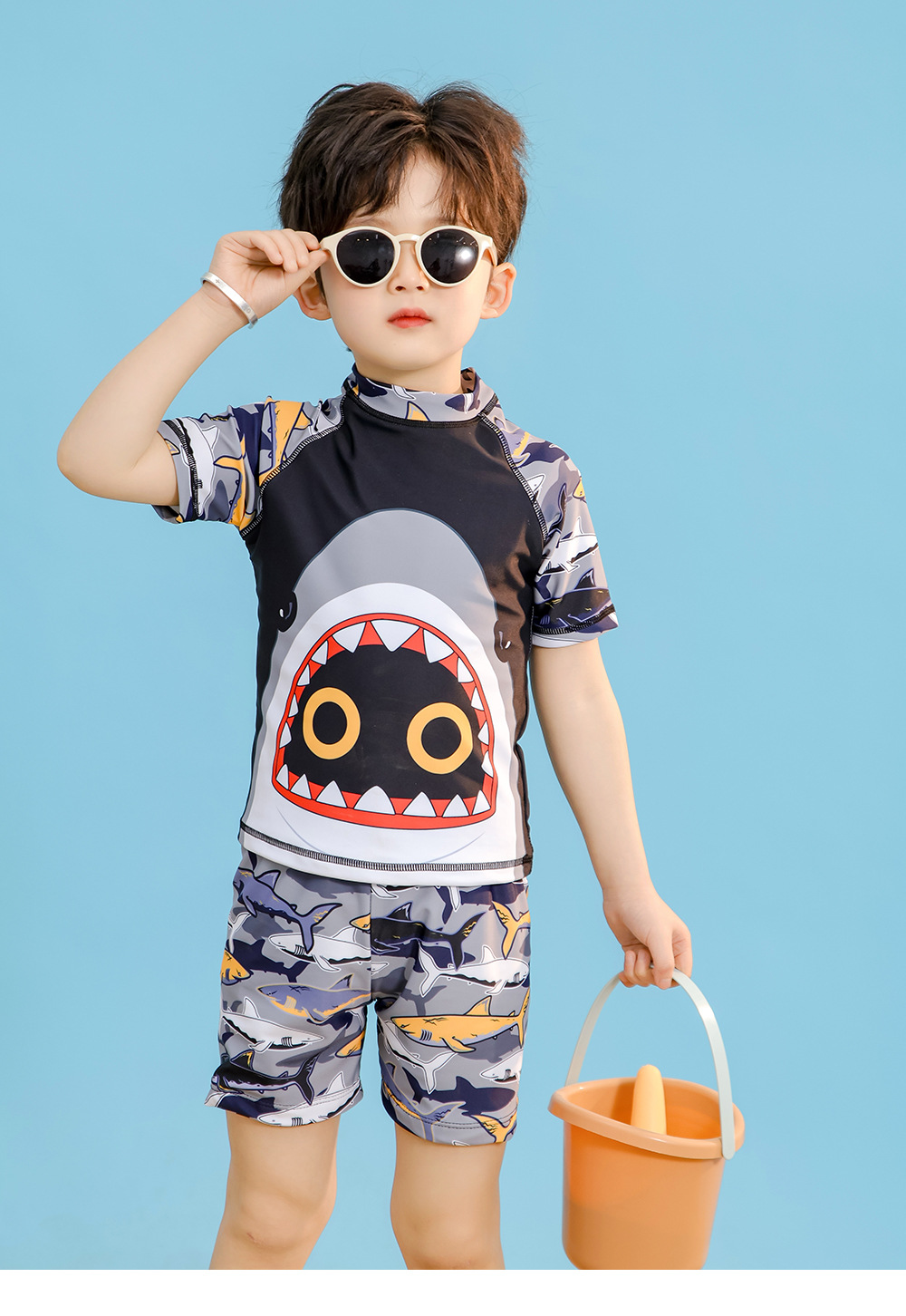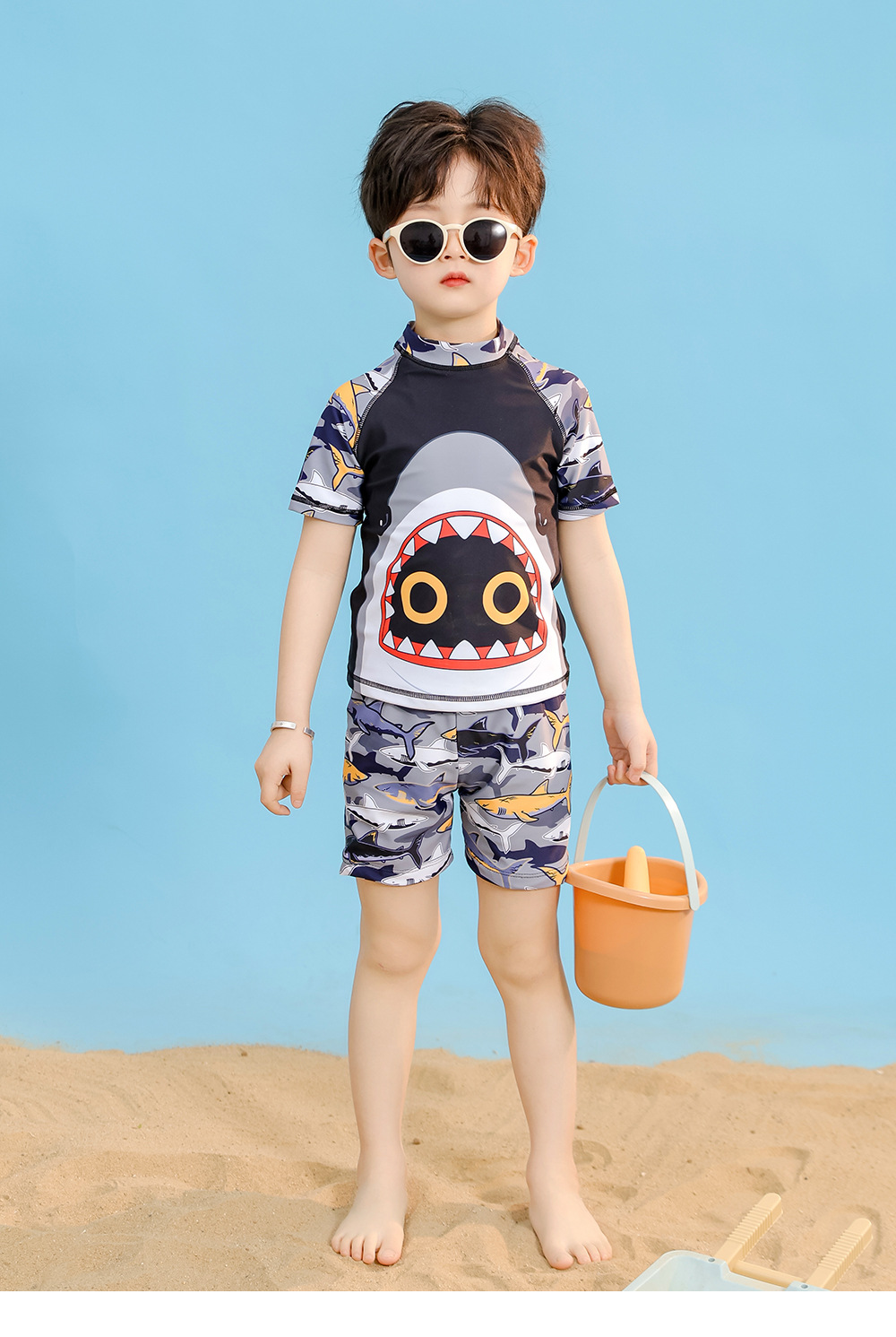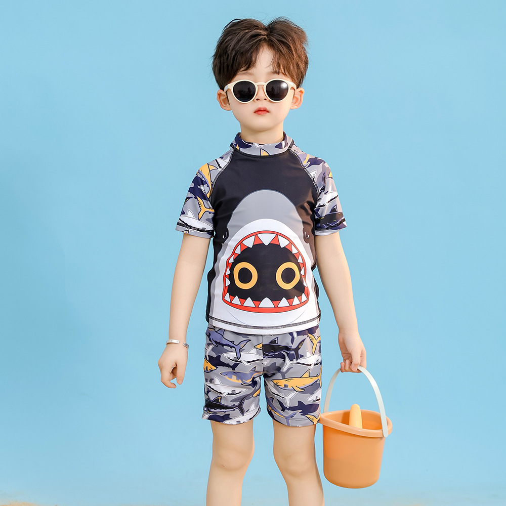 해변 휴가를위한 동물 상어 수영복 해변 세트 도매 2025 어린이 수영복 소년 분할 한국판스토어 가기