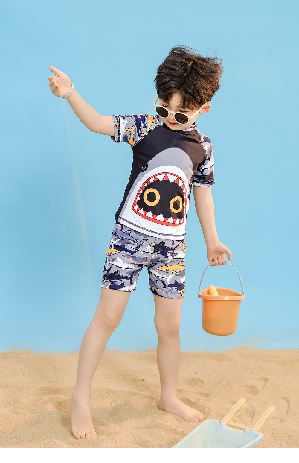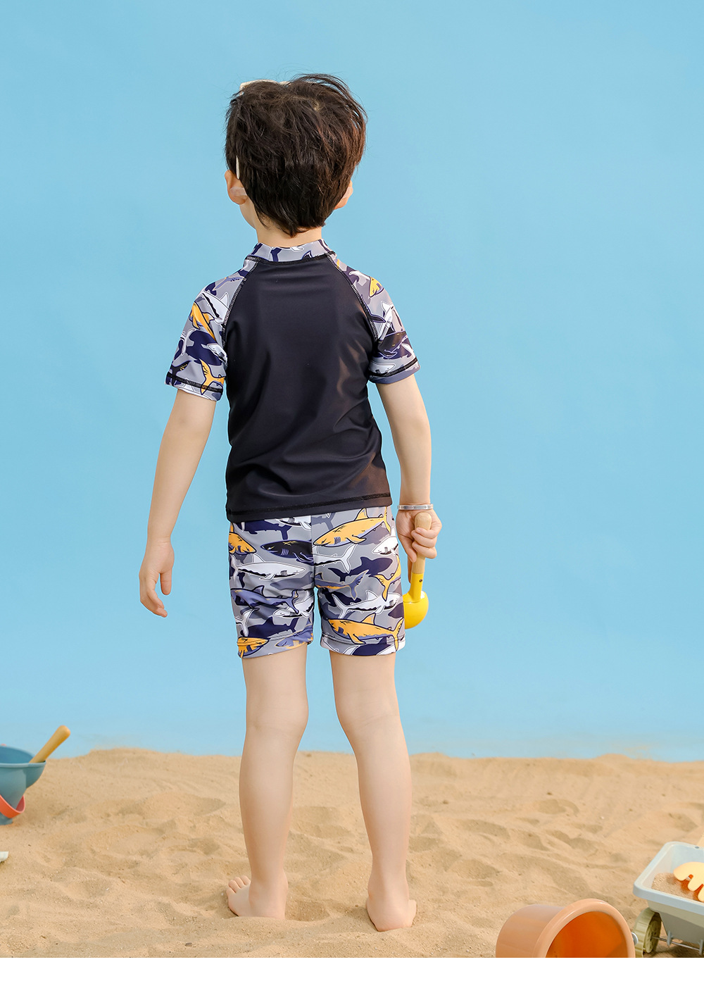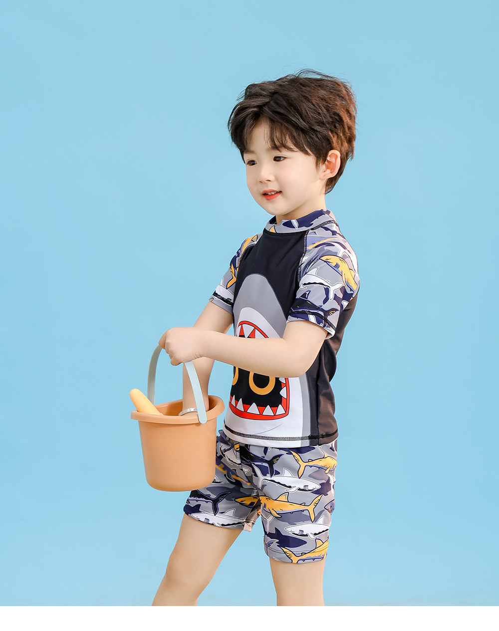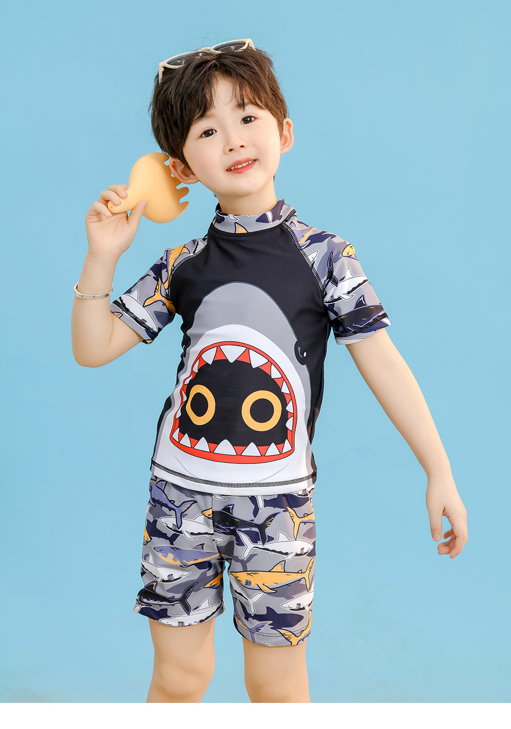 해변 휴가를위한 동물 상어 수영복 해변 세트 도매 2025 어린이 수영복 소년 분할 한국판스토어 가기
