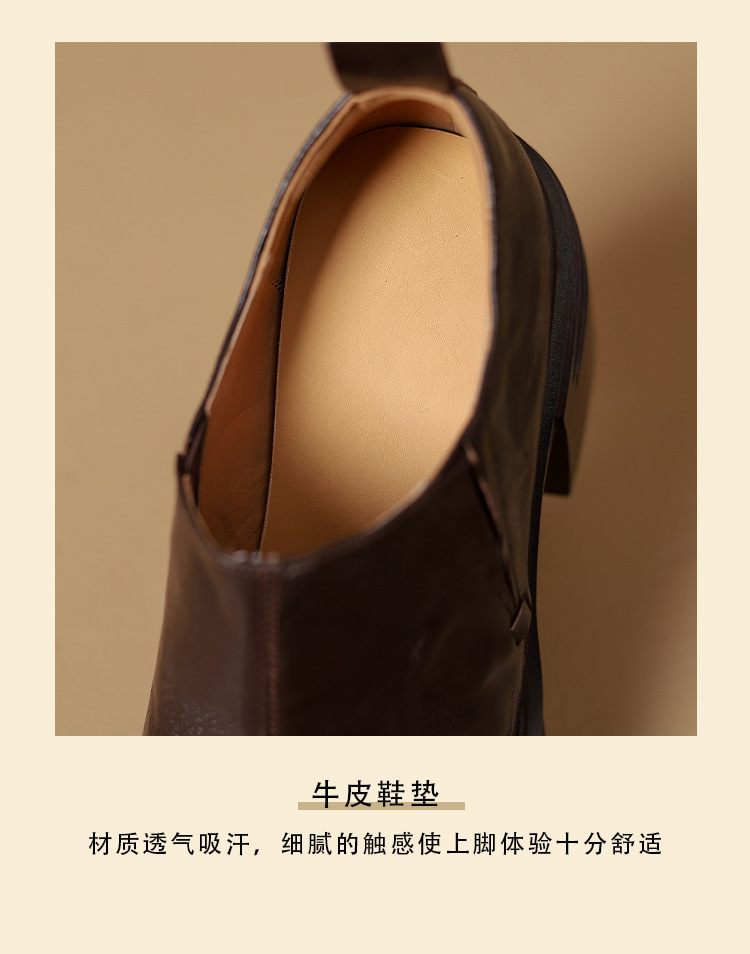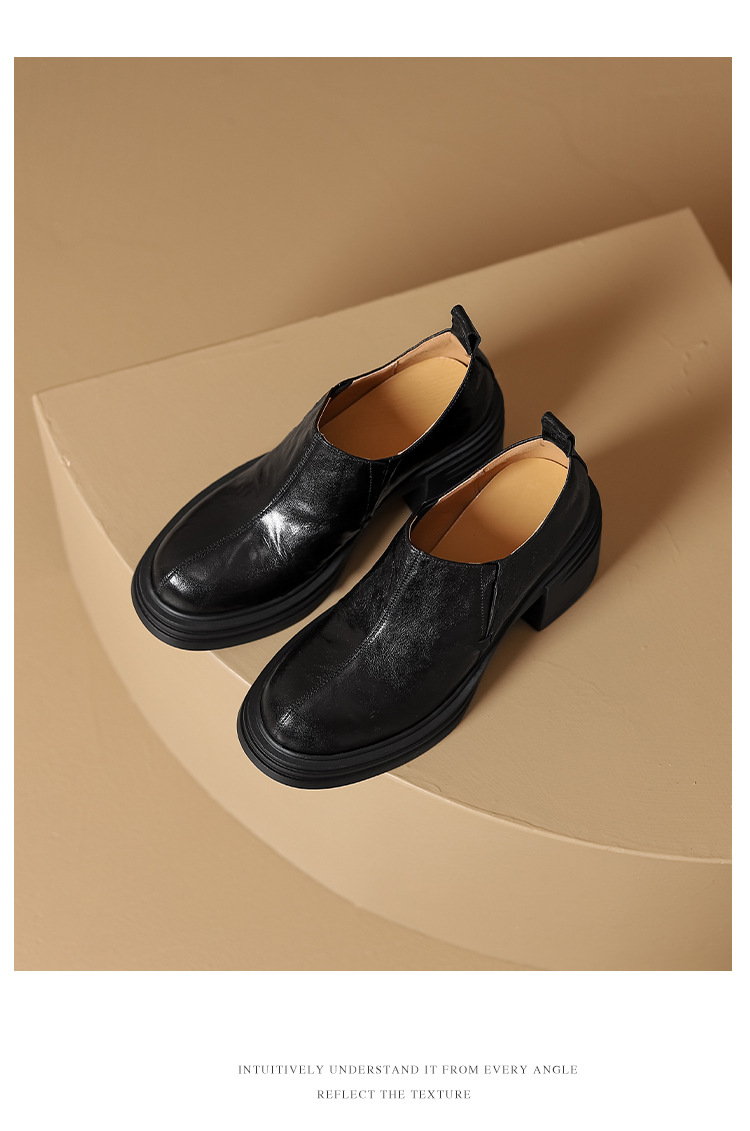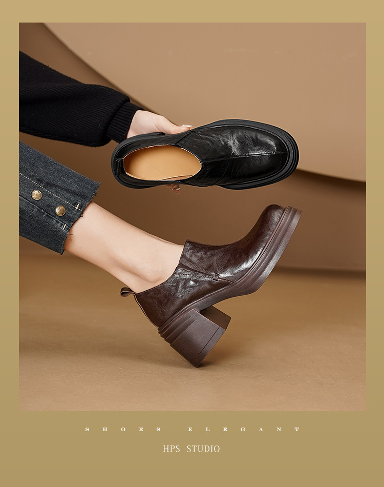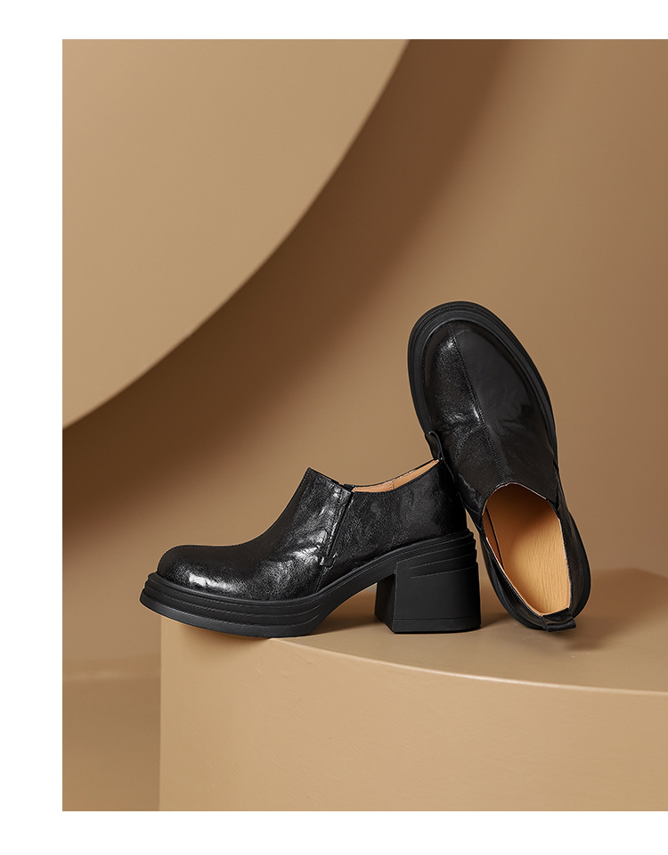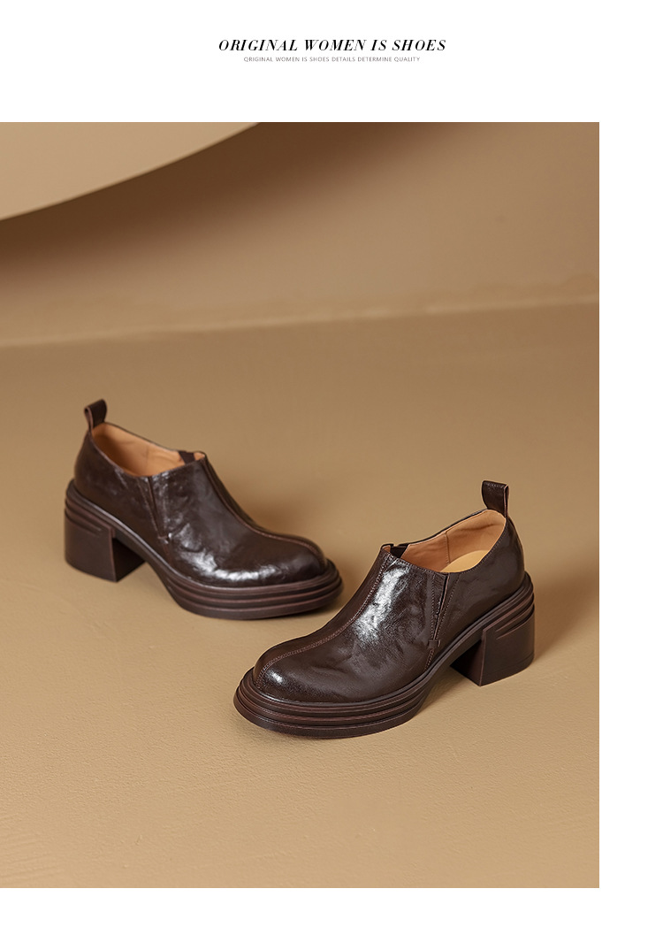 7CM 패션 양가죽 우아한 깊은 입 싱글 신발 여성의 2025 봄 새로운 라운드 헤드 두꺼운 힐 슬립 온 하이힐 가죽 신발