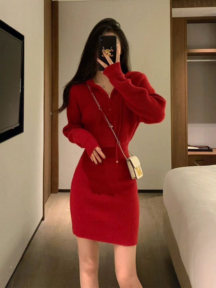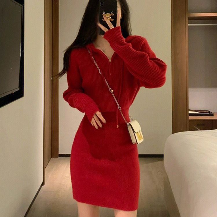 레드 크리스마스 새해 가운 후드 하프 지퍼 니트 스웨터 원피스 여성 레트로 우아한 힙합 스커트