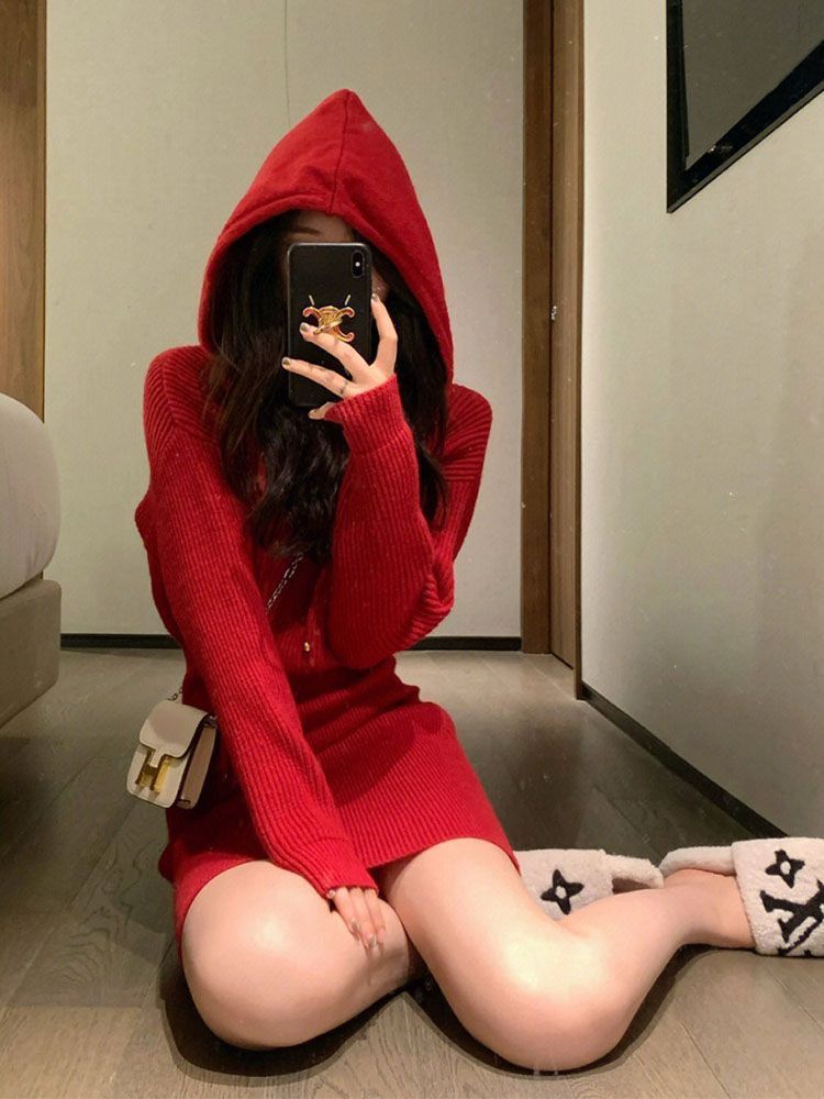 레드 크리스마스 새해 가운 후드 하프 지퍼 니트 스웨터 원피스 여성 레트로 우아한 힙합 스커트스토어 가기