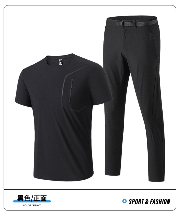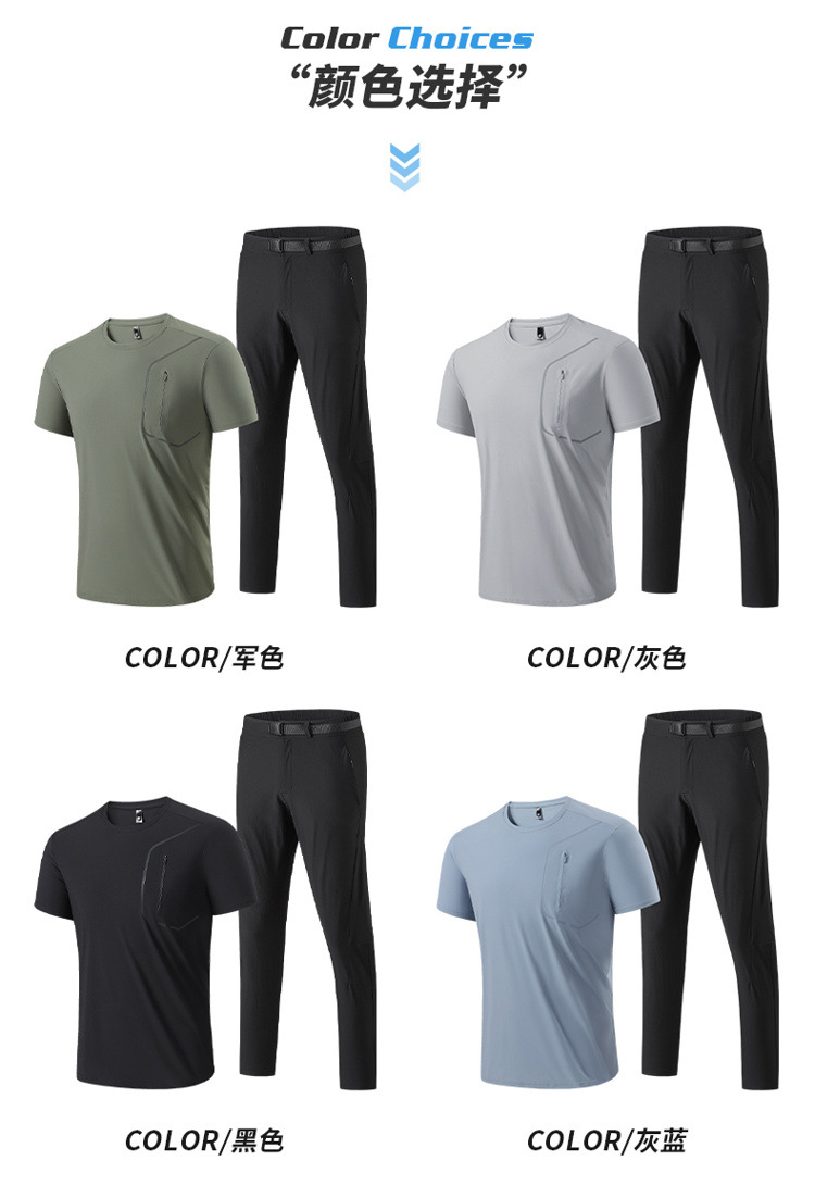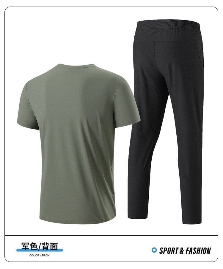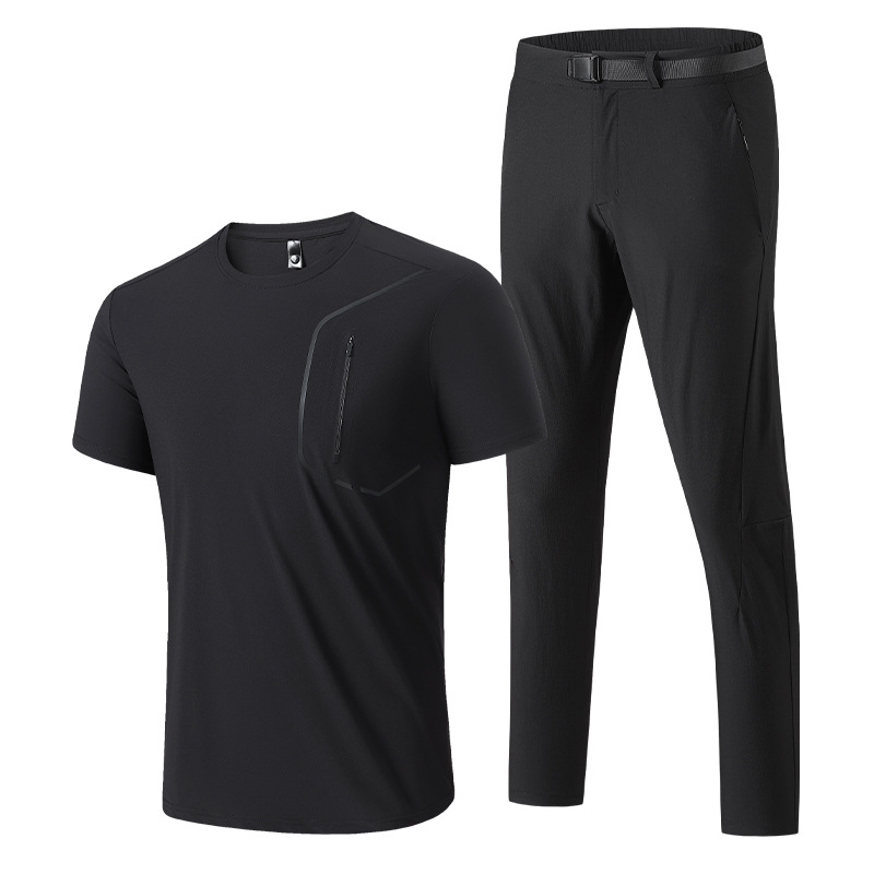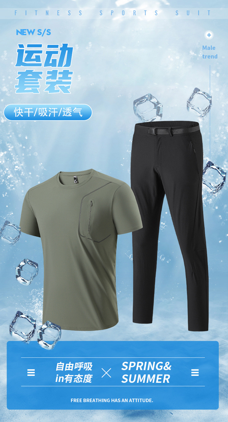 국경 간 아이스 실크 세트 남자 여름 통기성 탄성 빠른 건조 쿨 티셔츠 바지 캐주얼 스포츠 빠른 건조 투피스 세트
