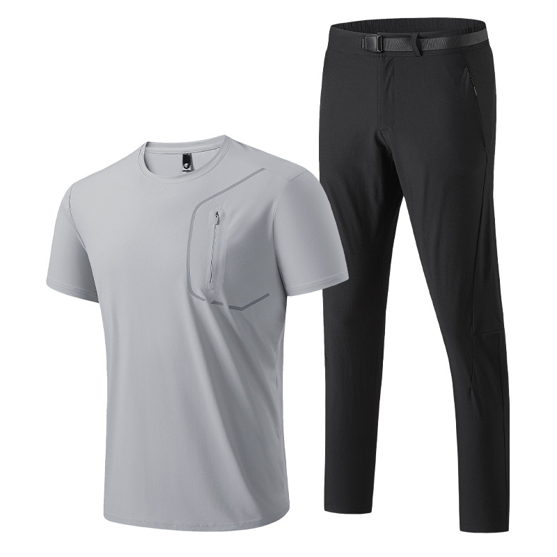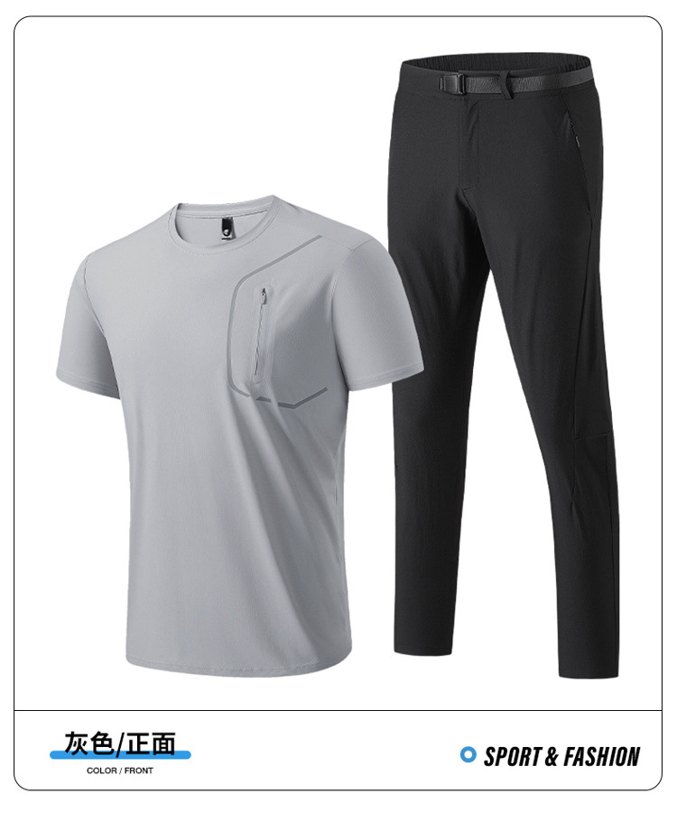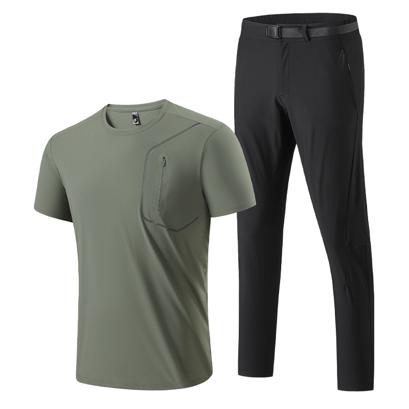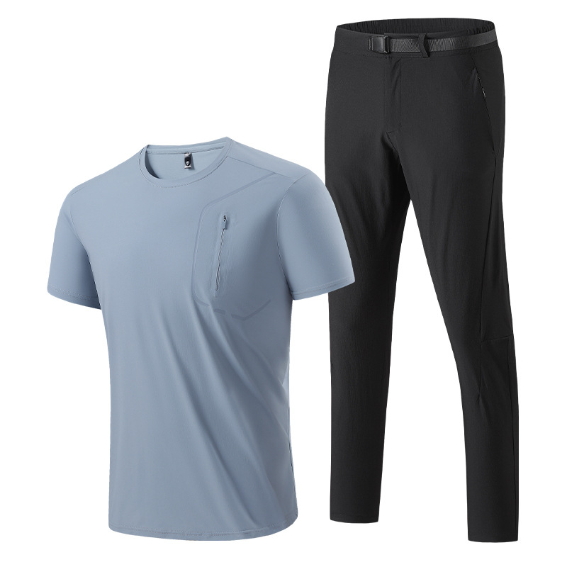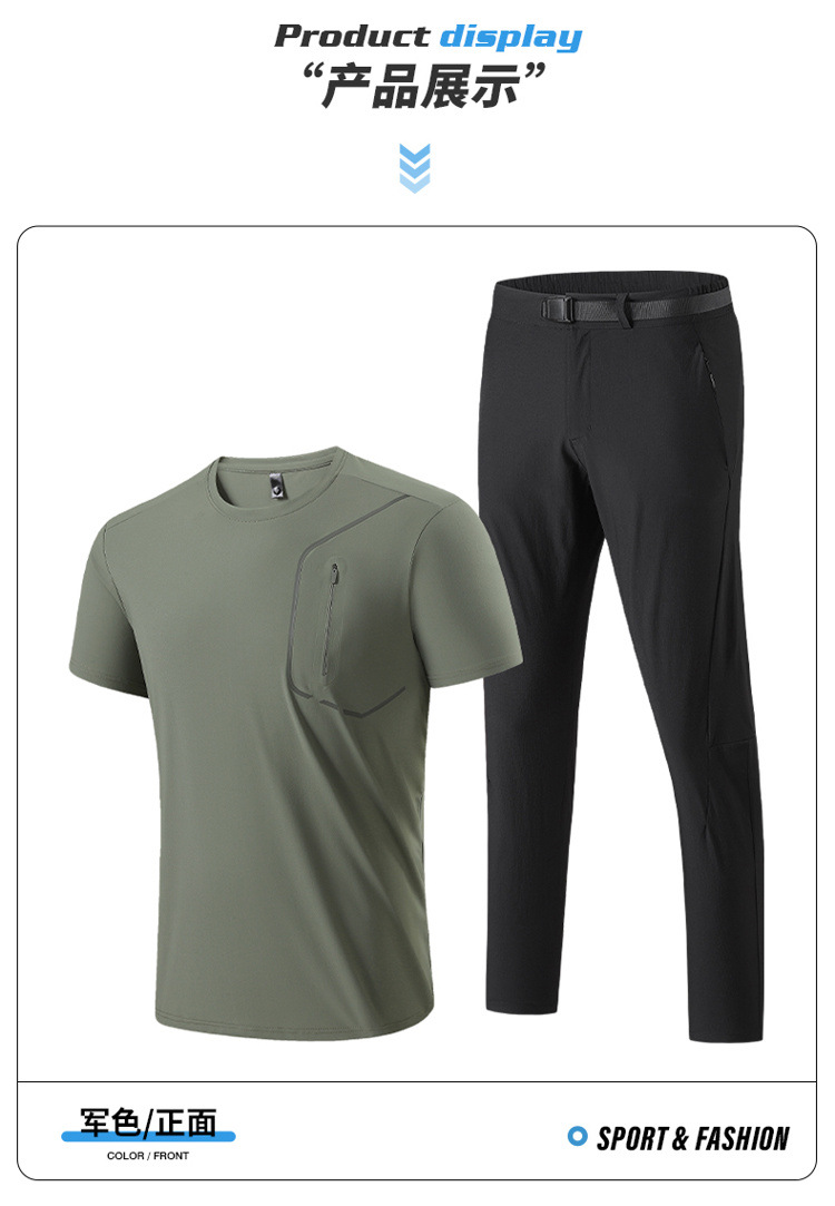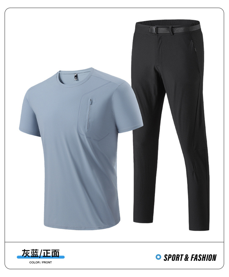 국경 간 아이스 실크 세트 남자 여름 통기성 탄성 빠른 건조 쿨 티셔츠 바지 캐주얼 스포츠 빠른 건조 투피스 세트