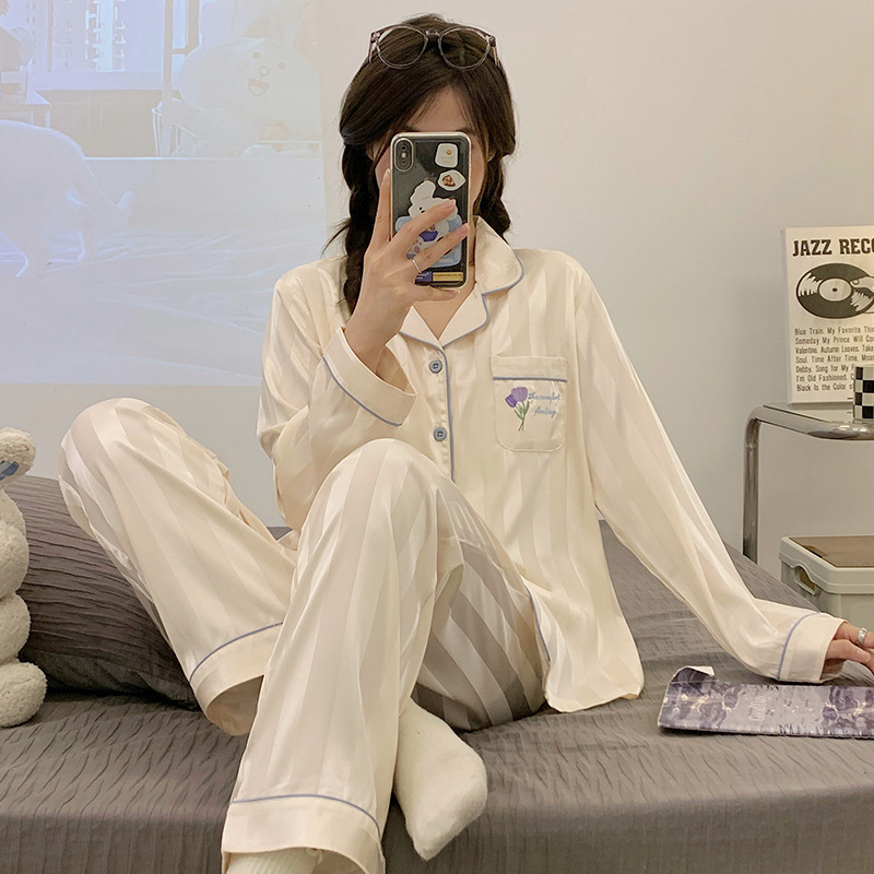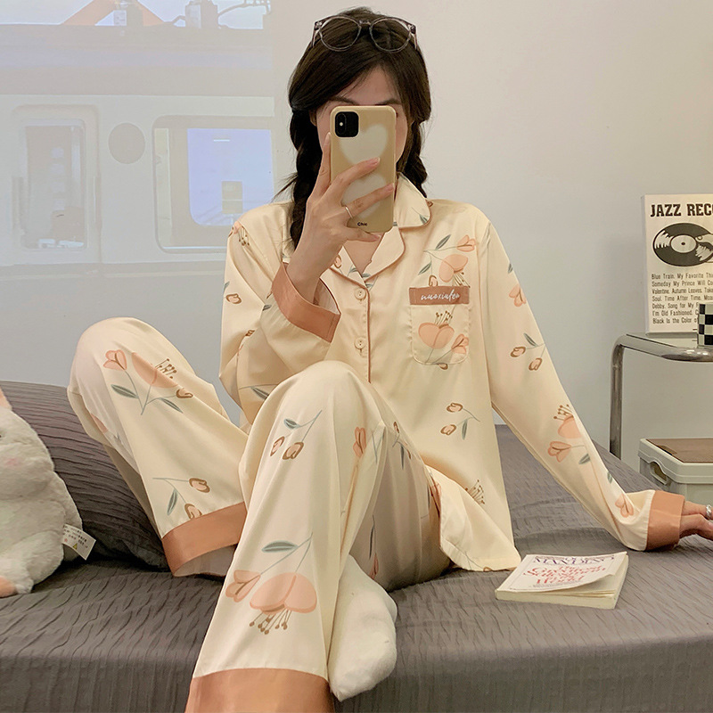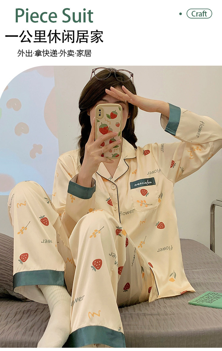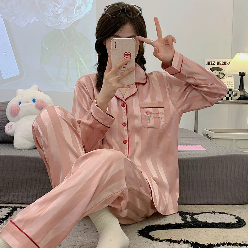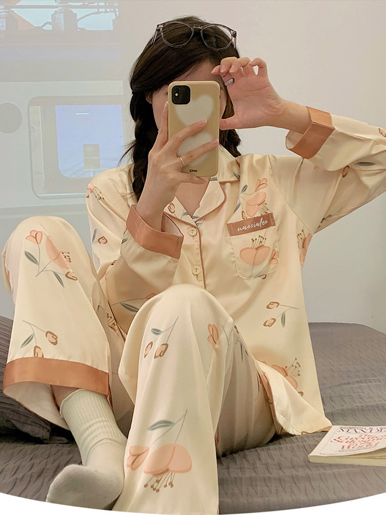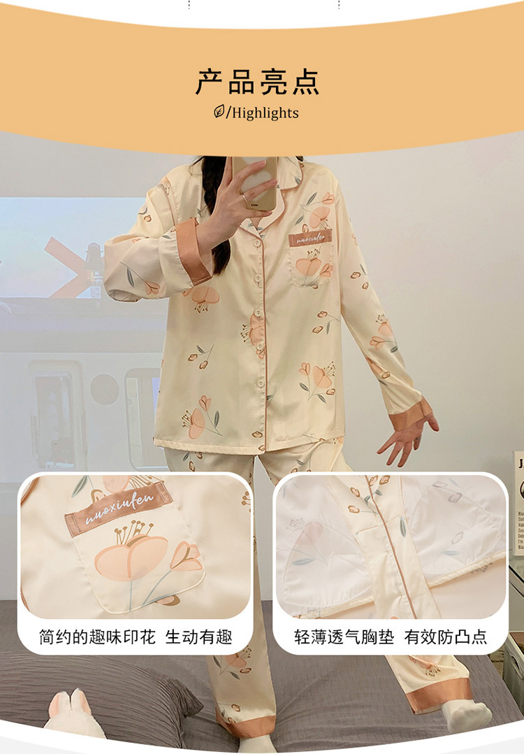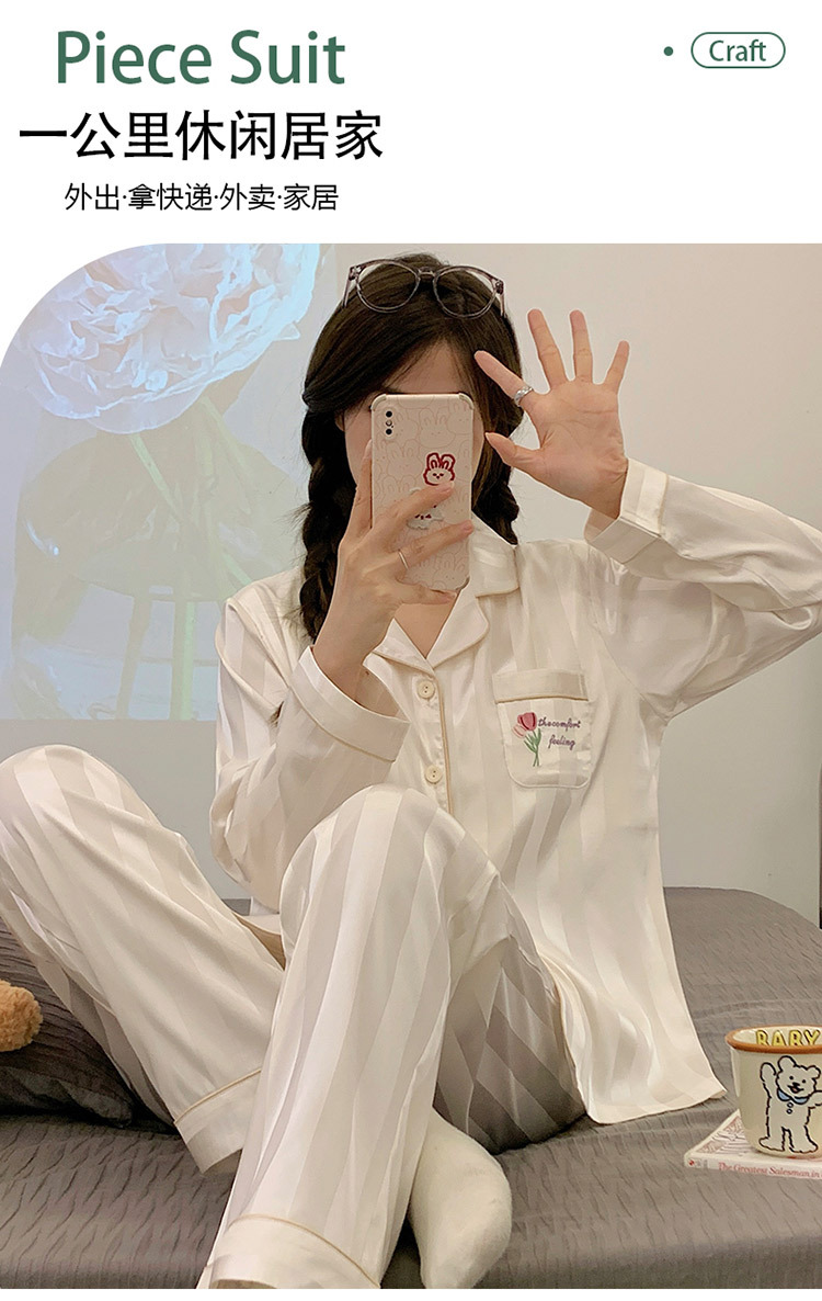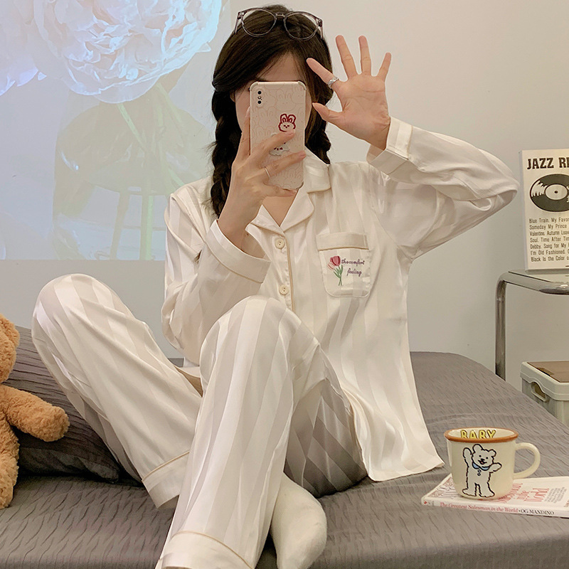 봄 가을 잠옷 여성의 봄과 가을 가슴 패드 아이스 실크 긴 소매 세트 여성의 2025 새로운 모방 실크 홈 옷스토어 가기