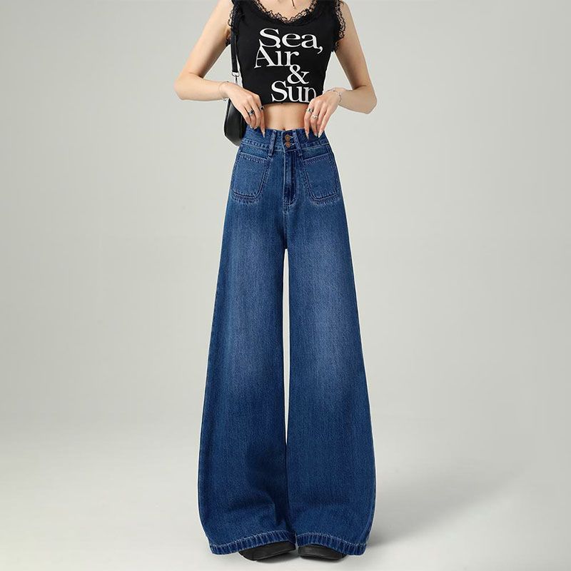 2025 우아한 탄성 청바지 느슨한 넓은 다리 바지 새로운 디자인 센스 두 버클 통근 올 매치 여성 패션스토어 가기