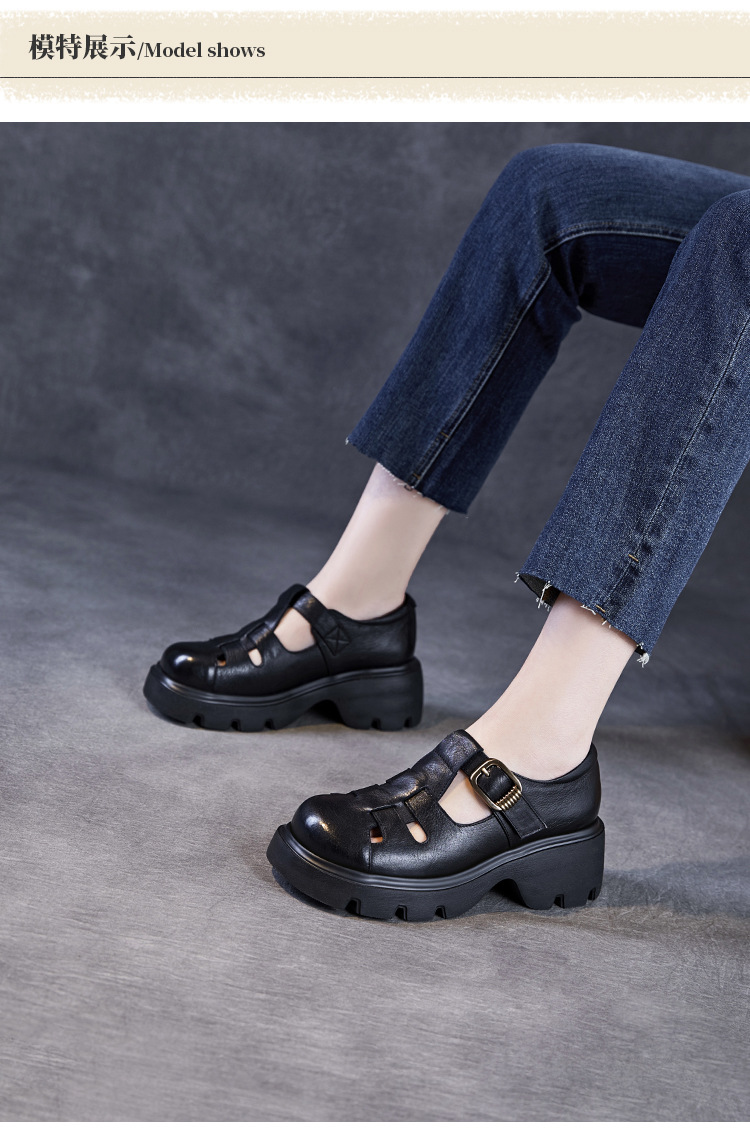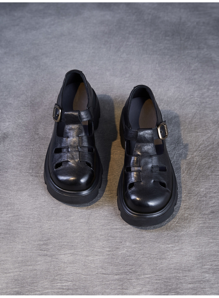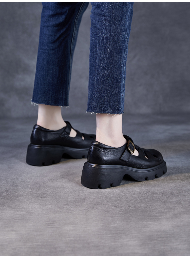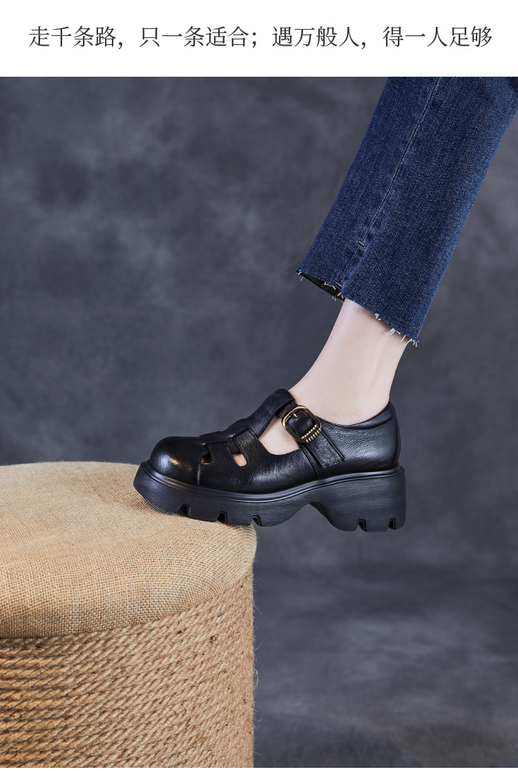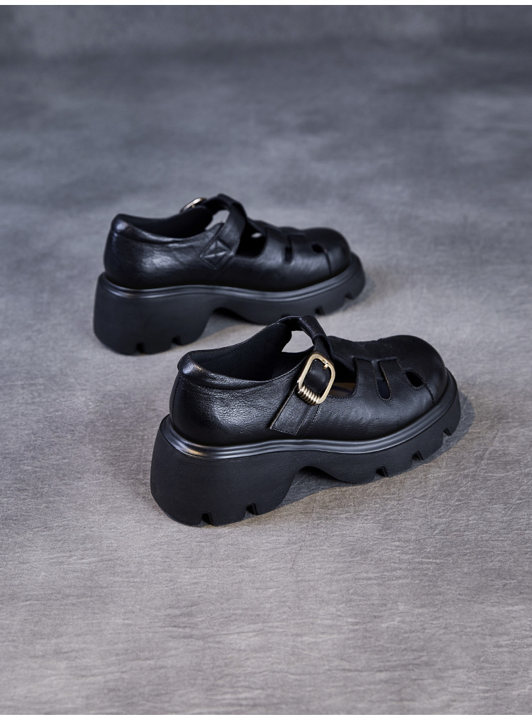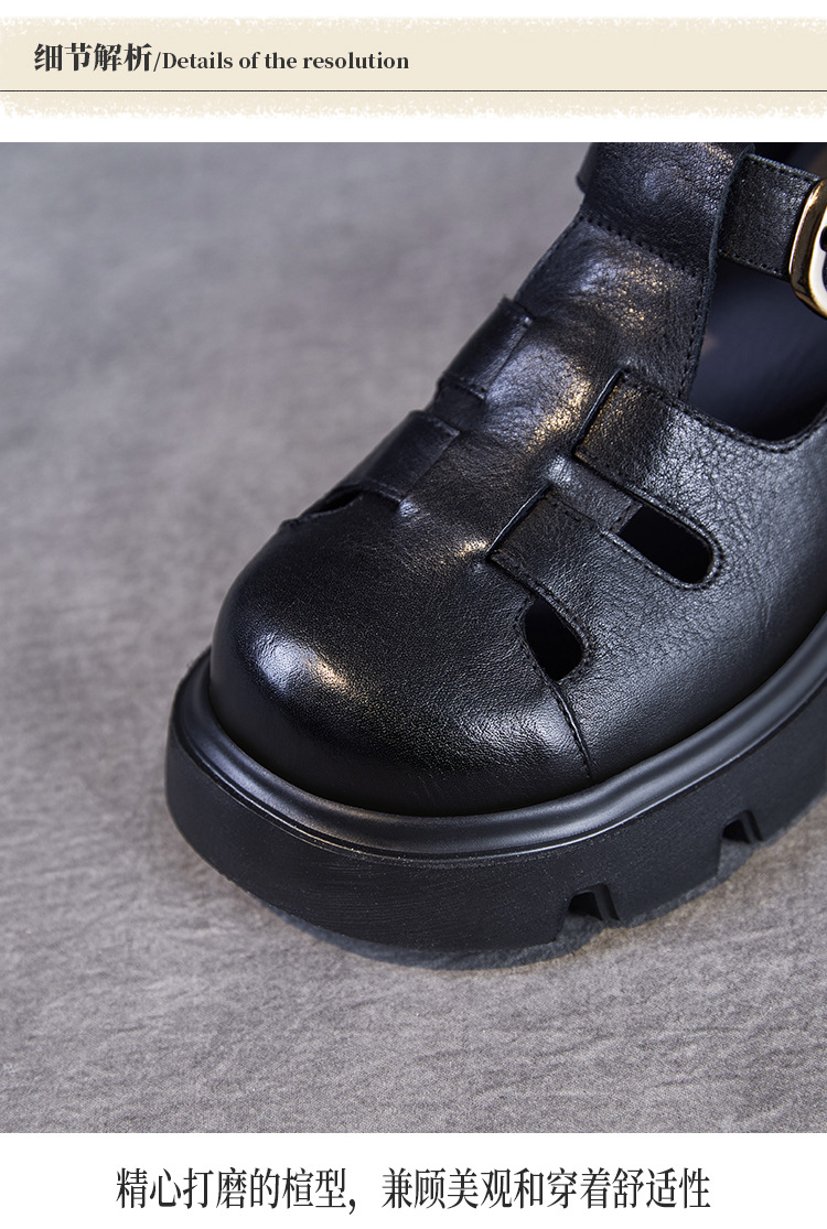미국에, 2025 년 봄과 여름 가죽 속이 빈 로마 샌들의 첫 번째 레이어 머핀 두꺼운 밑창 짠 돼지 케이지 신발