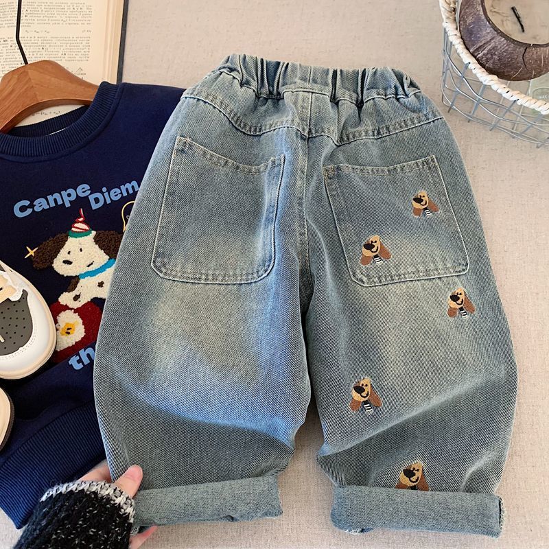 소년 청바지 2025 가을 새로운 스타일 어린이 중공업 자수 라이트 블루 캐주얼 인 당근 바지 바지 유행