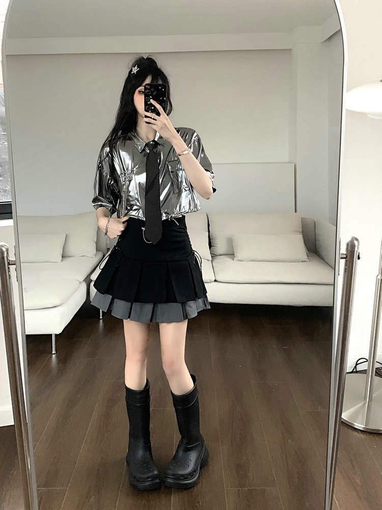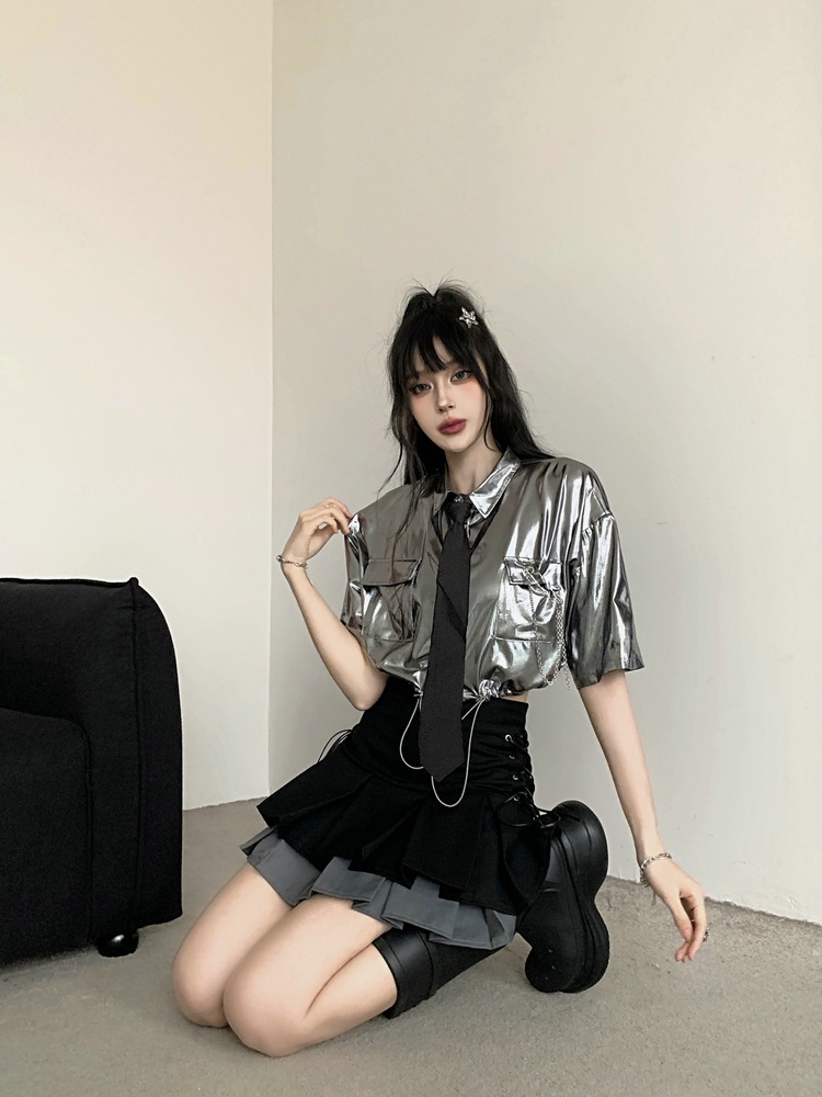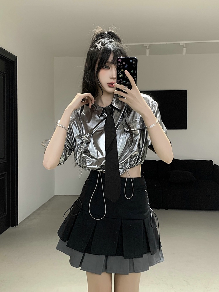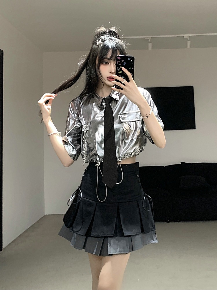 시니어 여성 그룹 실버 우아한 반팔 체인 셔츠 여성의 높은 허리 니치 드로우 스트링 스티칭 주름 치마 투피스 세트