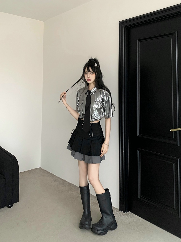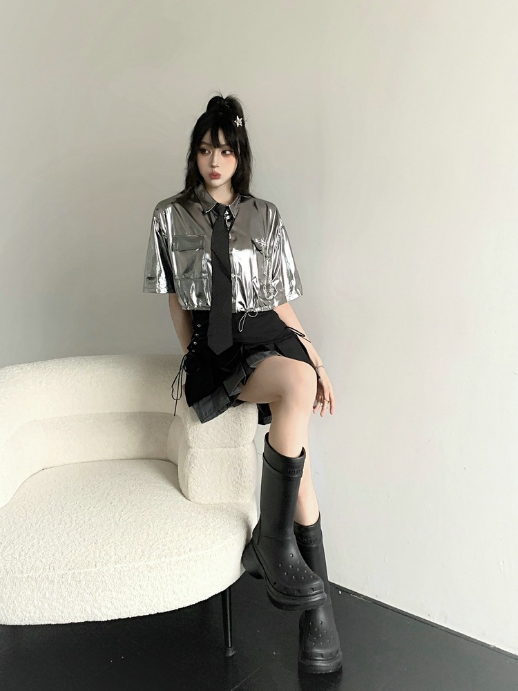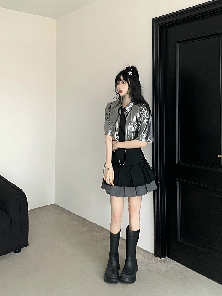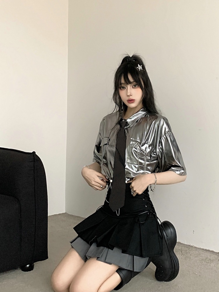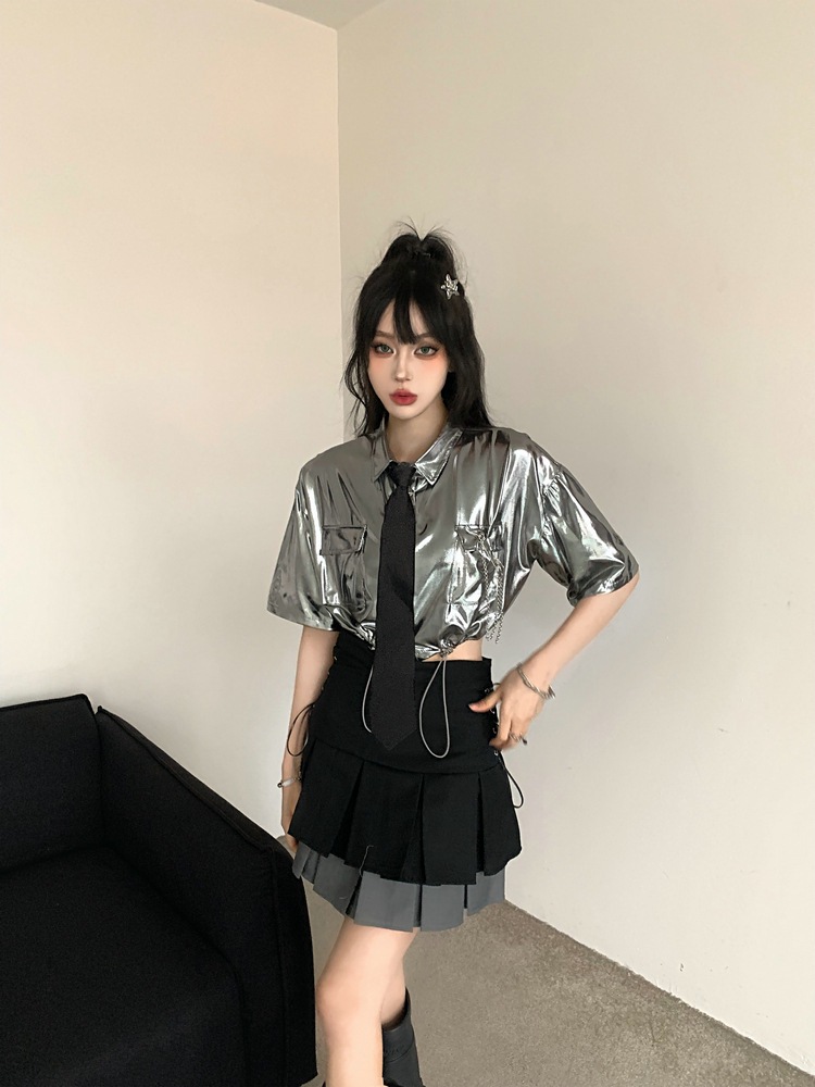 시니어 여성 그룹 실버 우아한 반팔 체인 셔츠 여성의 높은 허리 니치 드로우 스트링 스티칭 주름 치마 투피스 세트