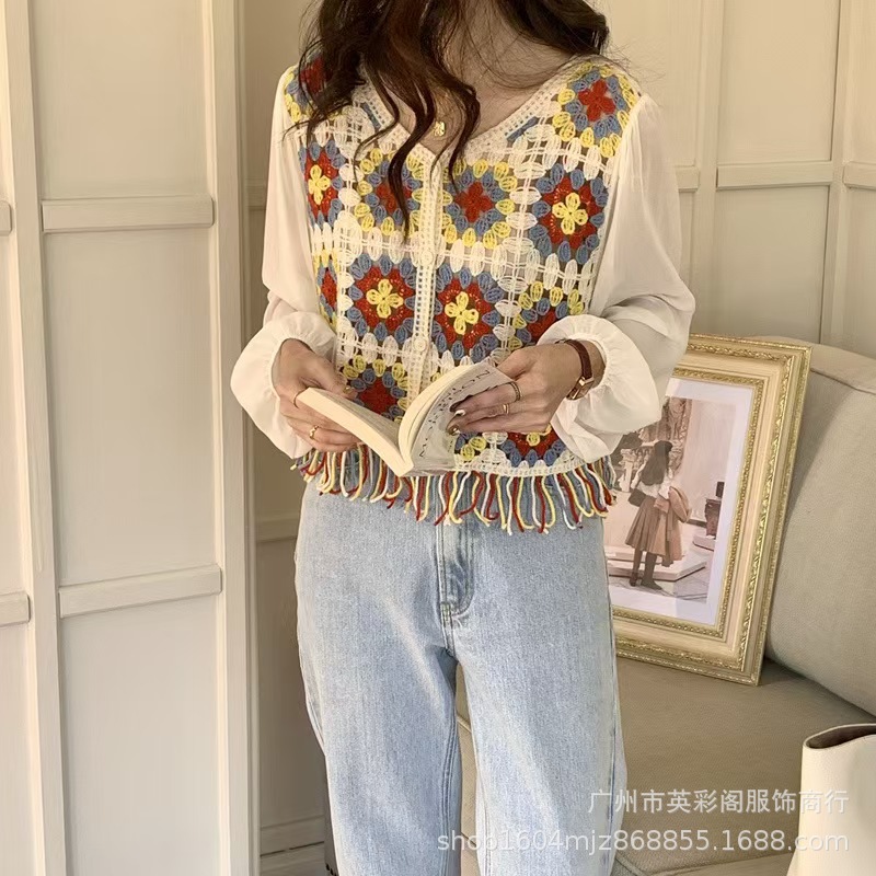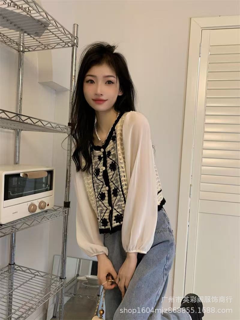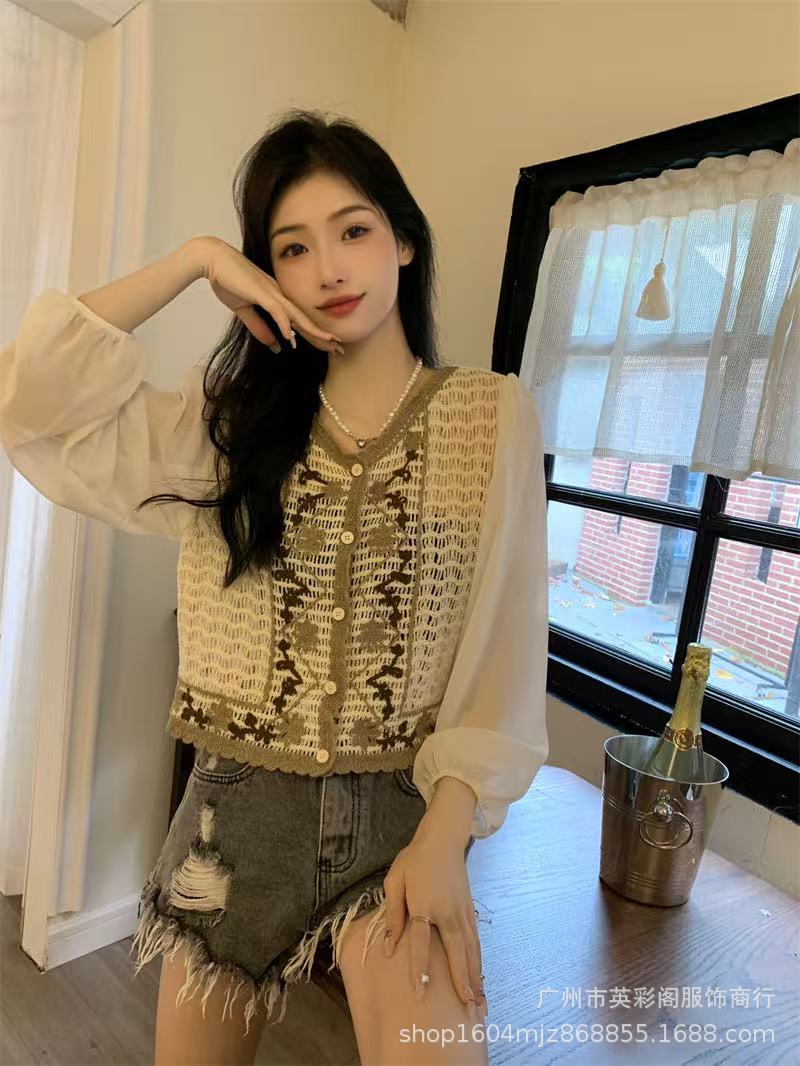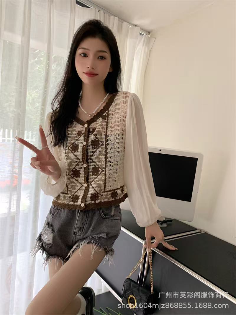 쉬폰 슬리브 스티칭 프린지 니트 카디건 여성용 밀크웨어 이른 봄 코트 프렌치 V-Neck Hollow Crochet Top