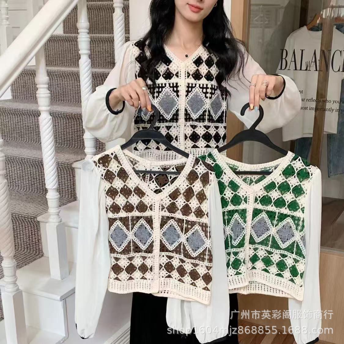 쉬폰 슬리브 스티칭 프린지 니트 카디건 여성용 밀크웨어 이른 봄 코트 프렌치 V-Neck Hollow Crochet Top스토어 가기