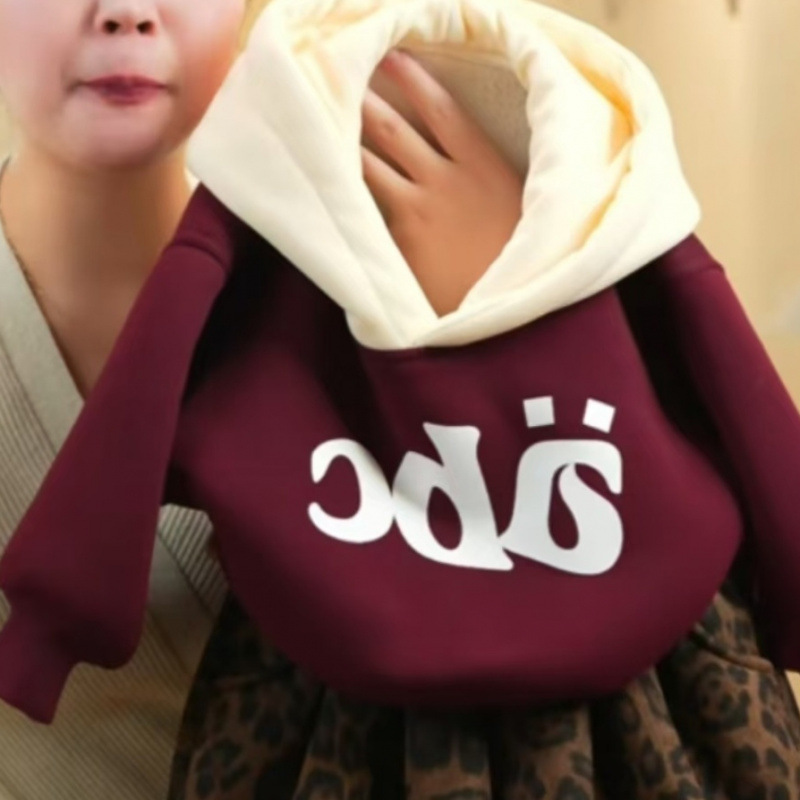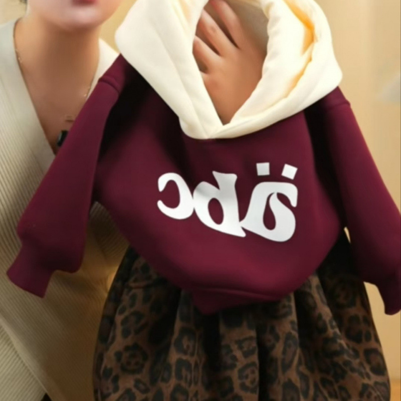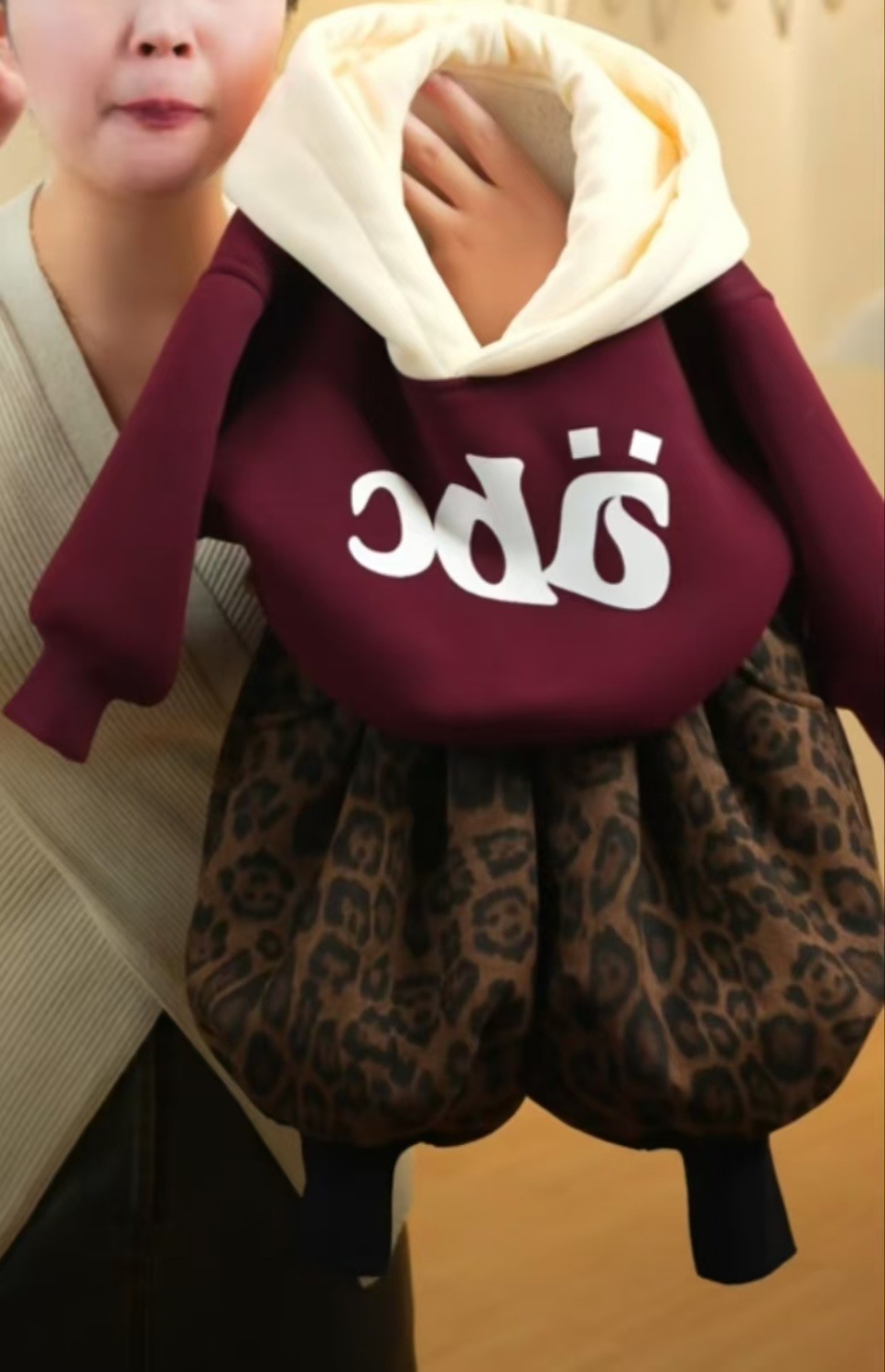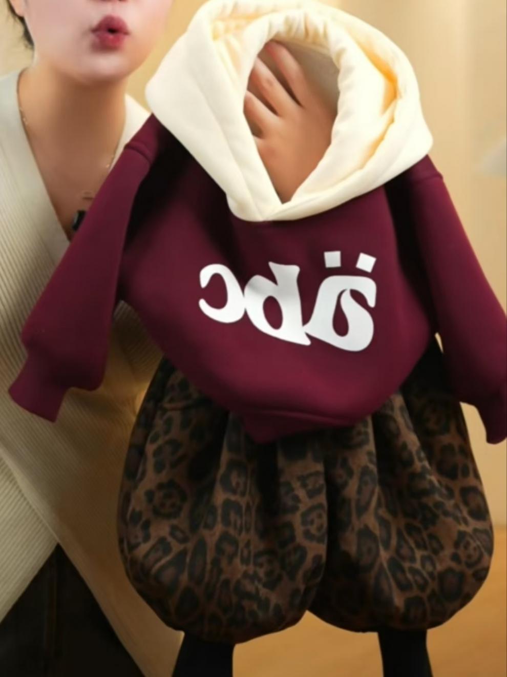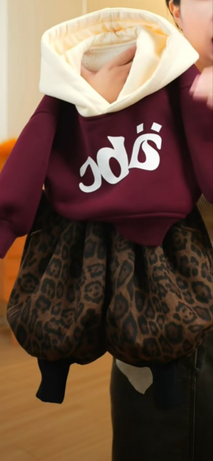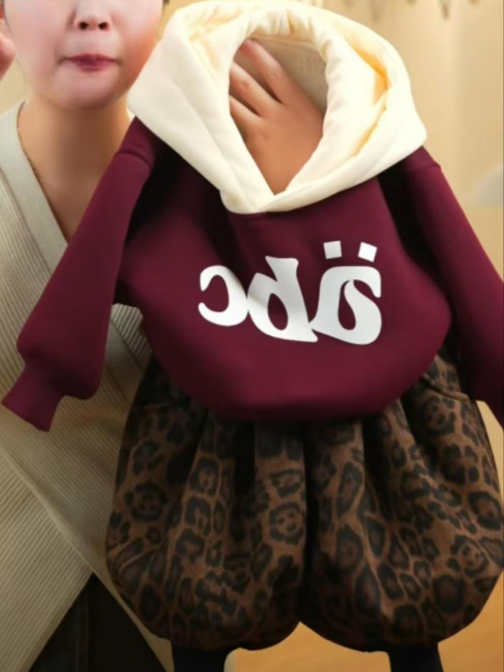 어린이 겨울 새로운 한국식 스티칭 대조 후드 기모 땀 레오파드 프린트 기모 두꺼운 블루머스 투피스 세트