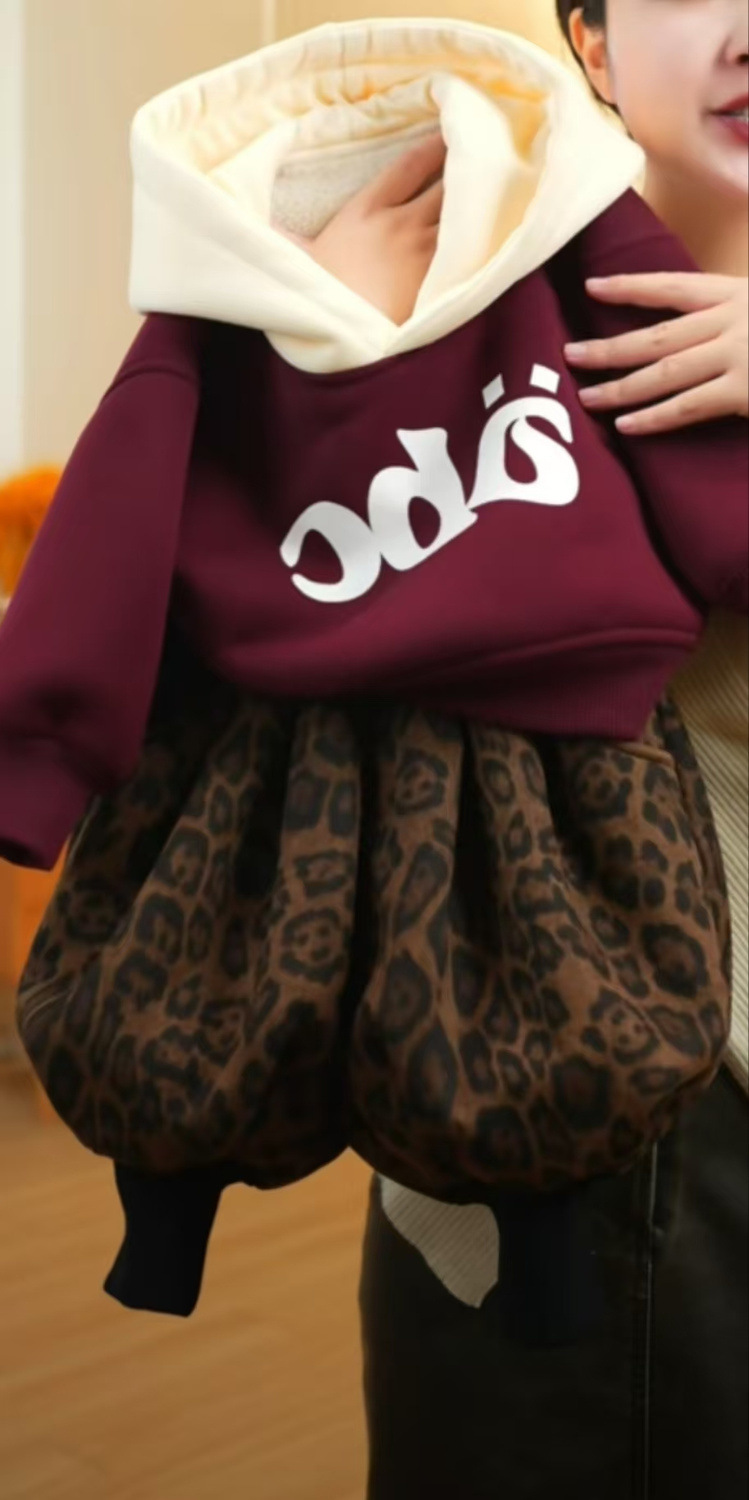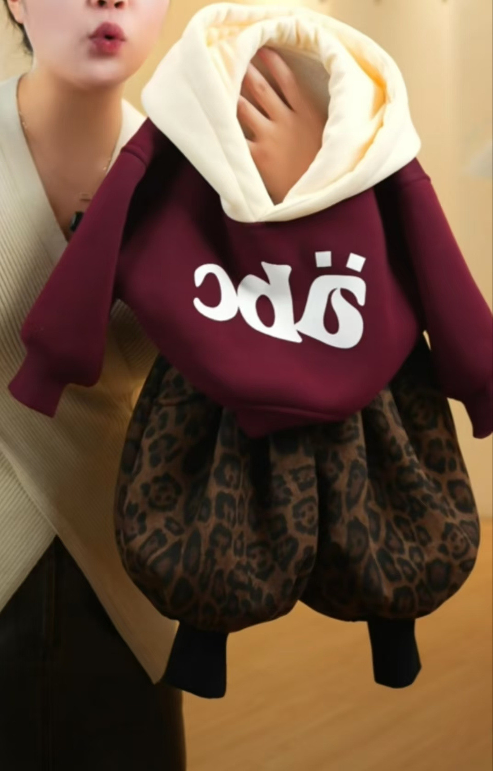 어린이 겨울 새로운 한국식 스티칭 대조 후드 기모 땀 레오파드 프린트 기모 두꺼운 블루머스 투피스 세트스토어 가기