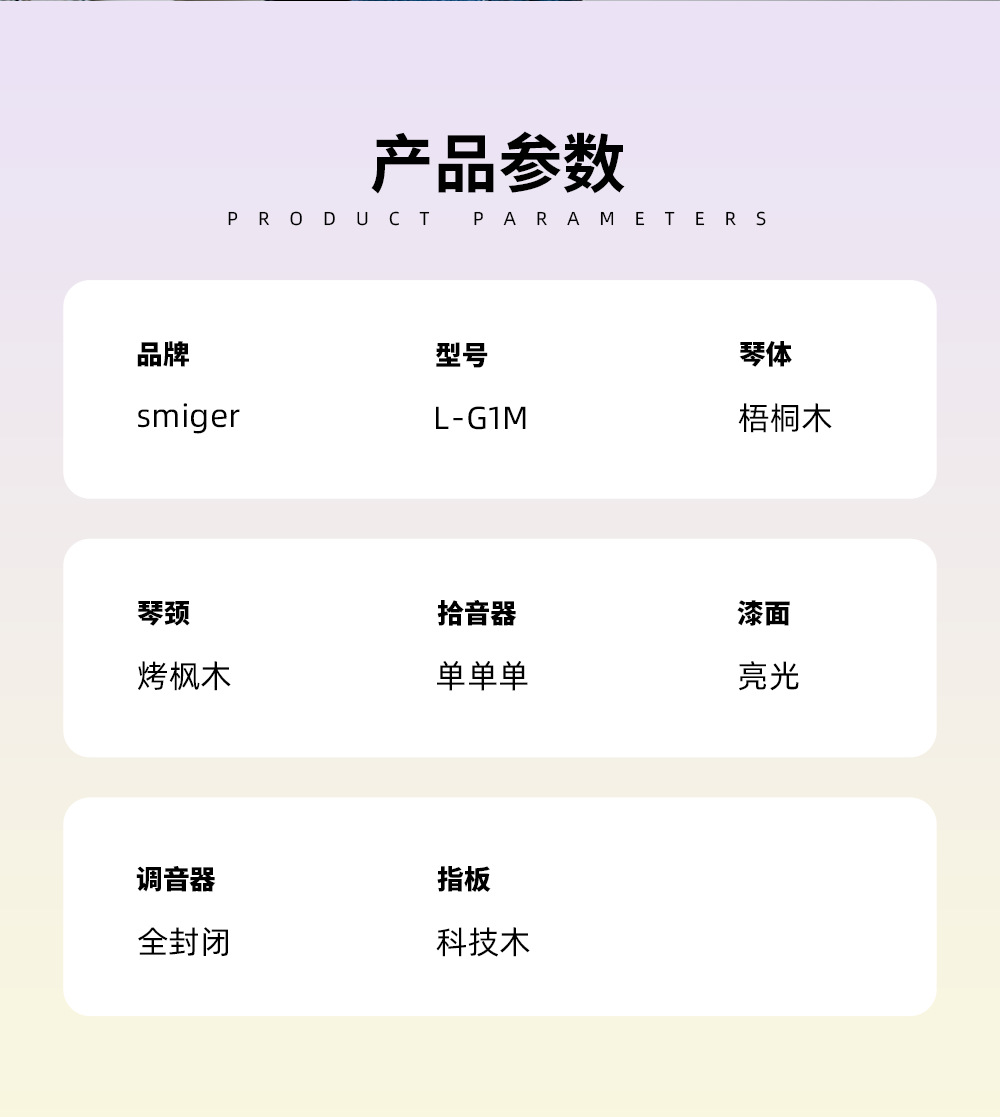 材质:梧桐木琴体,科技木指板,烤枫木琴颈