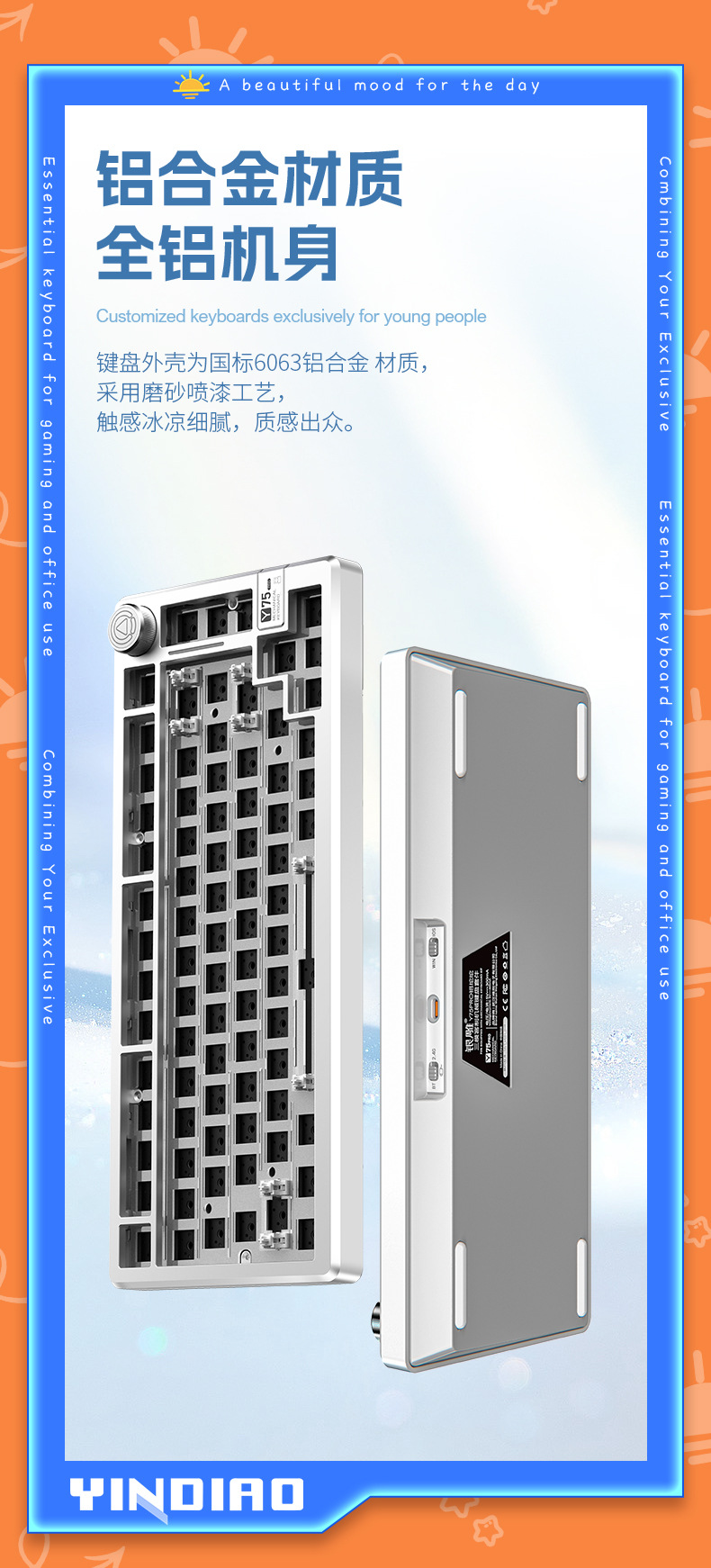 실버 조각 Y75Pro 알루미늄 Tuo Tuo 블루투스 무선 3 모드 기계 키보드 E-스포츠 게임 컴퓨터 금속 유선 키트