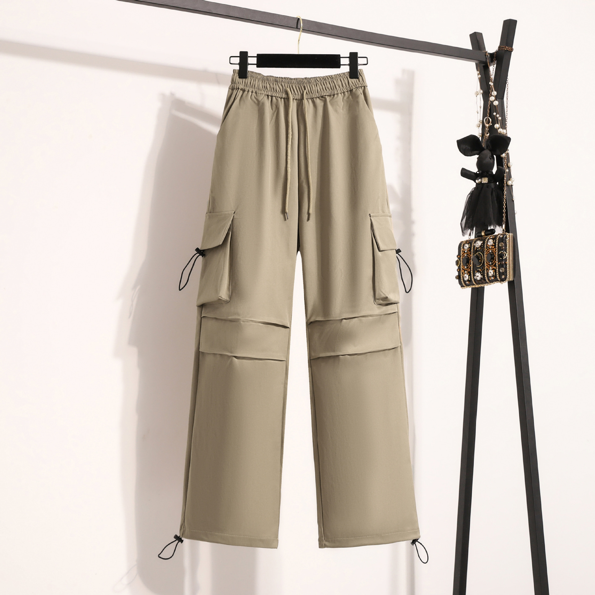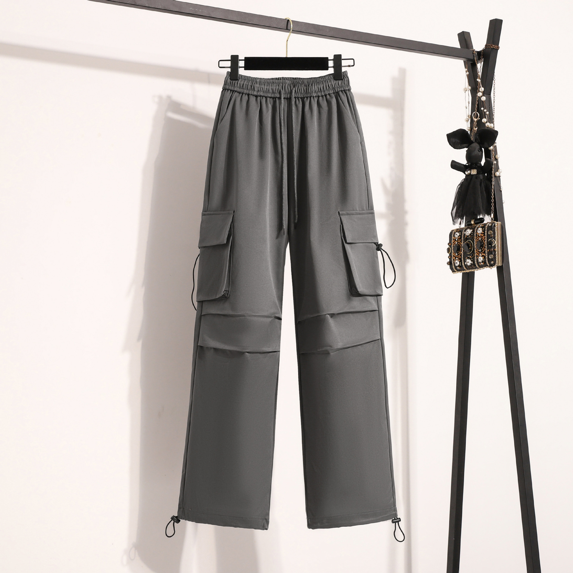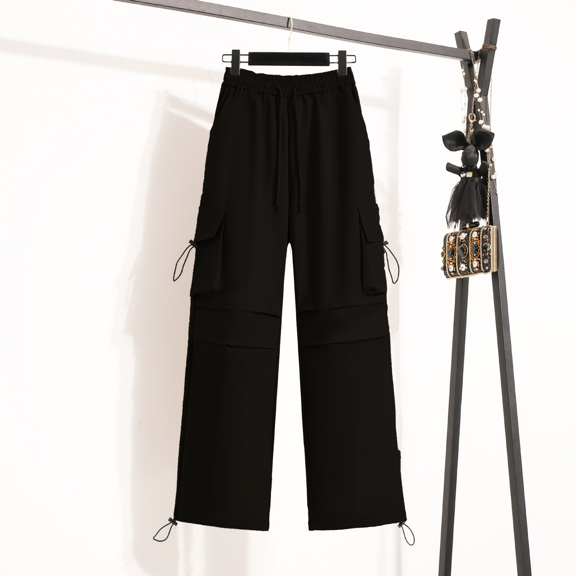 미국식 바지 여성 2025 년 봄과 가을 새로운 탄성 허리 스트레이트 튜브 슬리밍 캐주얼 멀티 백 드로스트링 블랙 팬츠