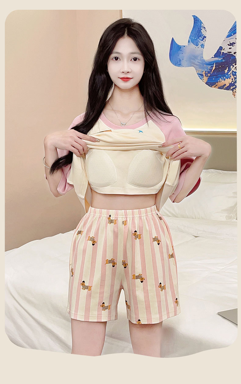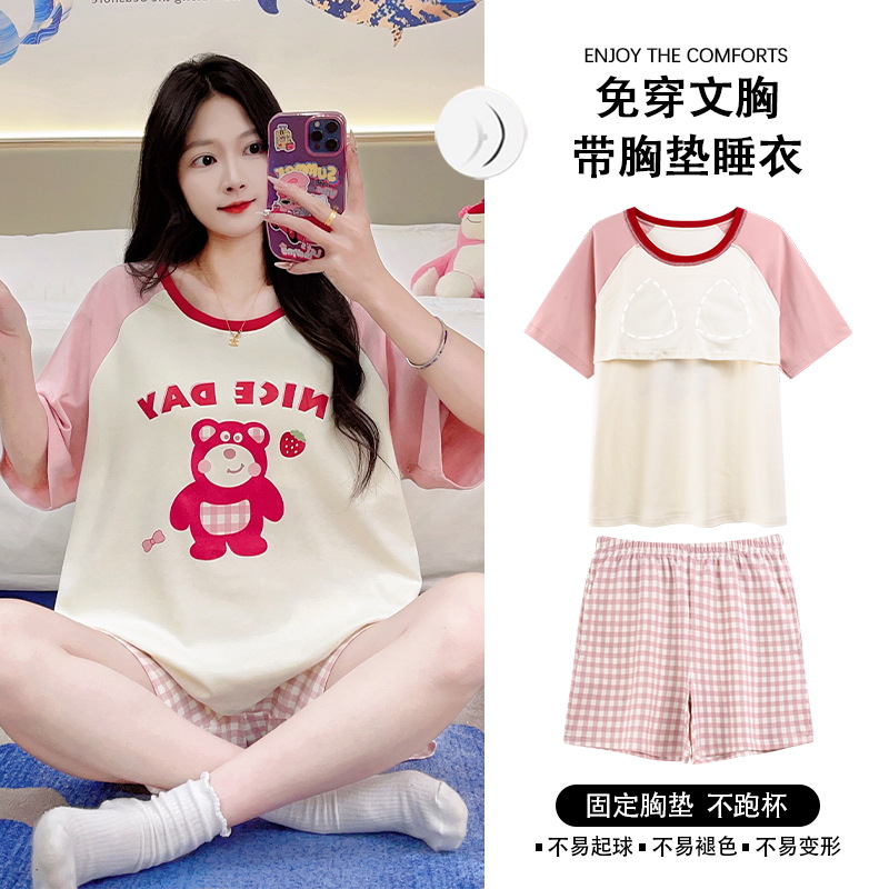 자립형 가슴 패드 잠옷 여성 반소매 브래지어없는 원피스 여름 안티 범프 중학교 학생들의 세트 입고 큰 아이들