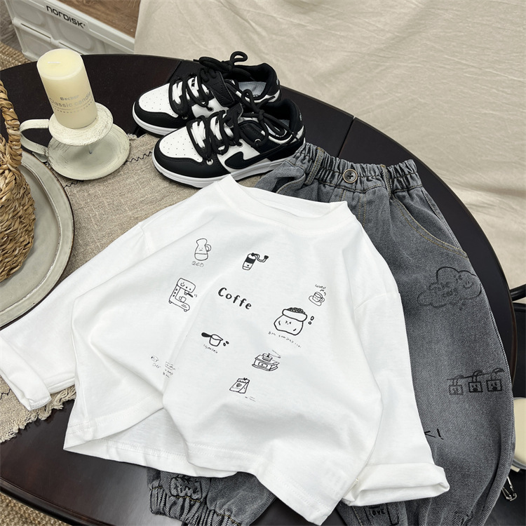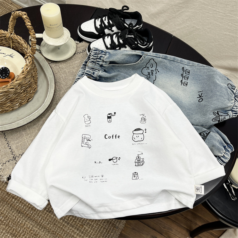 어린이 바닥 셔츠 흰색 2025 가을 새로운 아기 만화 라운드 넥 탑 중소 어린이 한국 스타일 긴팔 티셔츠