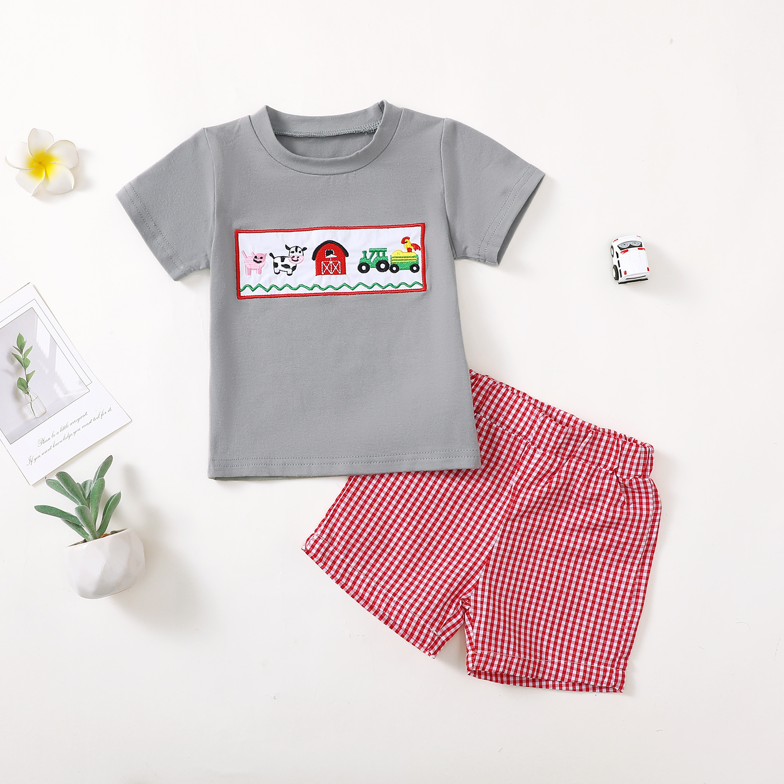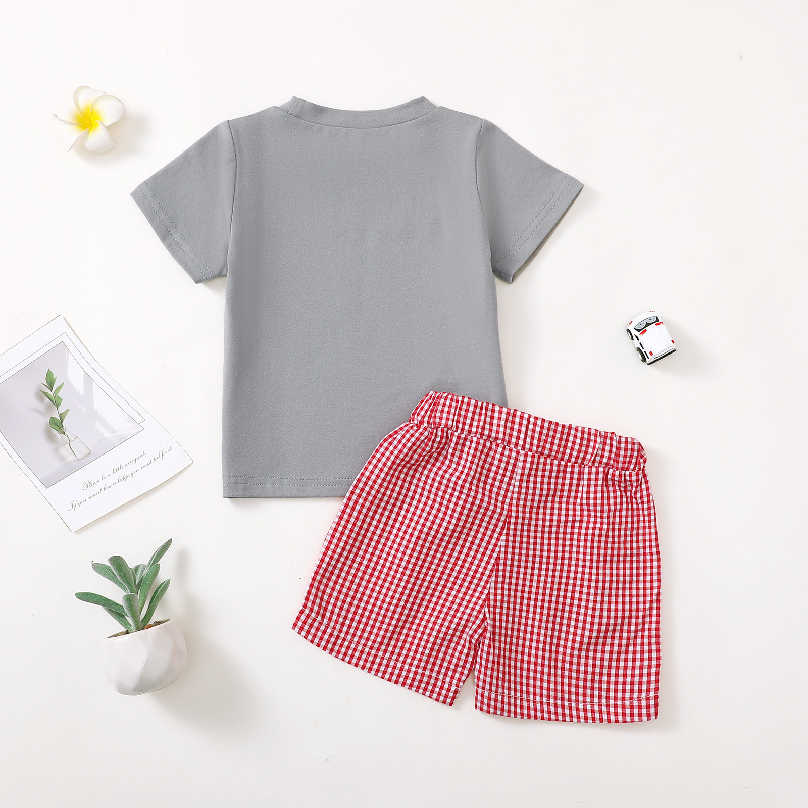E2568 국경 중립 아기 반팔 티셔츠 줄무늬 반바지 세트 귀여운 동물 만화스토어 가기
