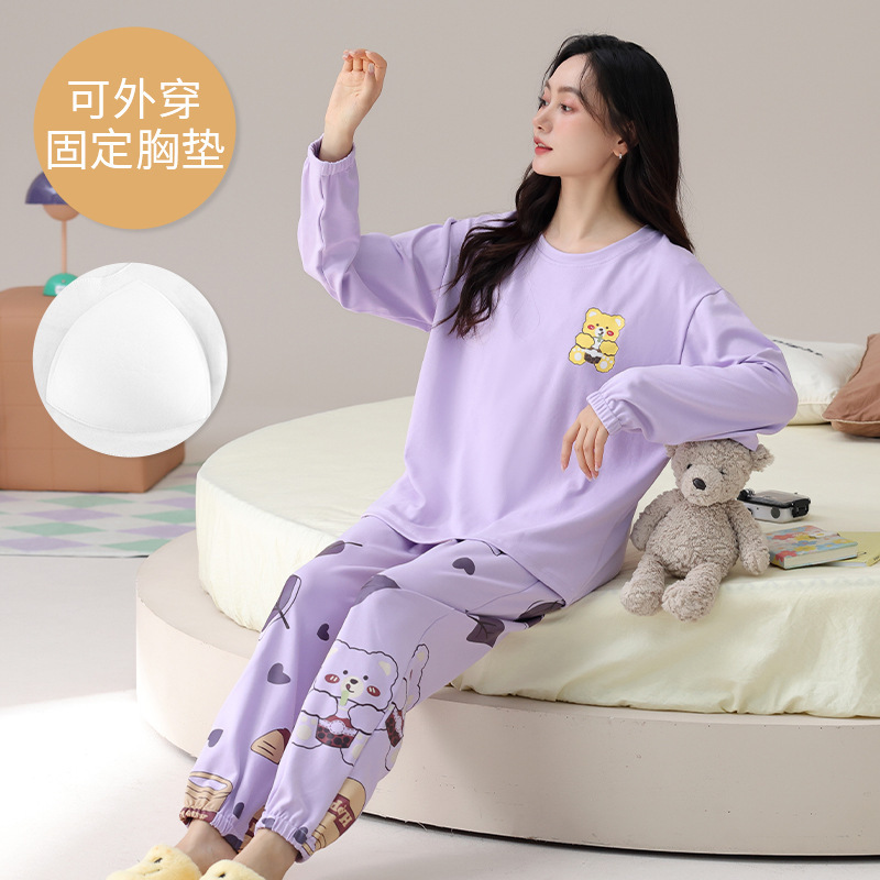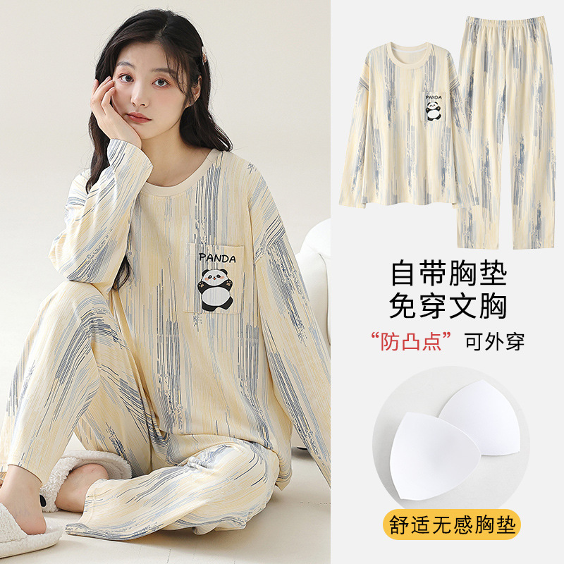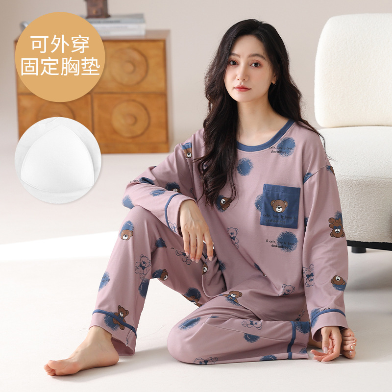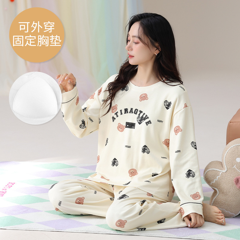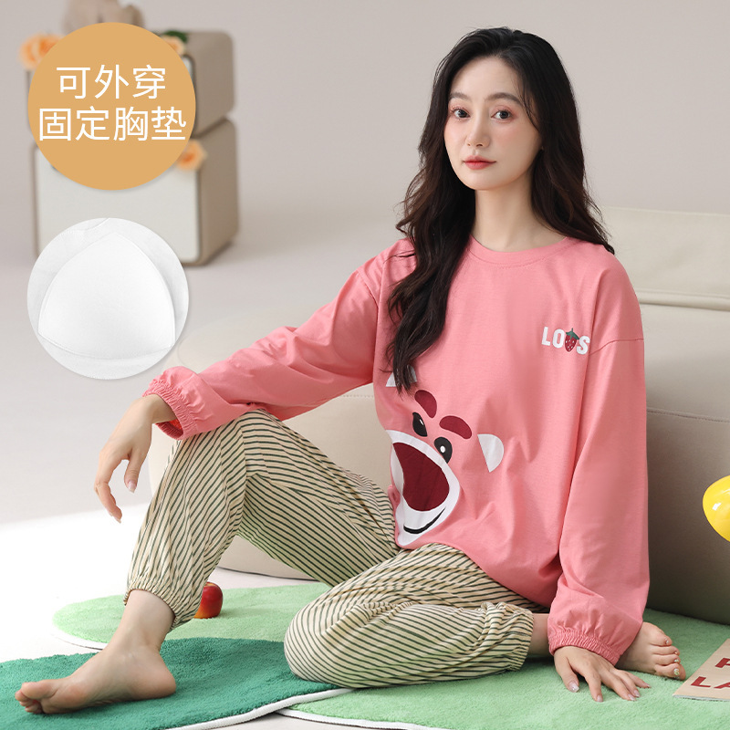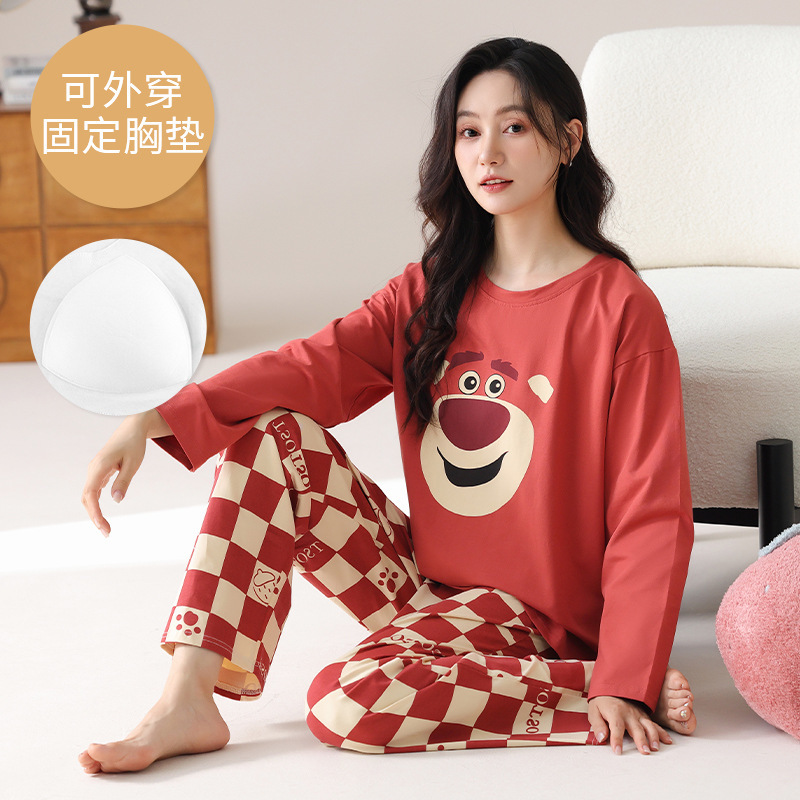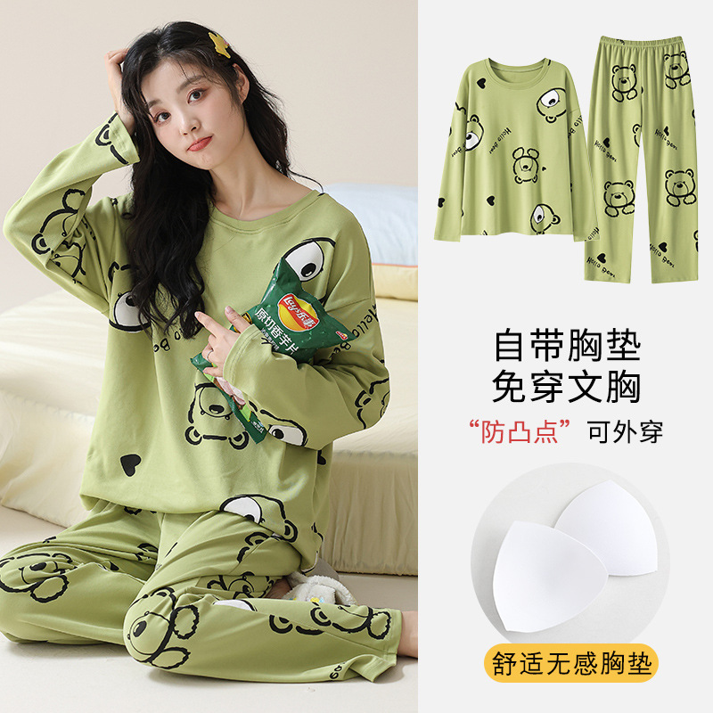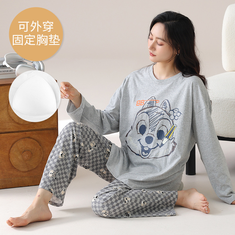 2025 긴 소매 잠옷 여성의 가을 만화 얇은 코튼 홈 옷 봄, 가을, 겨울 세트 입고 가슴 패드 외부